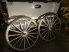 These would have come off an early automobile such as a model T, early oldsmobile, or even an old tractor. Their condition is rough at best, they are incomplete (missing hub cover caps on both wheels), significant patina is present, and the wear they have endured would most likely make them unsafe to use ever again unless you were to put over a thousand dollars into restoration costs. As they sit, similar wheels are selling as decorative pieces for $20-50 a wheel.