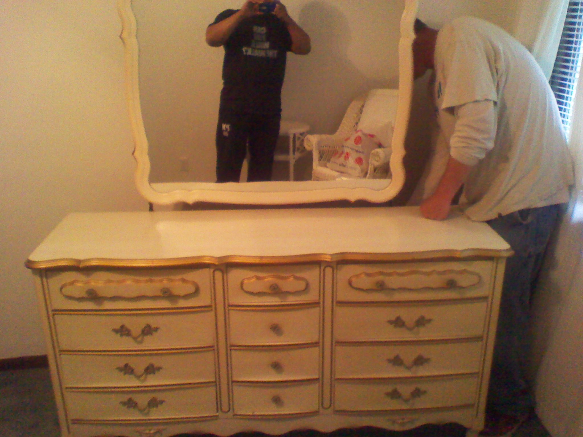 It was my grandmothers abd believe that it is over 50 yrs old. it has 6 large drawers and 6 smaller drawers all outlined in gold trim, the mirror attaches to the back of the dresser also outlined in gold trim.