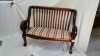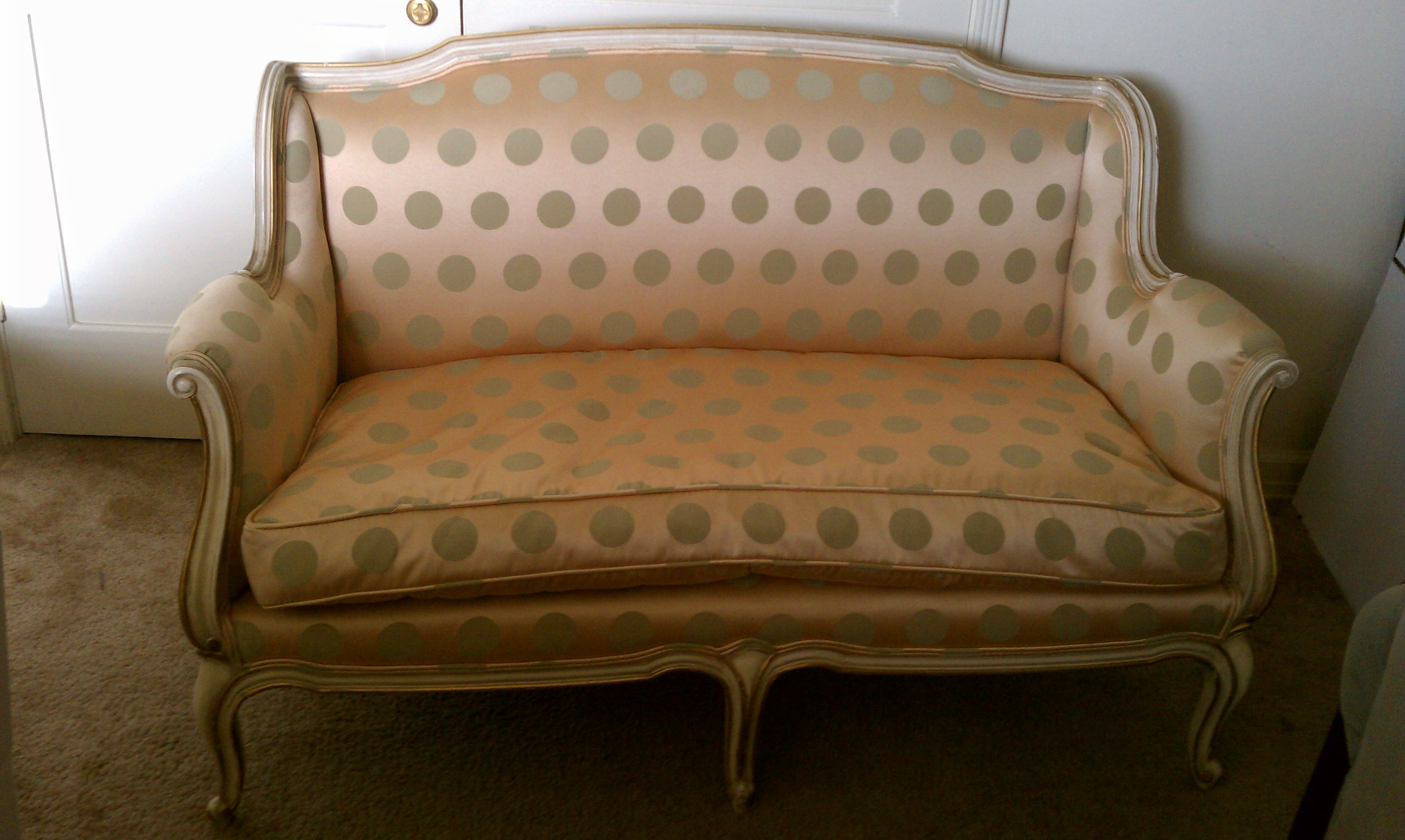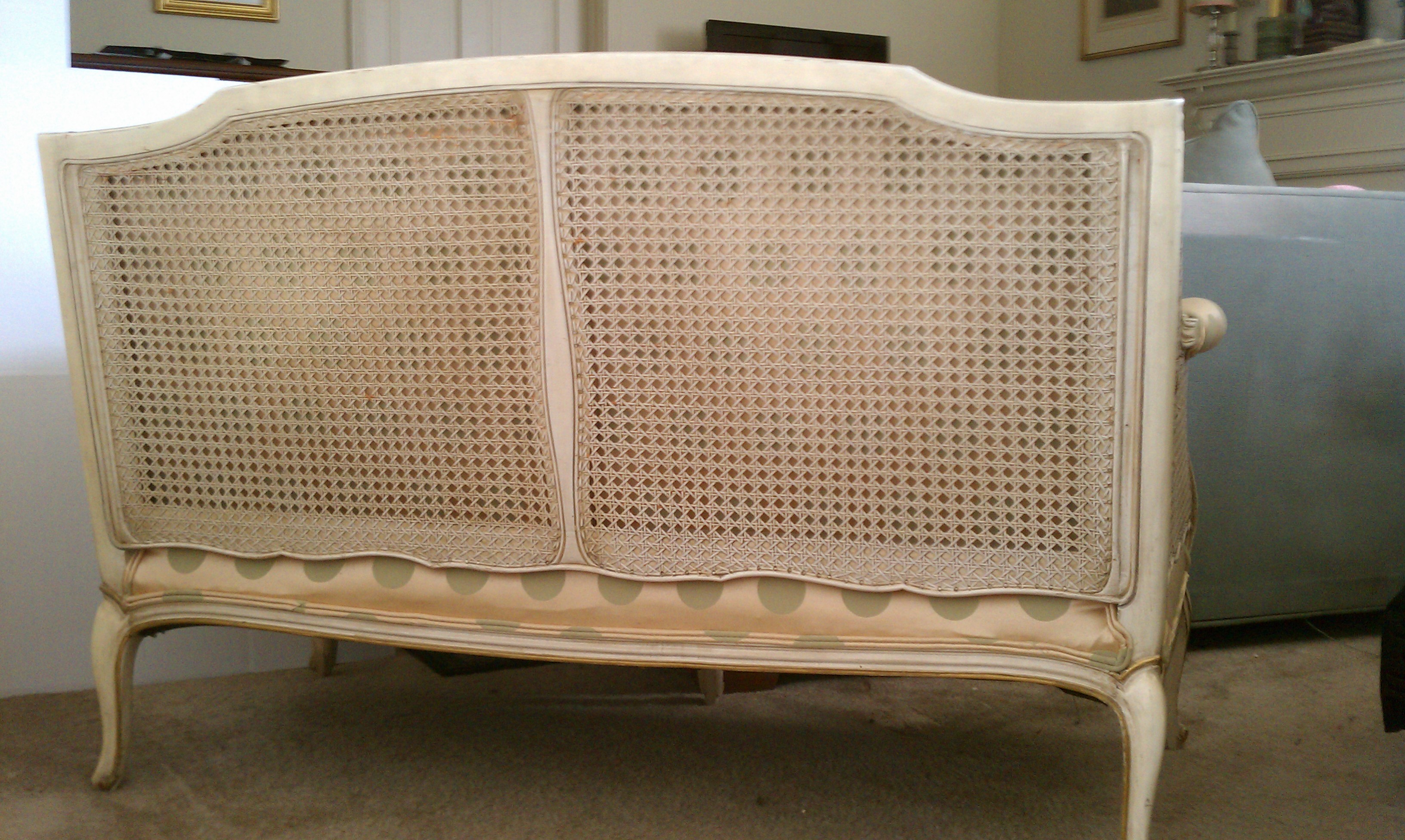 This is a beautiful antique sofa, with a down cushion and wicker backing. It was purchased from an antique store in Pasadena, CA. The store had newly reupholstered the sofa in this gold and green silk fabric. The fabric is in excellent condition since I used it for maybe a week and then covered it and put in storage. The wicker has a few areas where the paints worn off, and the wood also has some signs of wear.