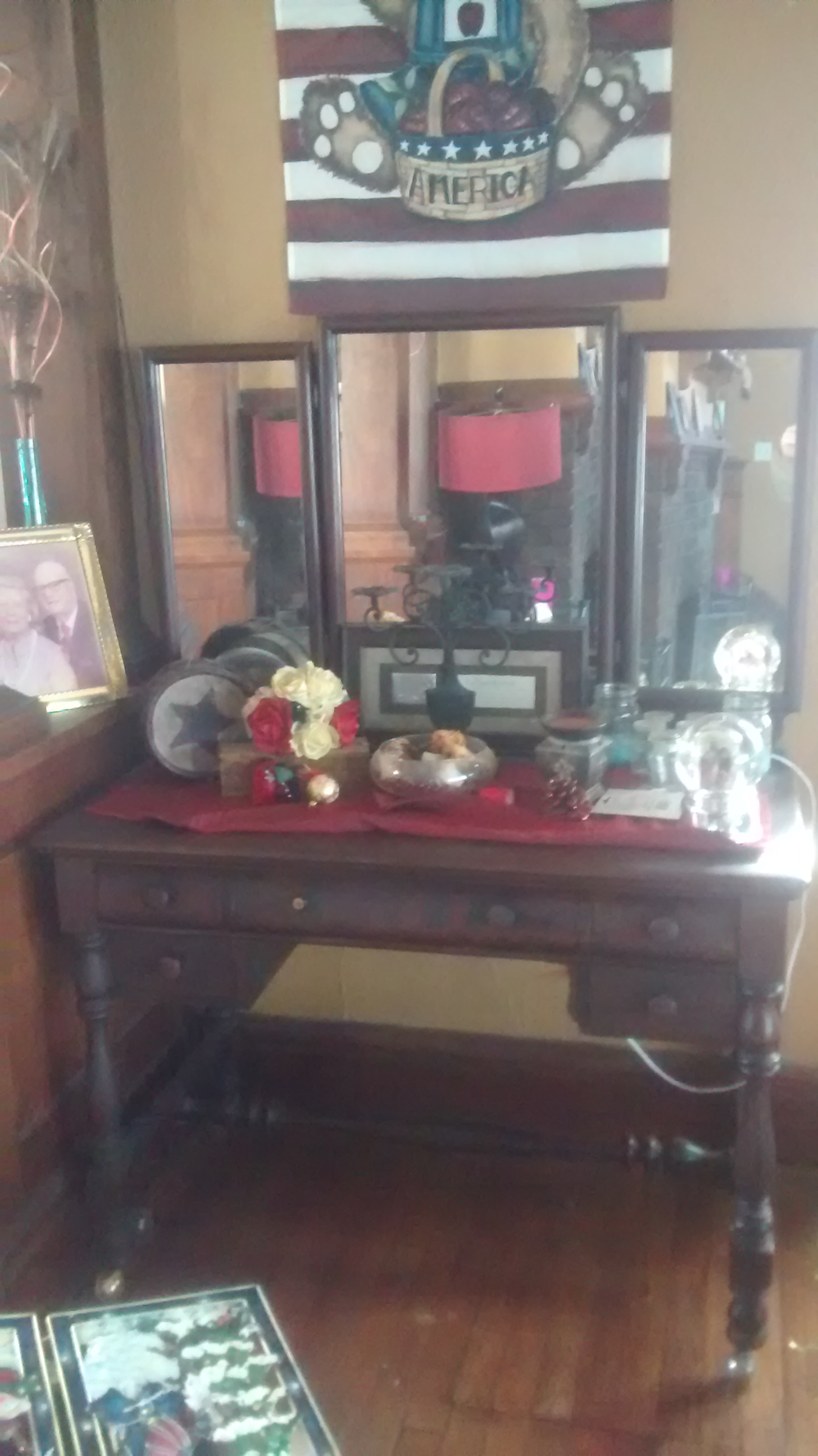 Solid mahogony triple mirror vanity from widdicomb furniture company in grand rapids Michigan. It has one long drawer in middle and two small short drawers on each side excellent condition besides one knob is broken.