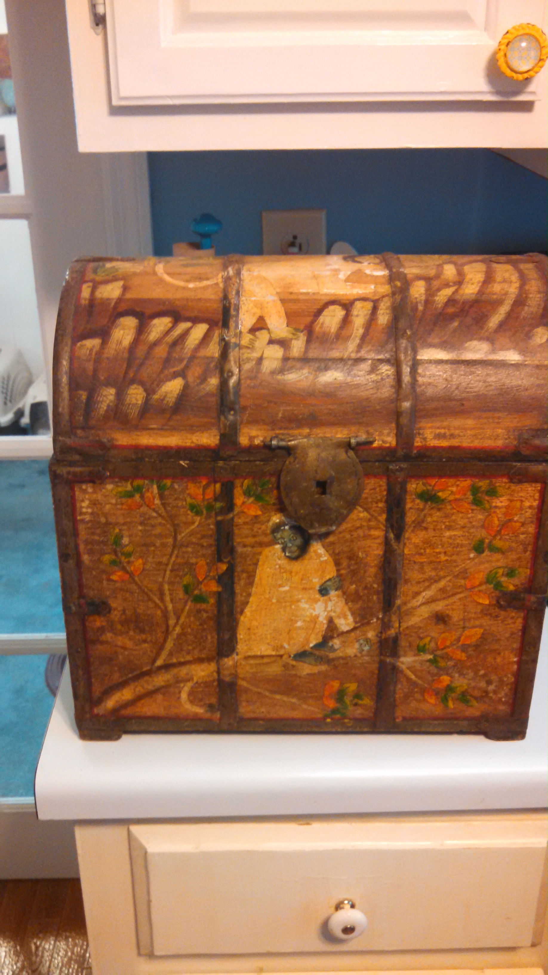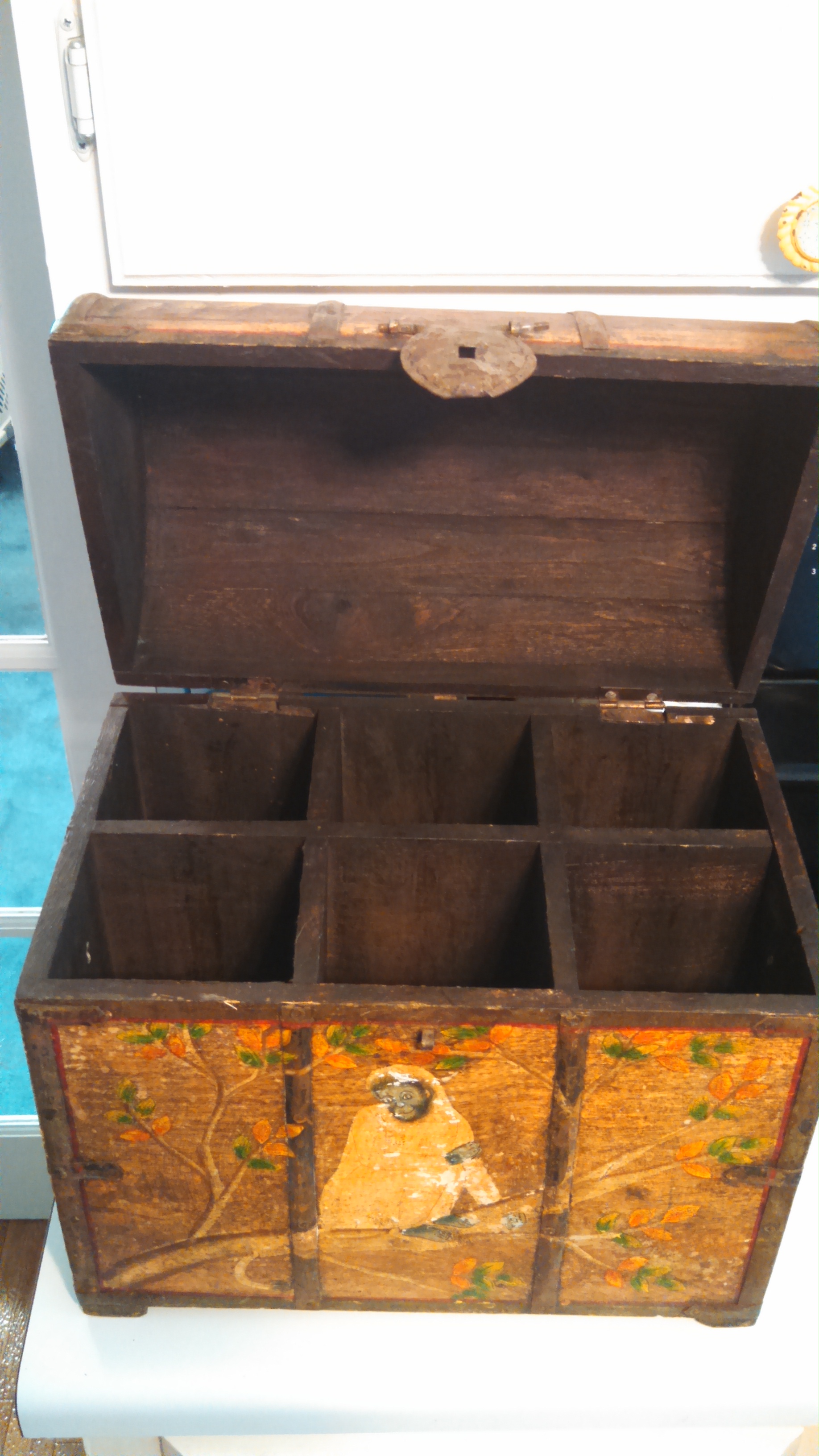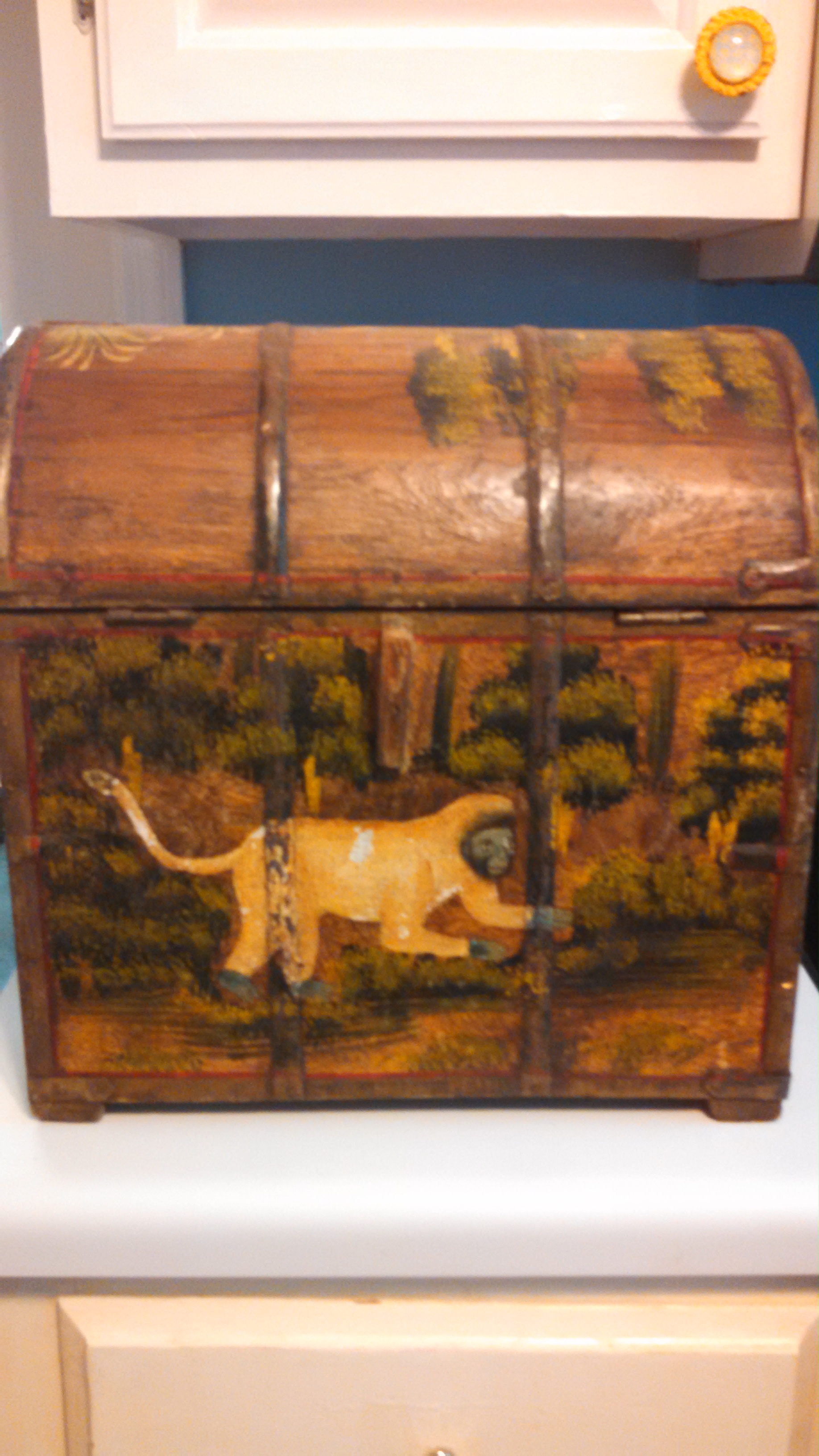 My wife and I found this in a local secondhand store. We paid only $5 for this and feel we got away with a massive steal. It is solid wood and the dimensions are about 14 1/8" H, 14 1/8" L, and 9 1/8" W. With some of the light peelings visible on the top, it appears that the images were painted directly on and then lacquered over. If anyone has any information on this item, we would greatly appreciated. Thank you in advance.