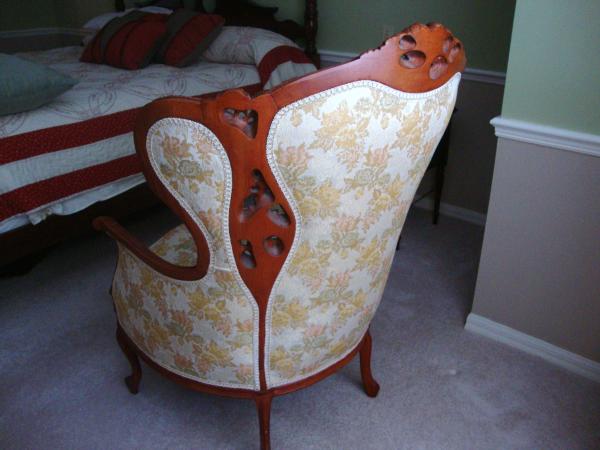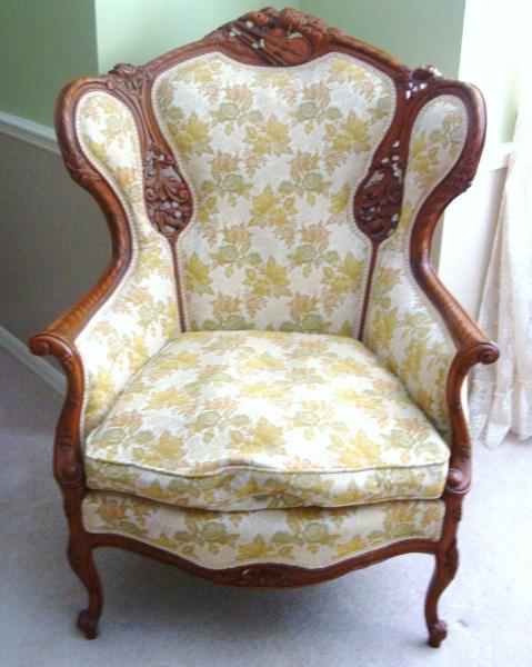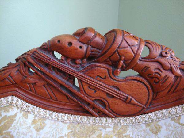 Antique wing chair with wood trim. Pale yellow brocade upholstery. Musical instruments depicted in decorative wood trim.