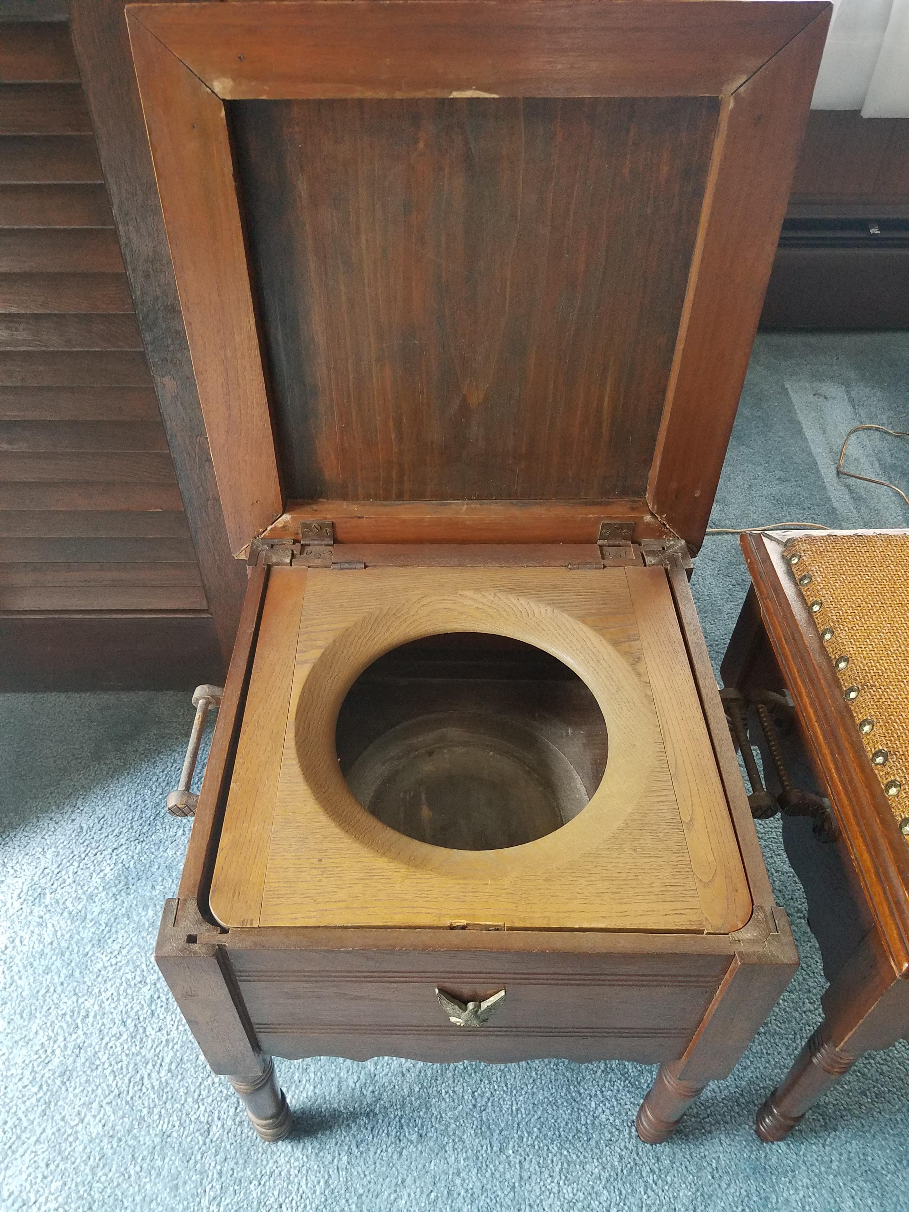 Antique wood box shoe shine footstool and Antique chamber pot and wooden base footstool