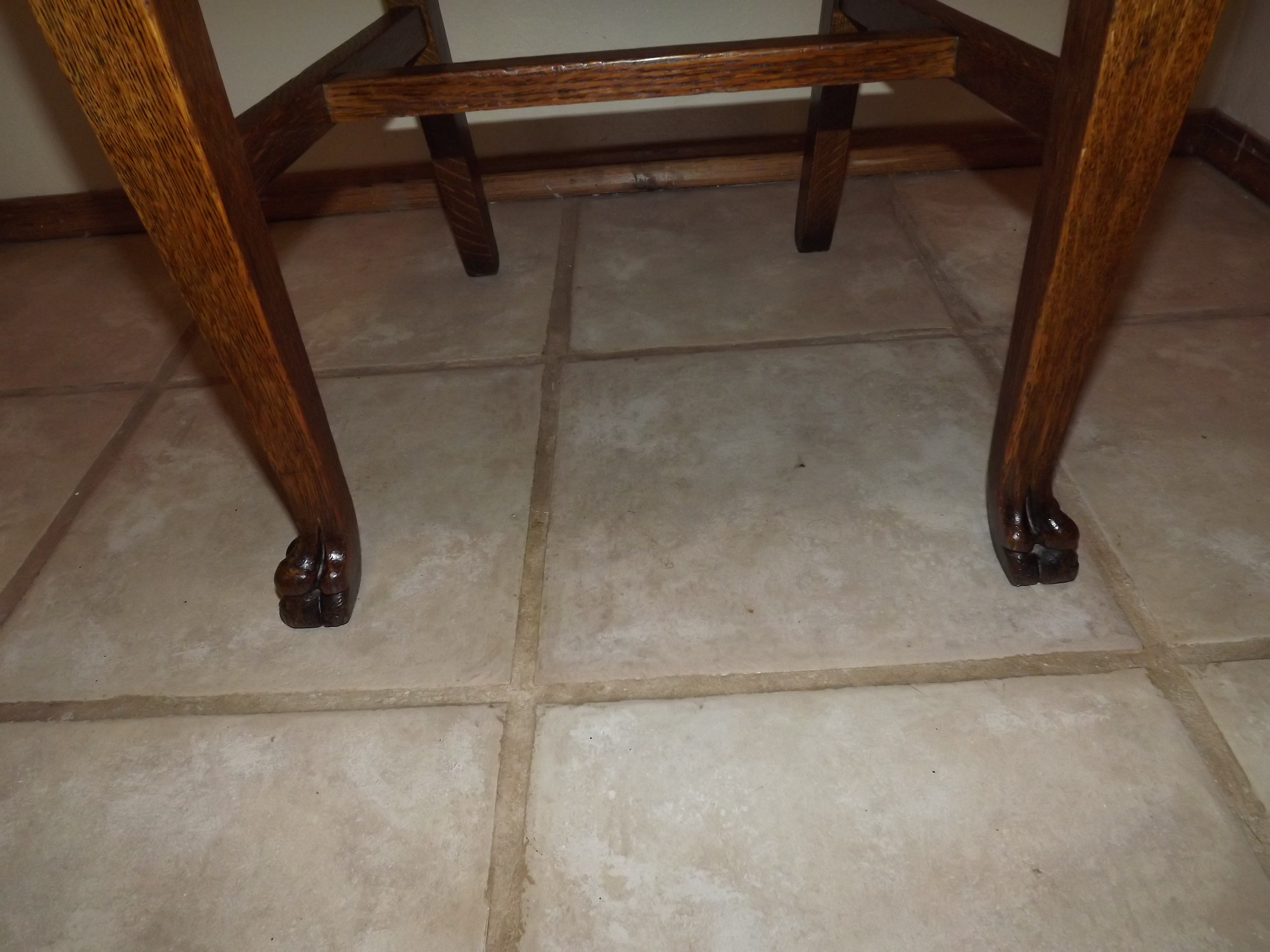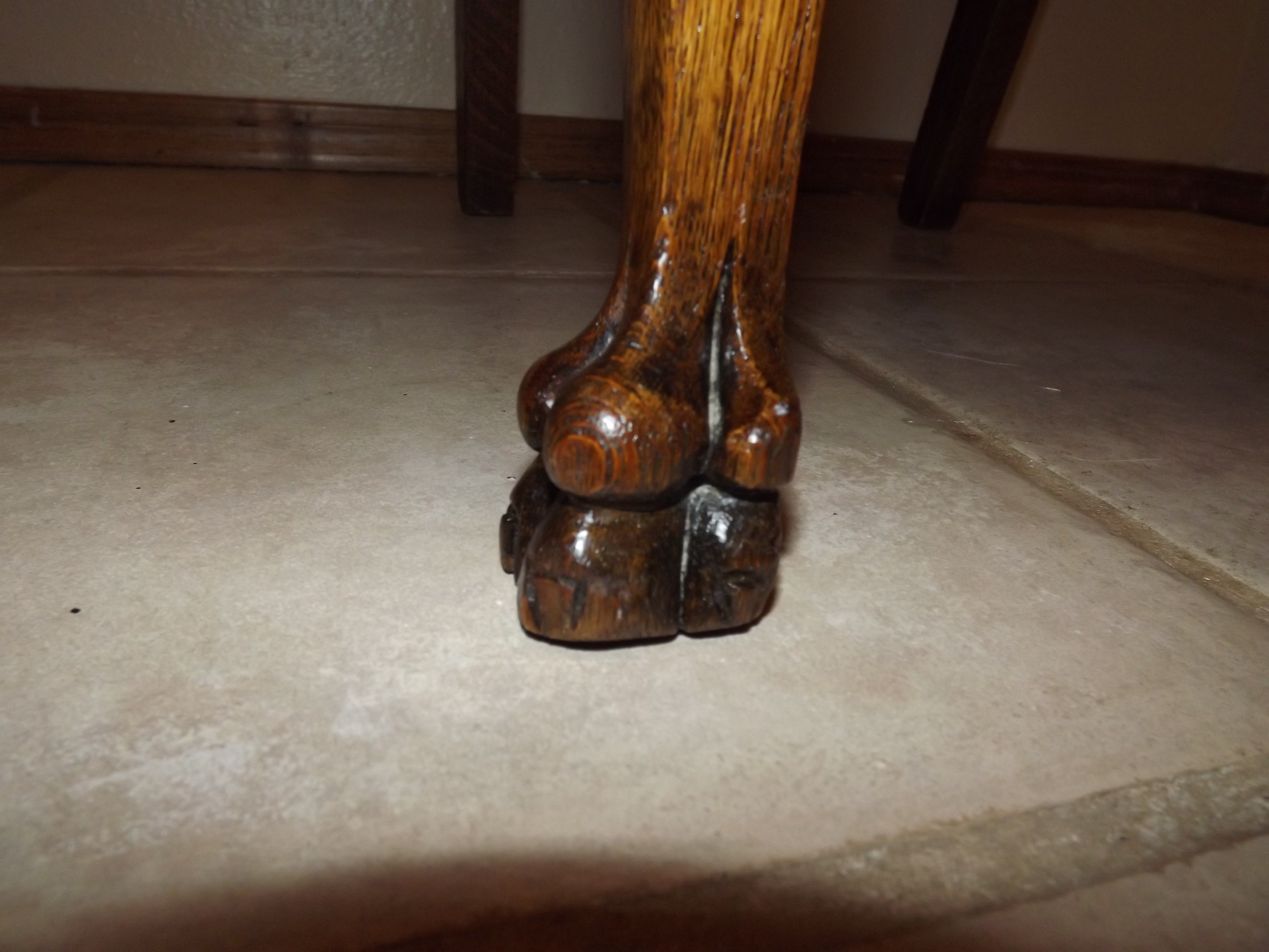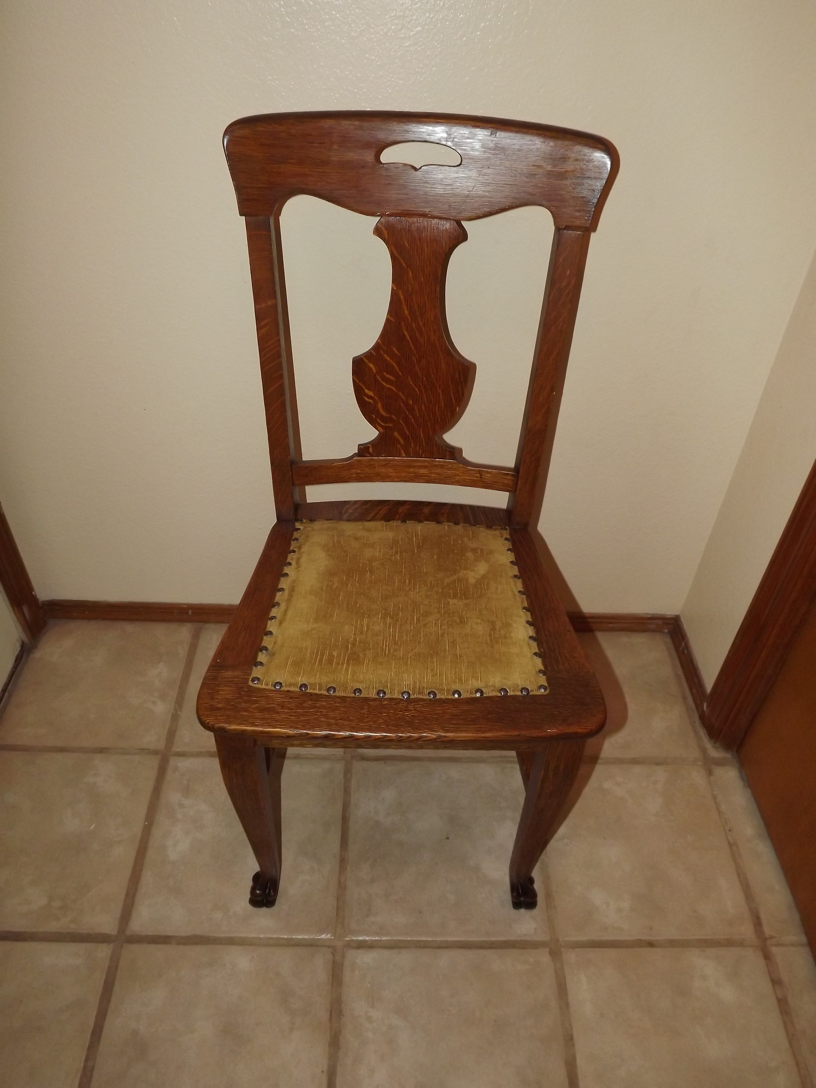 My Craigslist find: a chair made by Michigan Chair Company, according the label on the underside of it. The wood is either walnut or oak with a walnut stain. There's gold velvet on the seat, with burlap visible underneath. The back feet are plain, the two front legs have claw feet.