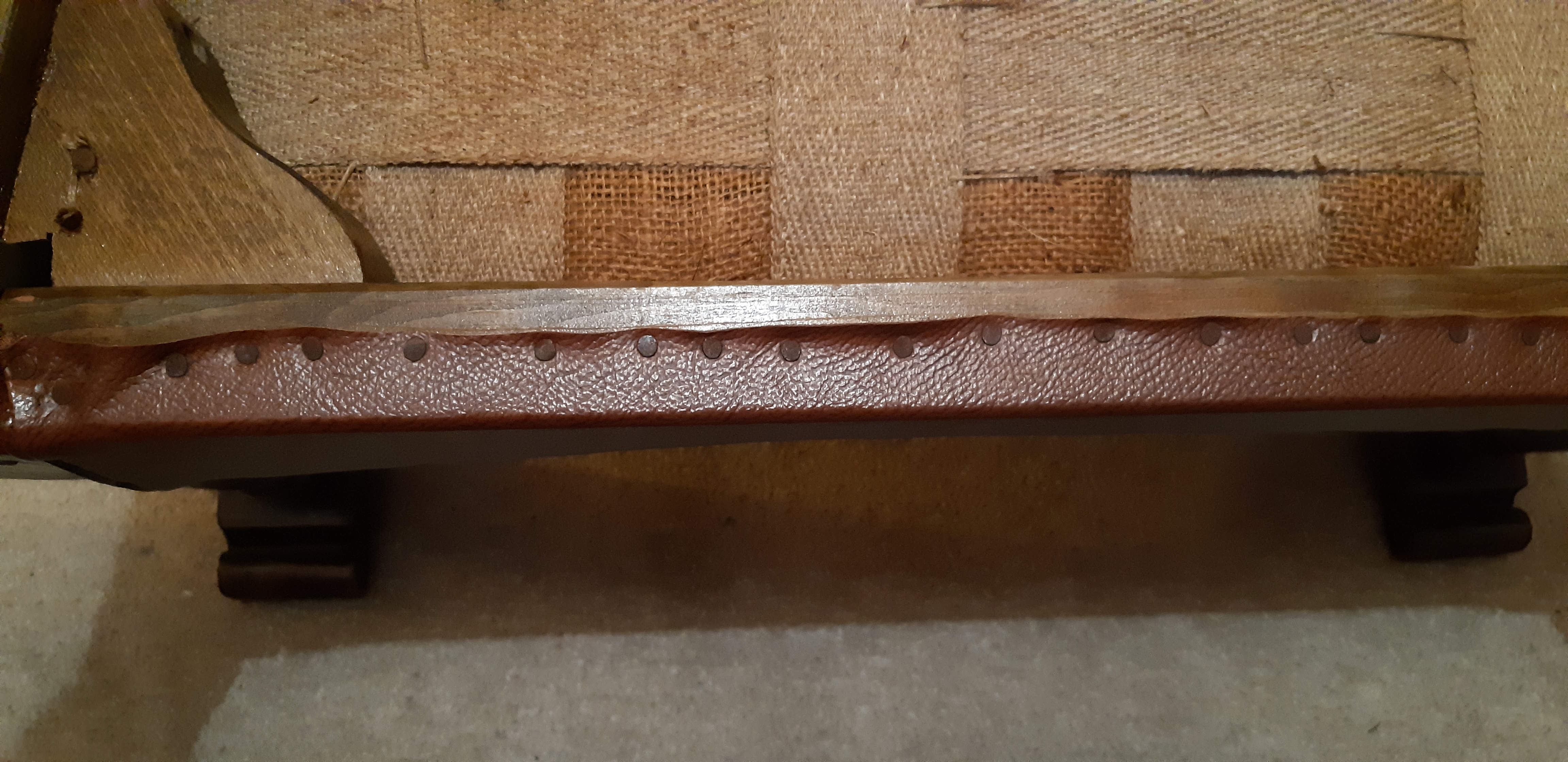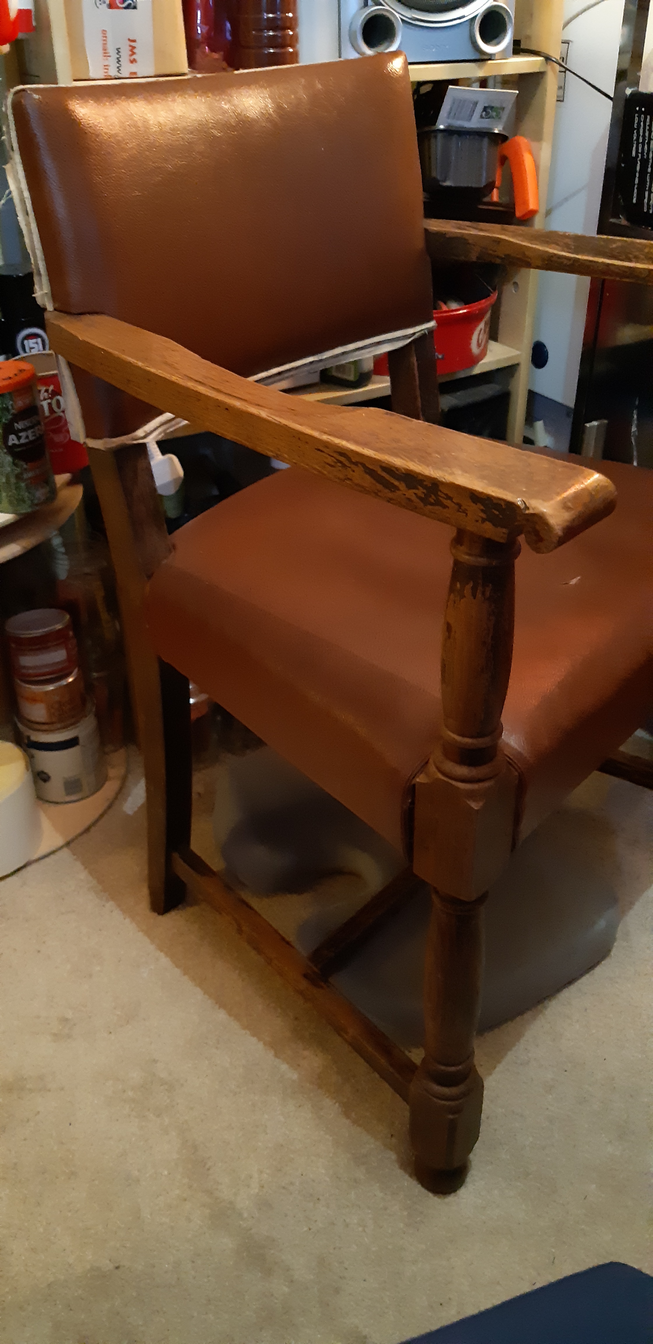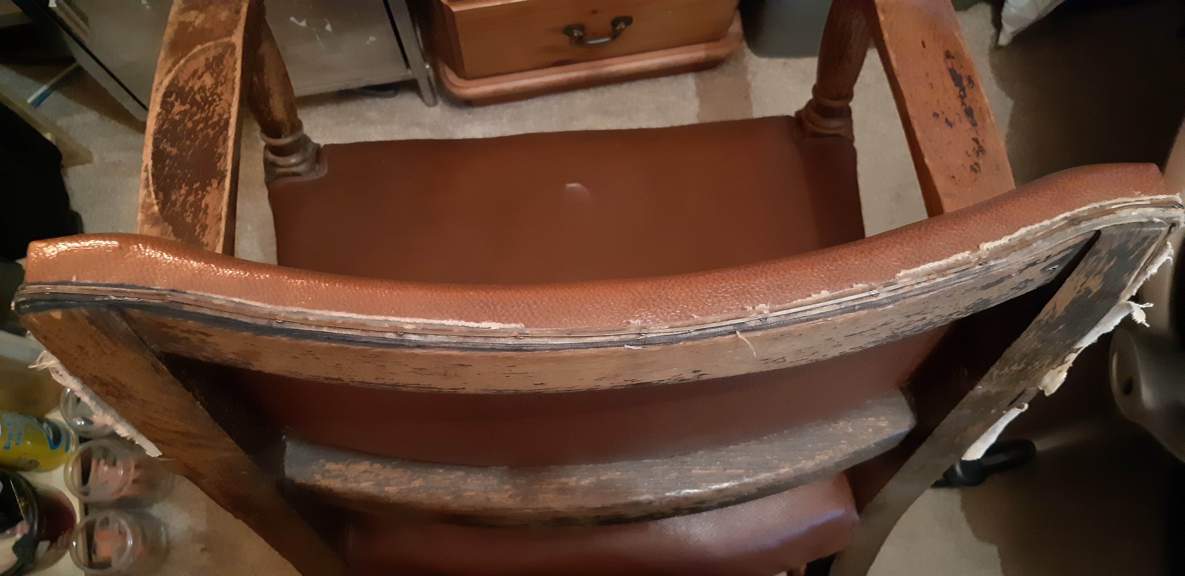 Here is the 2nd chair I have for anyone to evaluate. Again I know nothing about it and I just love the look. Most of the chair seams to be held together by wooden pins and blocks and there are metal tacks holding the leather seat cover in place, also what looks like old screws in all four of the seat corners. The seat itself looks like it is filled with maybe horse hair (see photo). Again can anyone enlighten me on the age, style worth. Many Thanks
