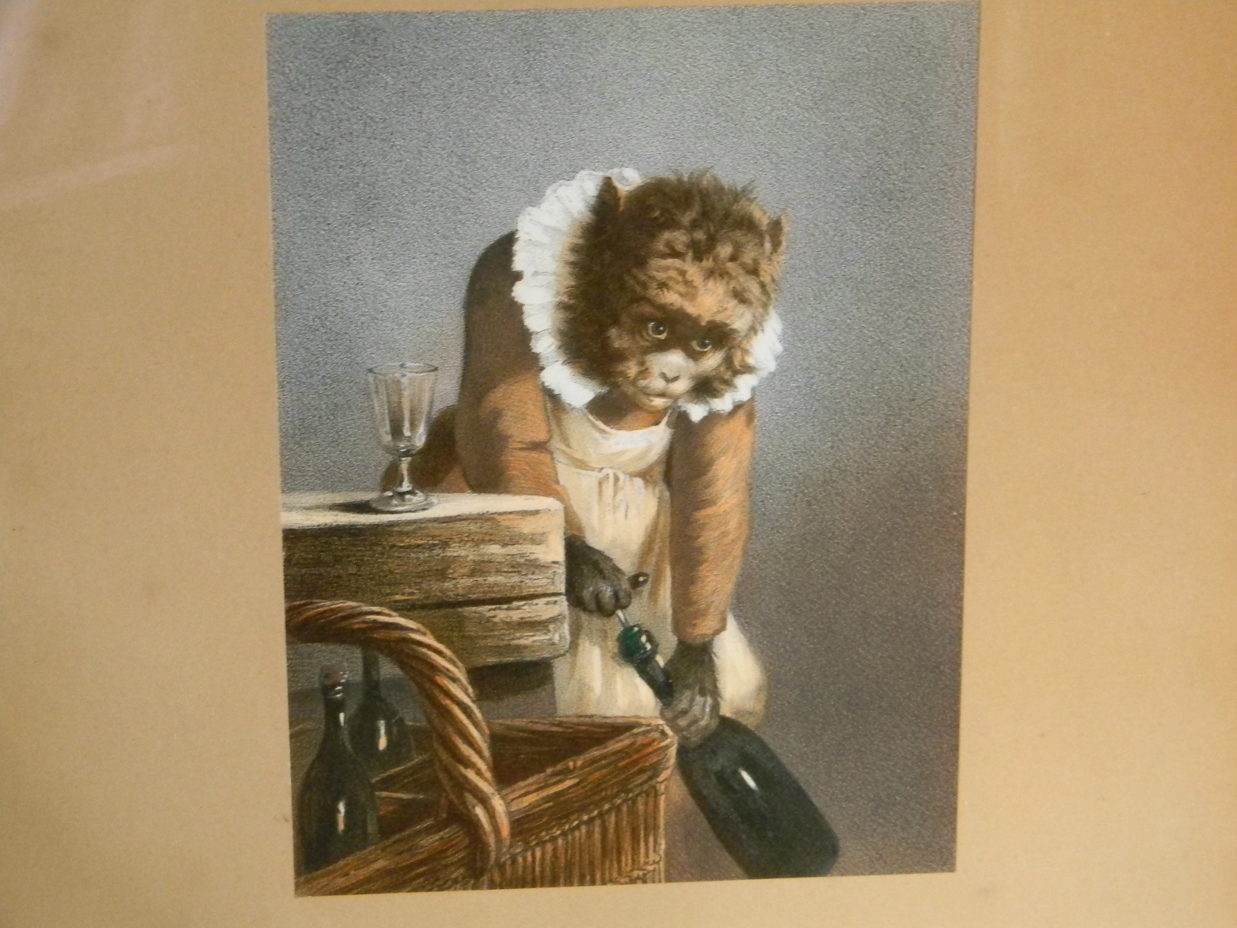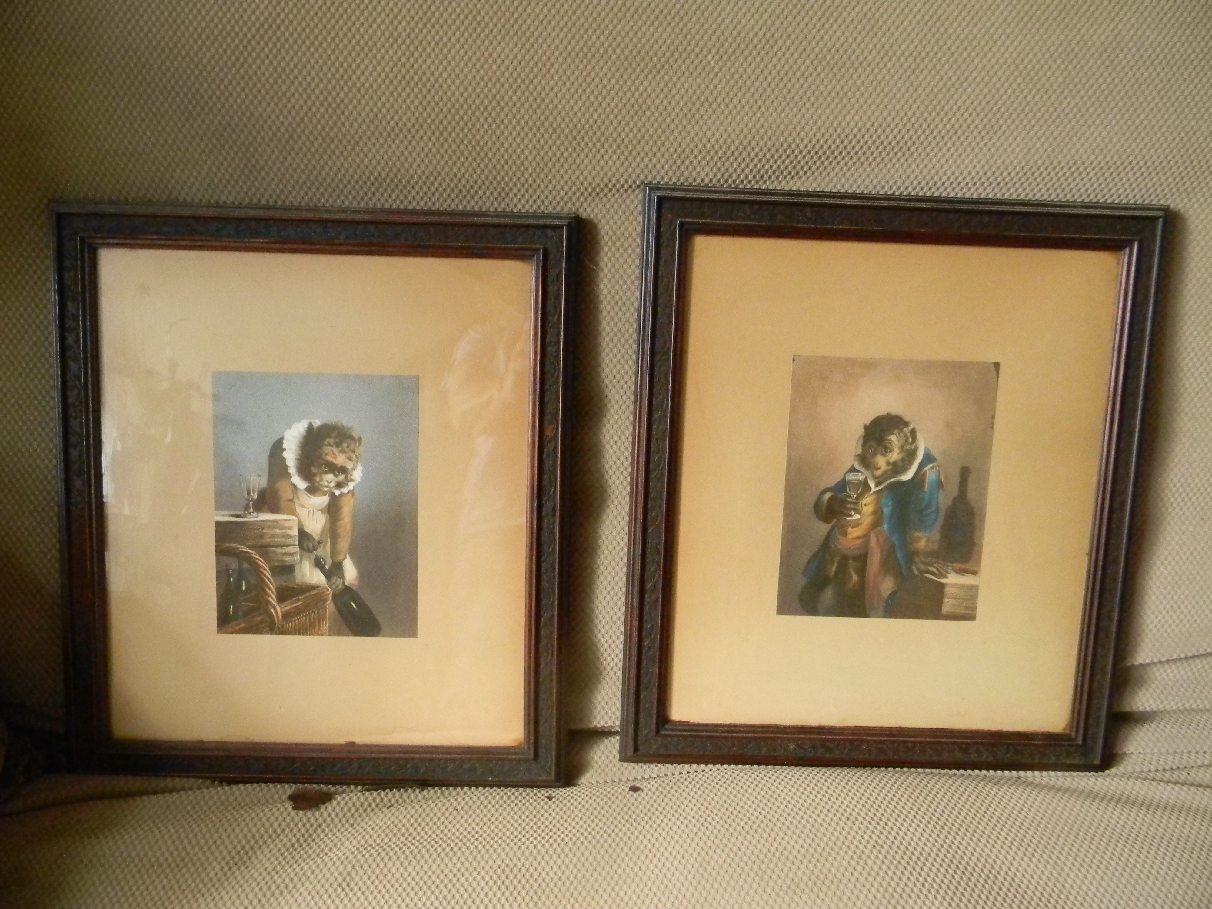 Decorative wood framed, wood mounted prints of dressed and drinking monkeys. They have been in my family for at least two previous generations. No identifying signatures or marks.