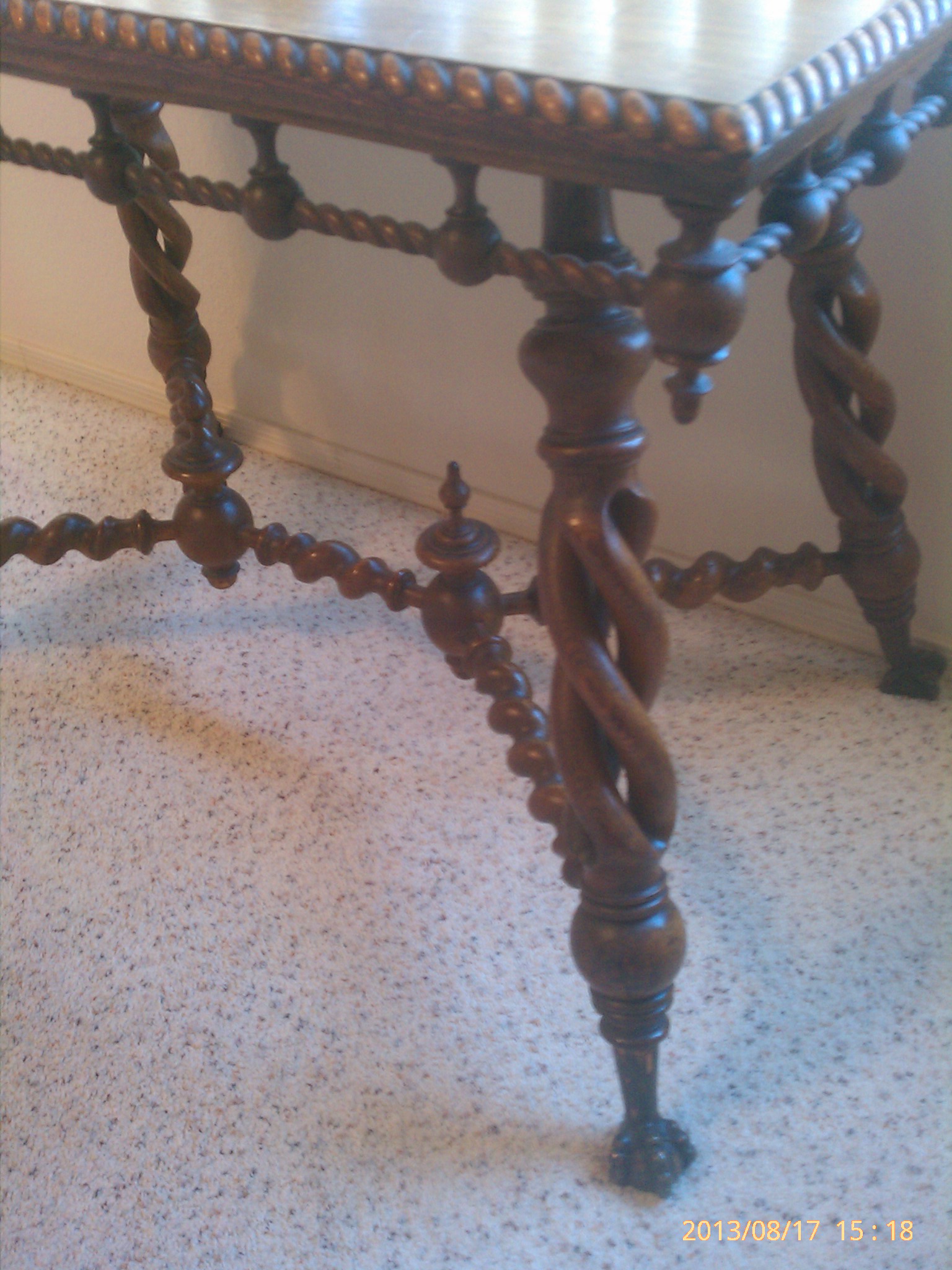 Rope edge molding, triple helix carved legs, metal claw over wood ball feet.