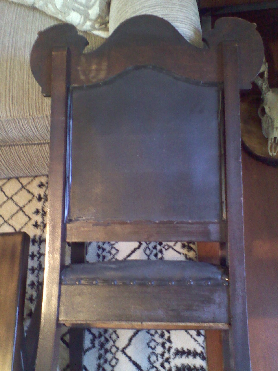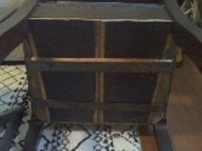 The seat has been braced and reinforced underneath at some point. But the hardware used for that looks many decades old itself. I assume any markings or tags would be under this added bracing but I am weary about taking it apart. The black leather on the seat is worn and faded from years of sliding in and out of the chair. The rope inside the edge of the leather cushion appears to be a twine-like material, visible in a worn out spot on the chairs edge. I am not postiive but I think the seat cushion has been redone, albeit years ago, and the back portion in my opinion appears original. All the fabric/leather is tacked in. The chair weighs roughly 30-35 lbs.
