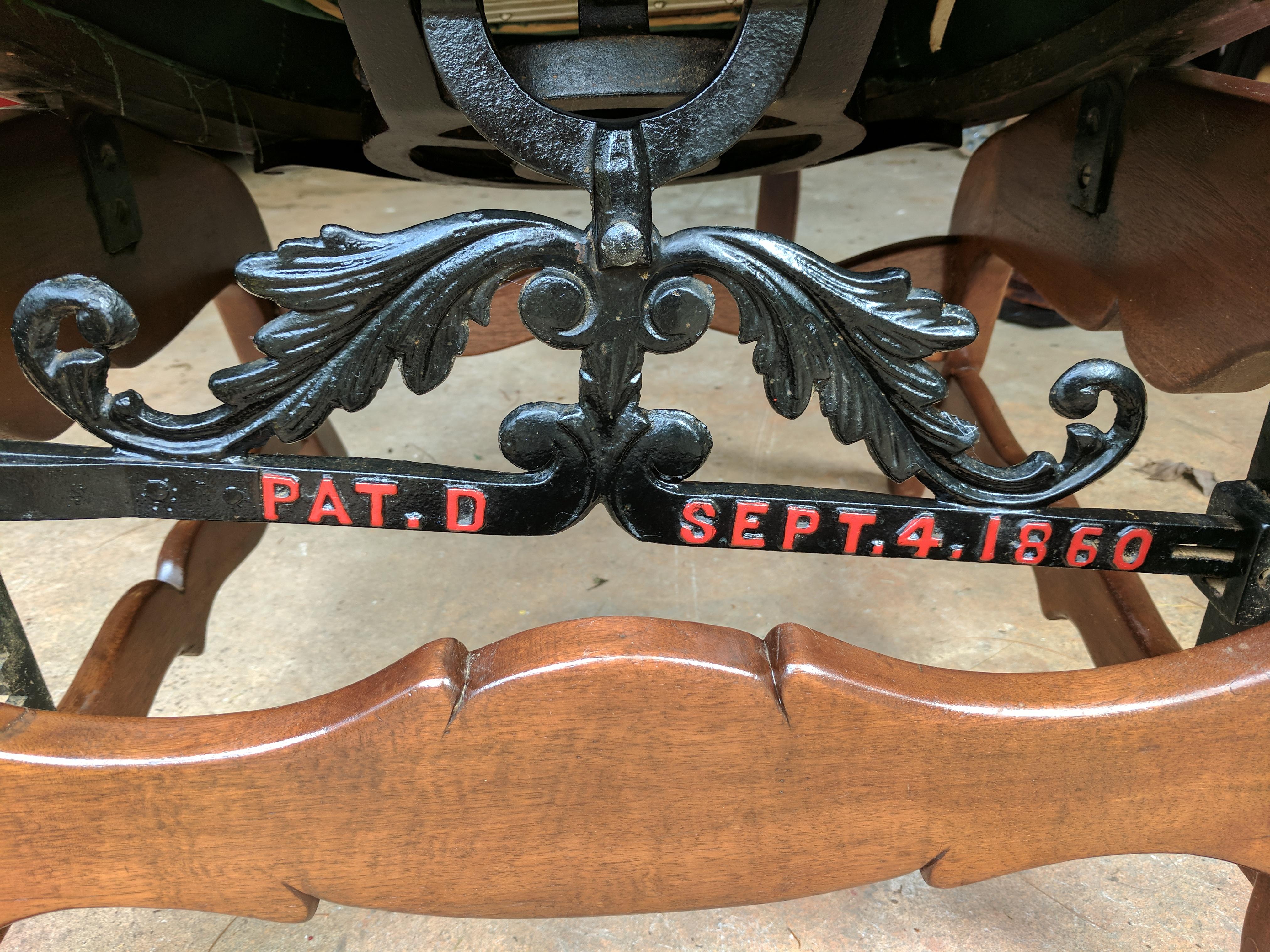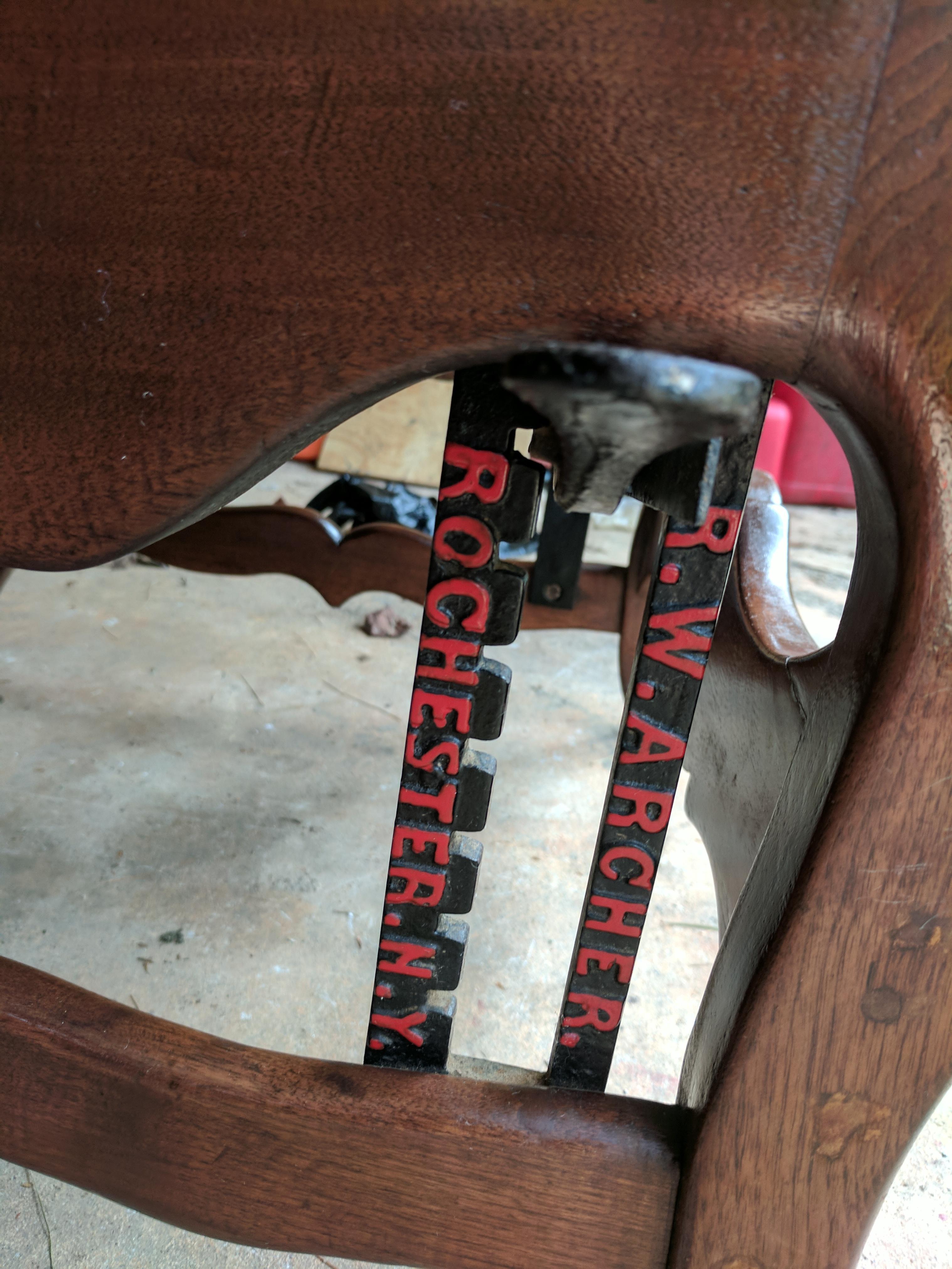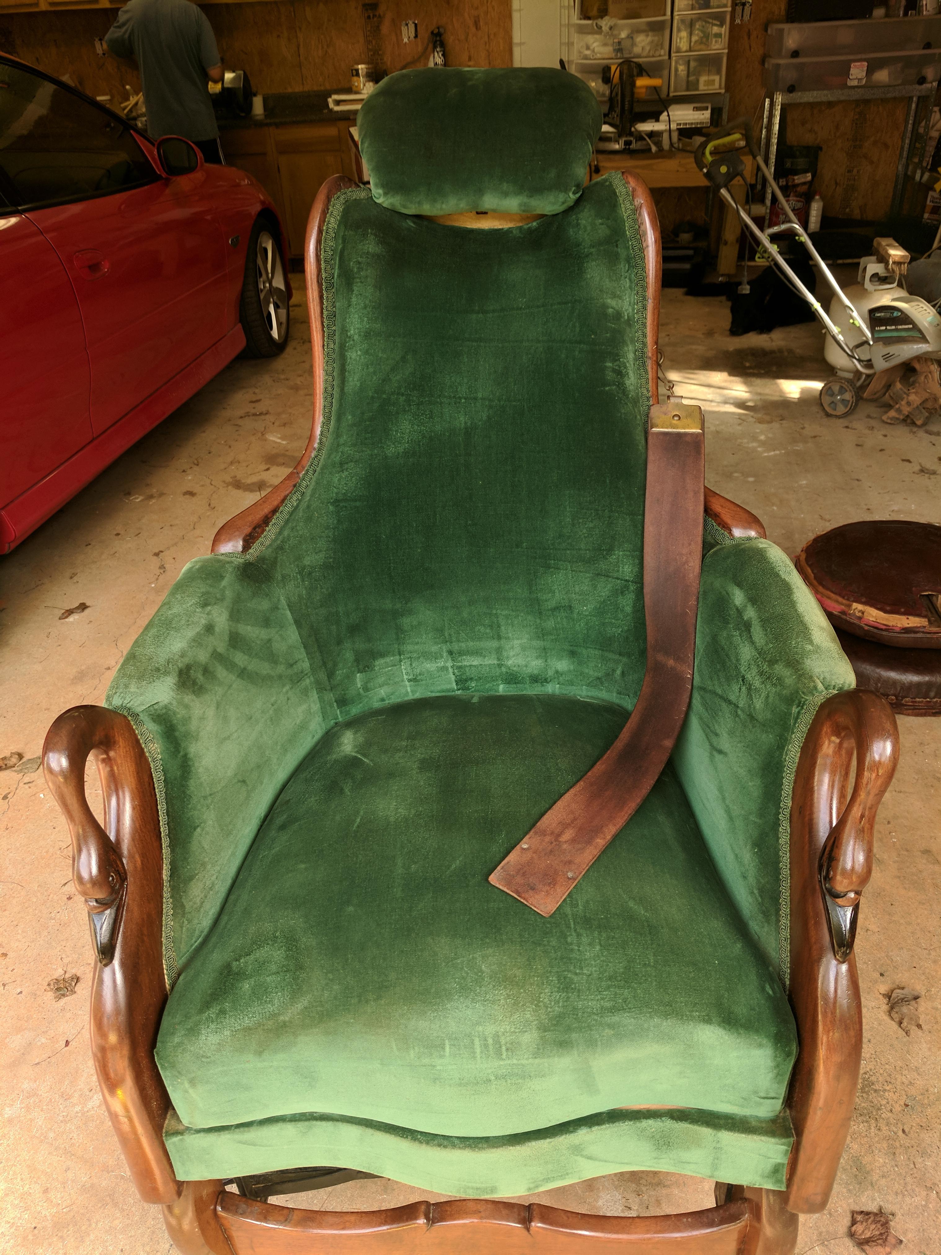 I received this chair from my late brother and can not find anything about this type of chair. It is wood with carved duck heads on the arm rests. The tilting mechinism works great and the green velvet is in great shape considering the age. on the front of the cast iron tilting mechinism it reads Pat.D. Sept. 4. 1860 and on the side if the mechinism it reads R.W. Archer Rochester N.Y. It has the leather razor strap attached. On the leater razor strap in reads Genuine Russian and has a crest.