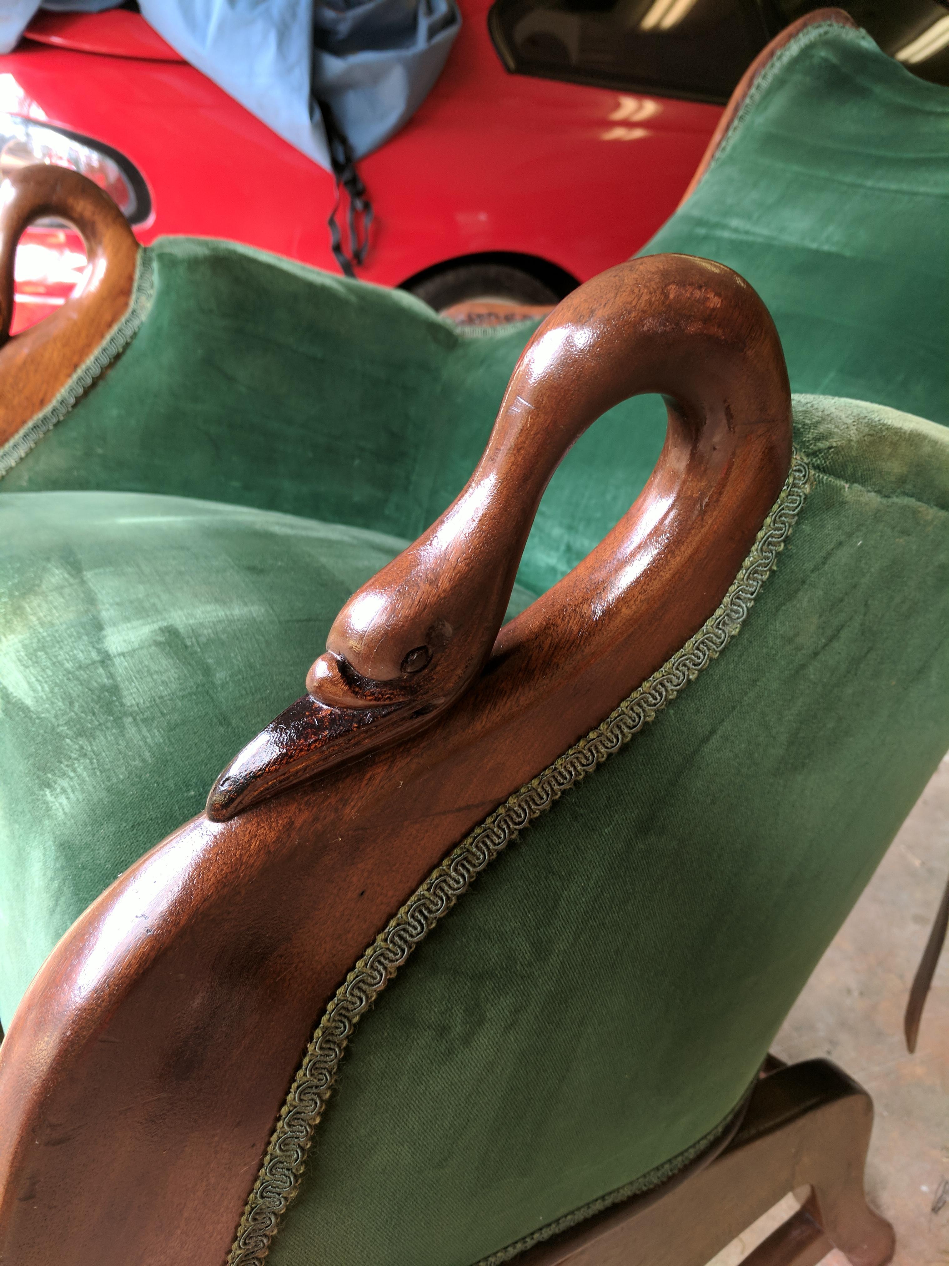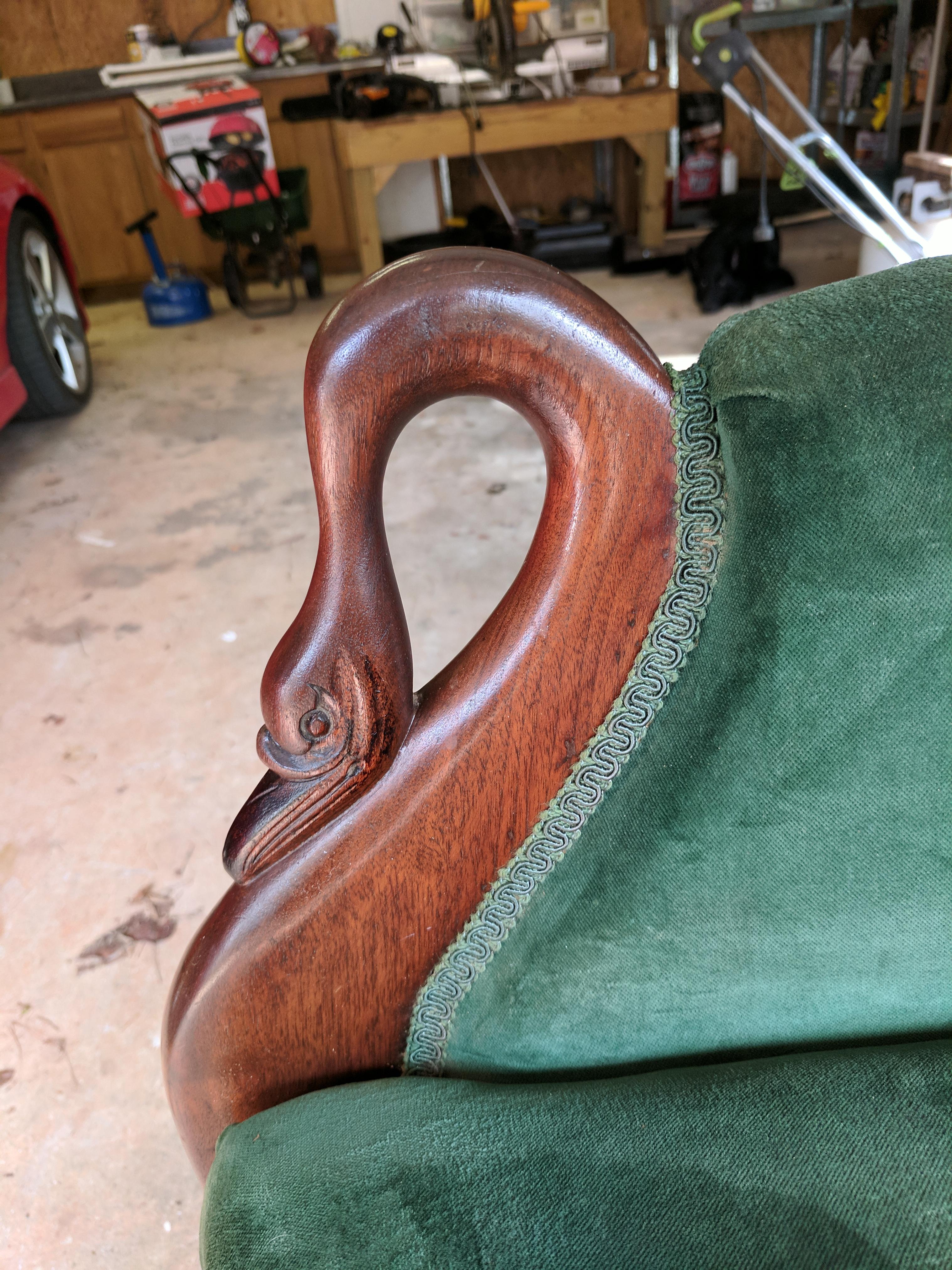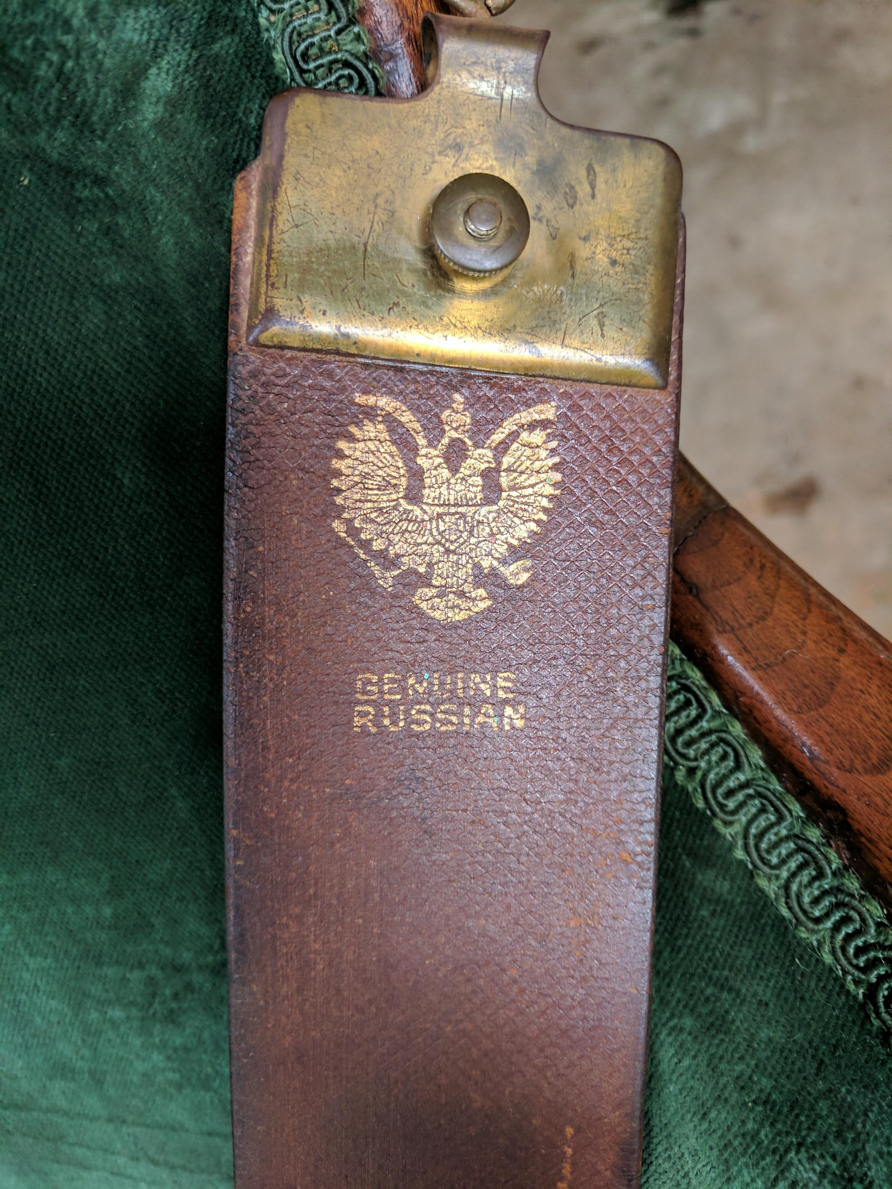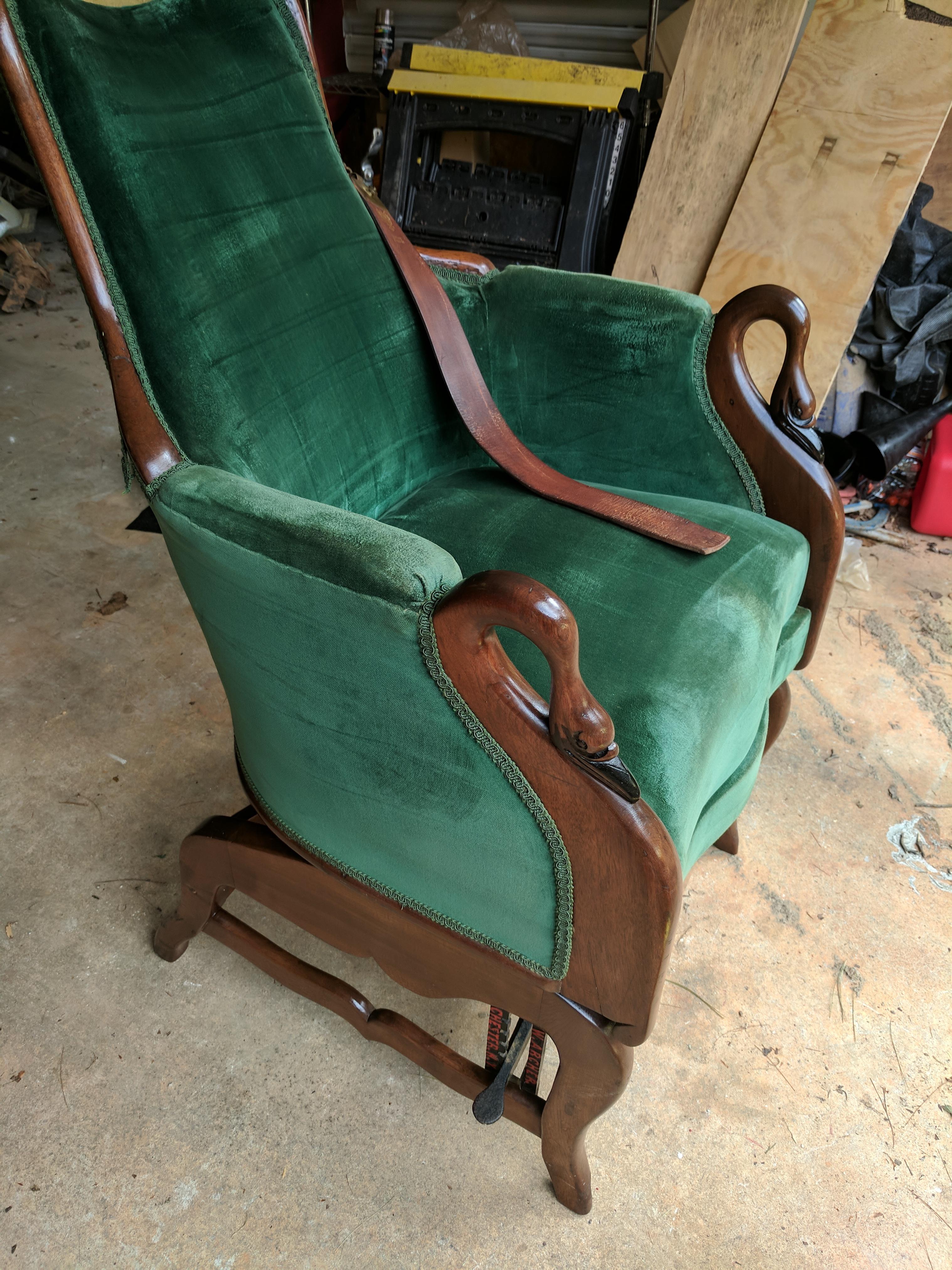 I received this chair from my late brother and can not find anything about this type of chair. It is wood with carved duck heads on the arm rests. The tilting mechinism works great and the green velvet is in great shape considering the age. on the front of the cast iron tilting mechinism it reads Pat.D. Sept. 4. 1860 and on the side if the mechinism it reads R.W. Archer Rochester N.Y. It has the leather razor strap attached. On the leater razor strap in reads Genuine Russian and has a crest.