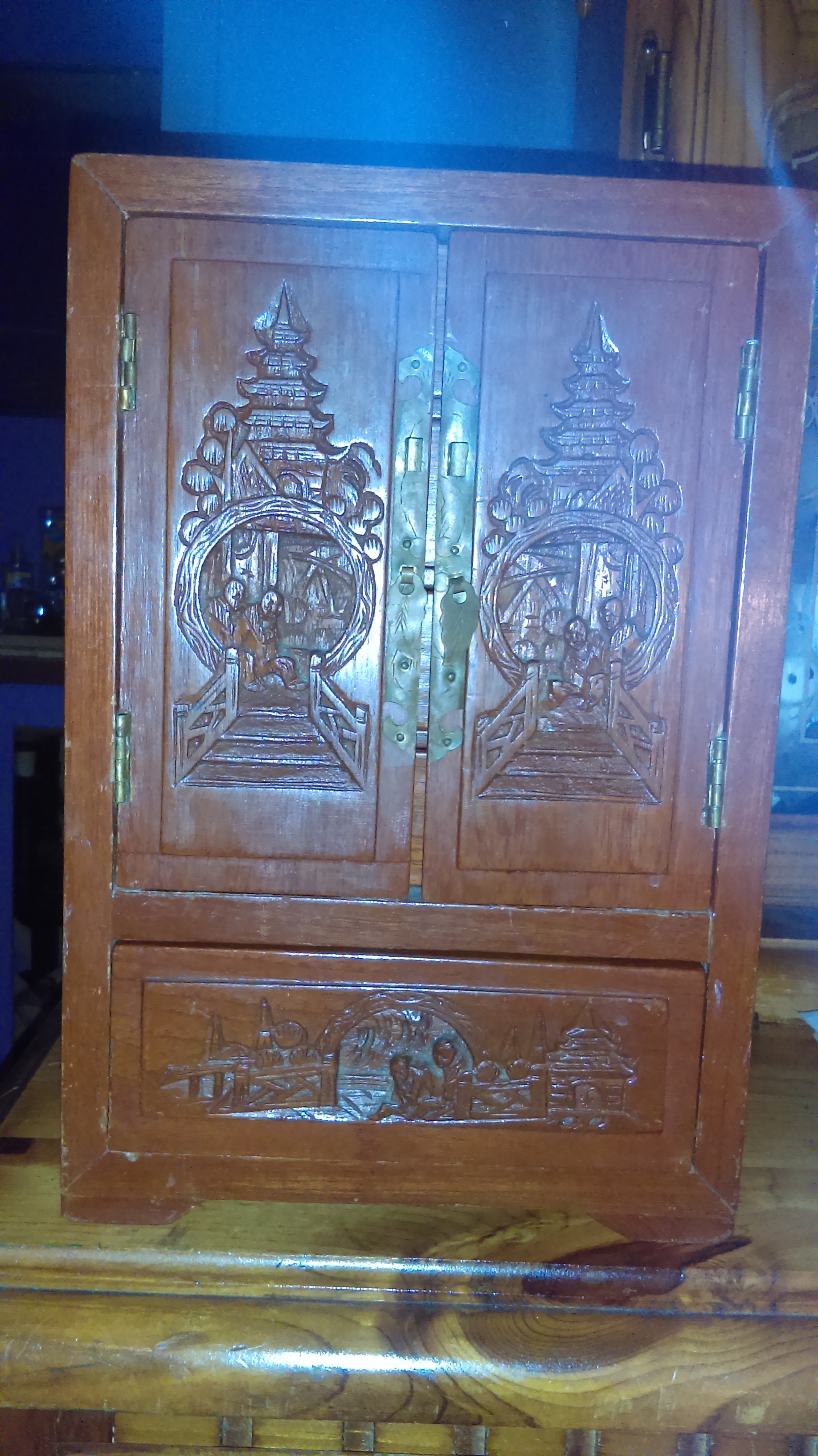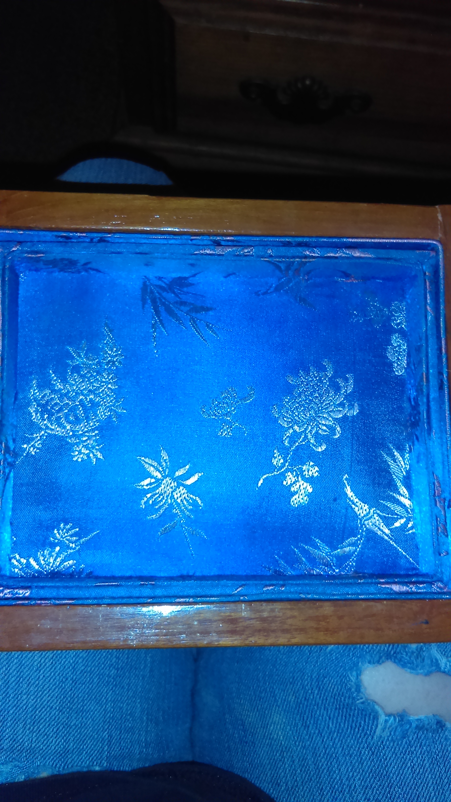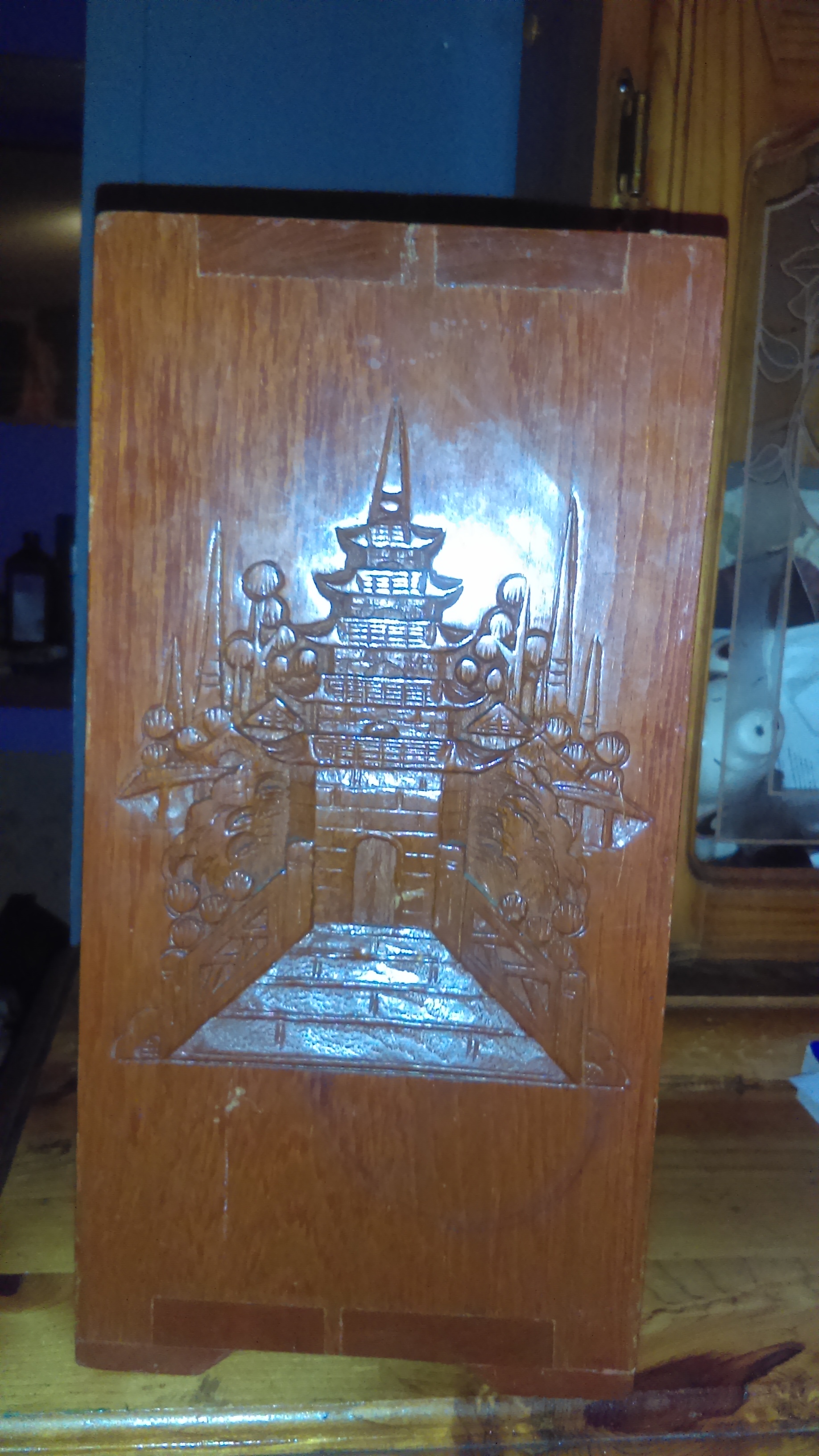 It's a George Zee & Co wooden carved jewelry box the inside is lined with an Asian print silk excellent condition