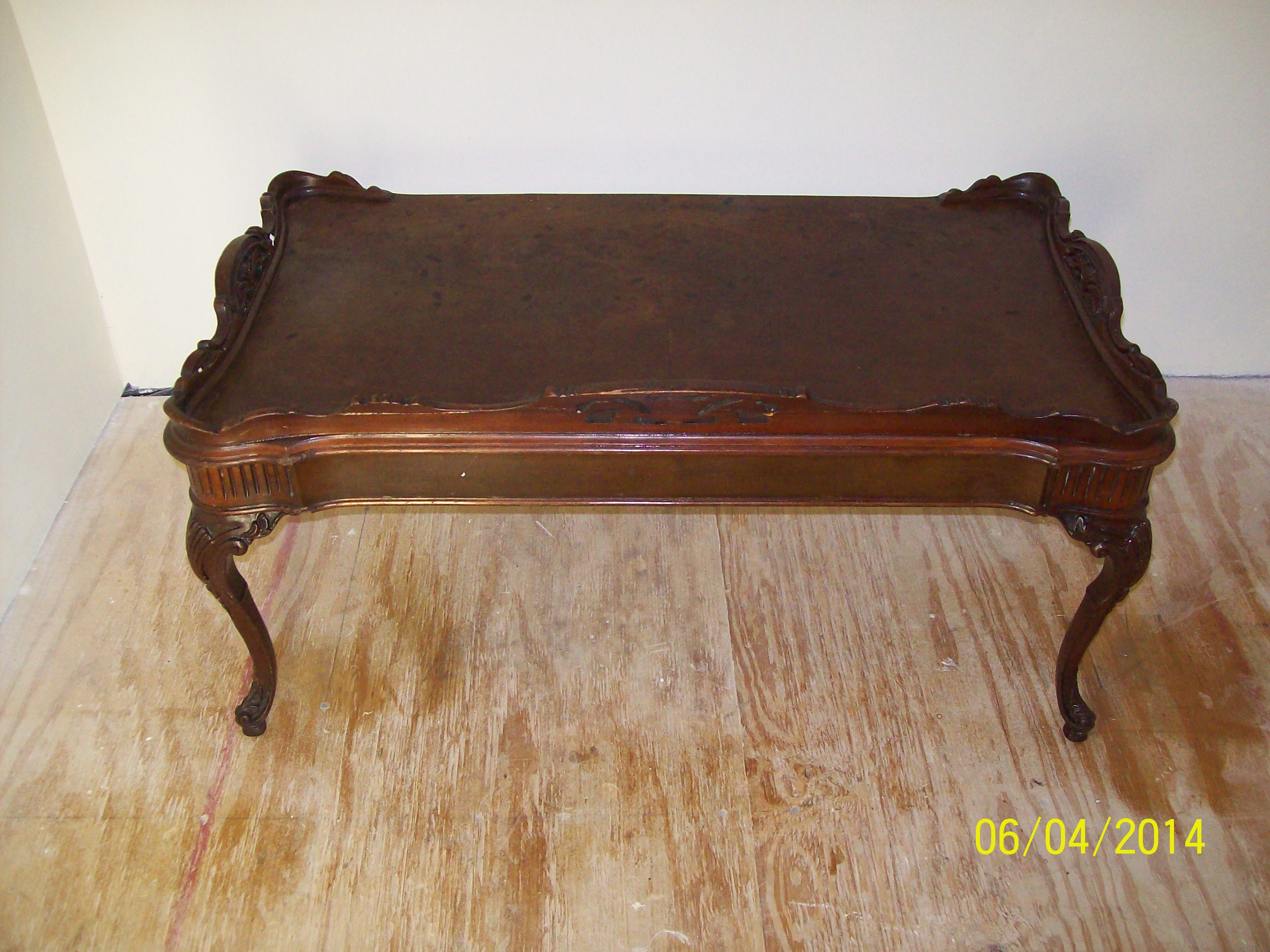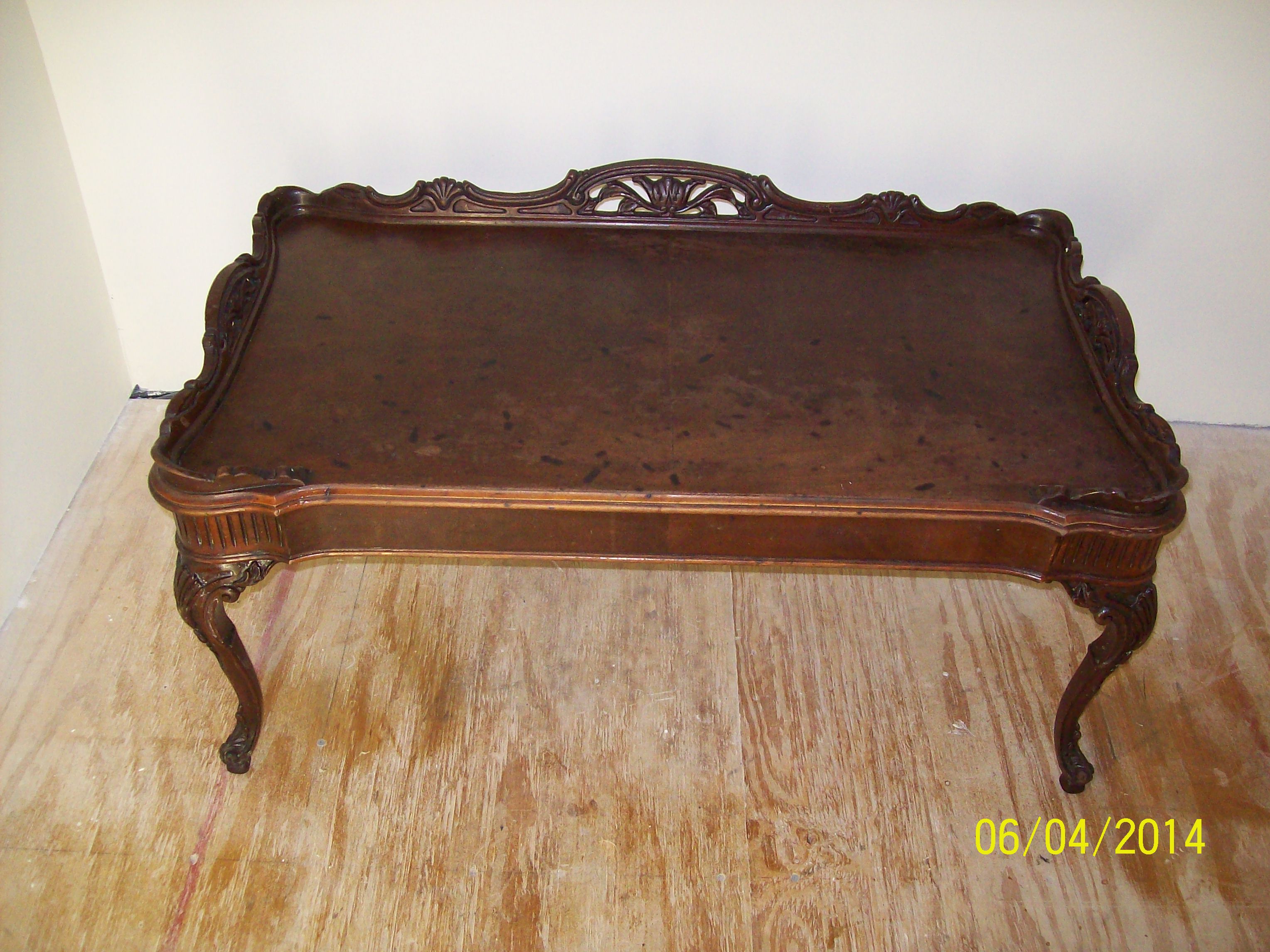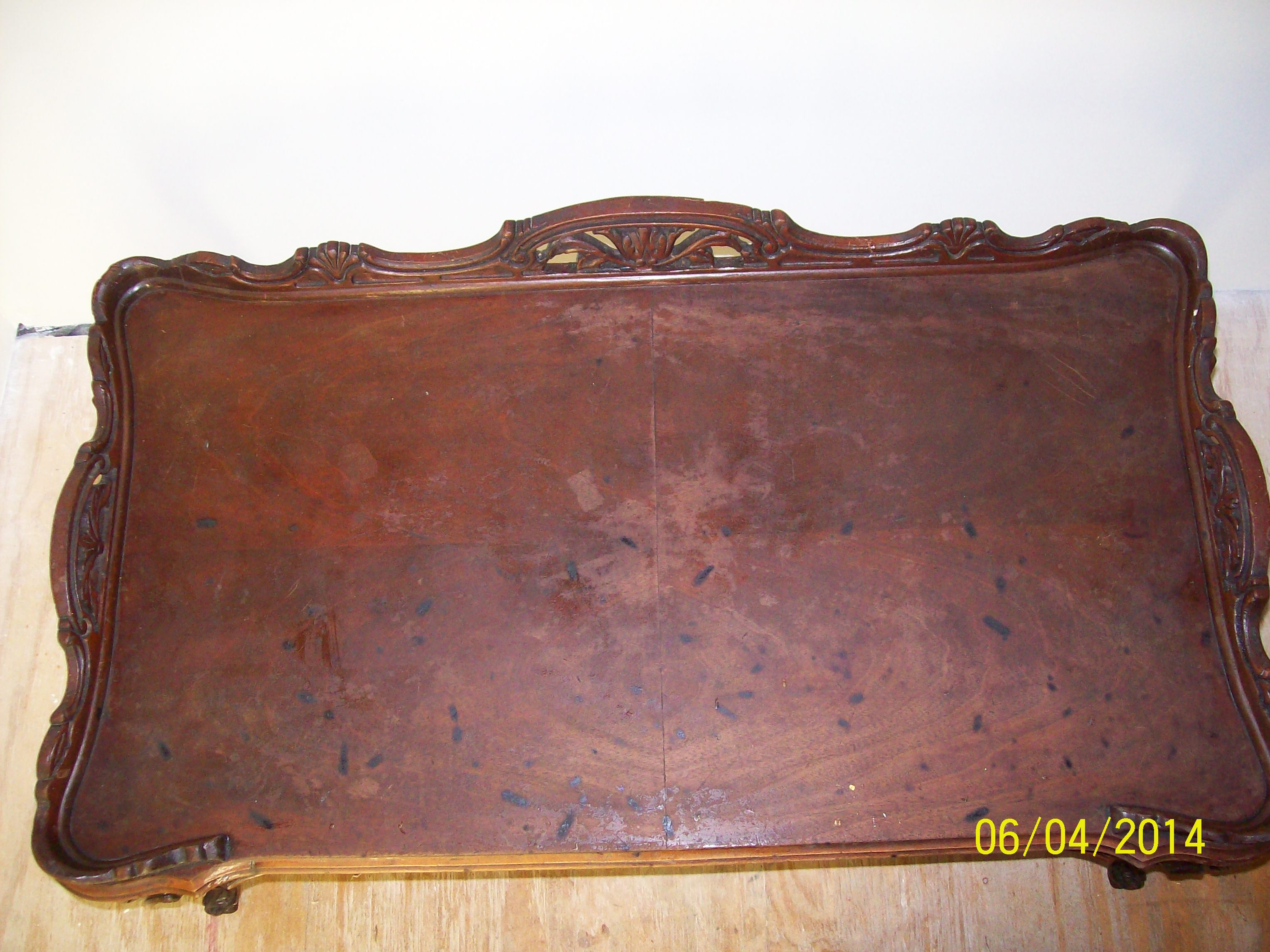 Not sure what kind of table this is and from what year. All I know it is old and has wooden carving on it as pictured. Sadly my family member ruined the top with cigarette burns but this probably could be sanded and refirnished? Any idea what year, what kind and value this has? Thanks.
