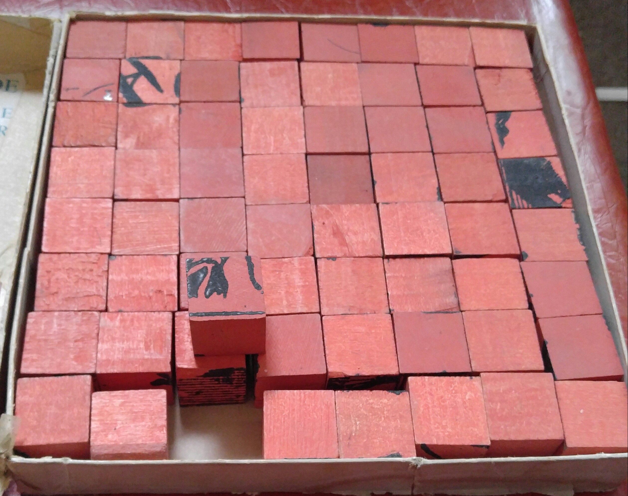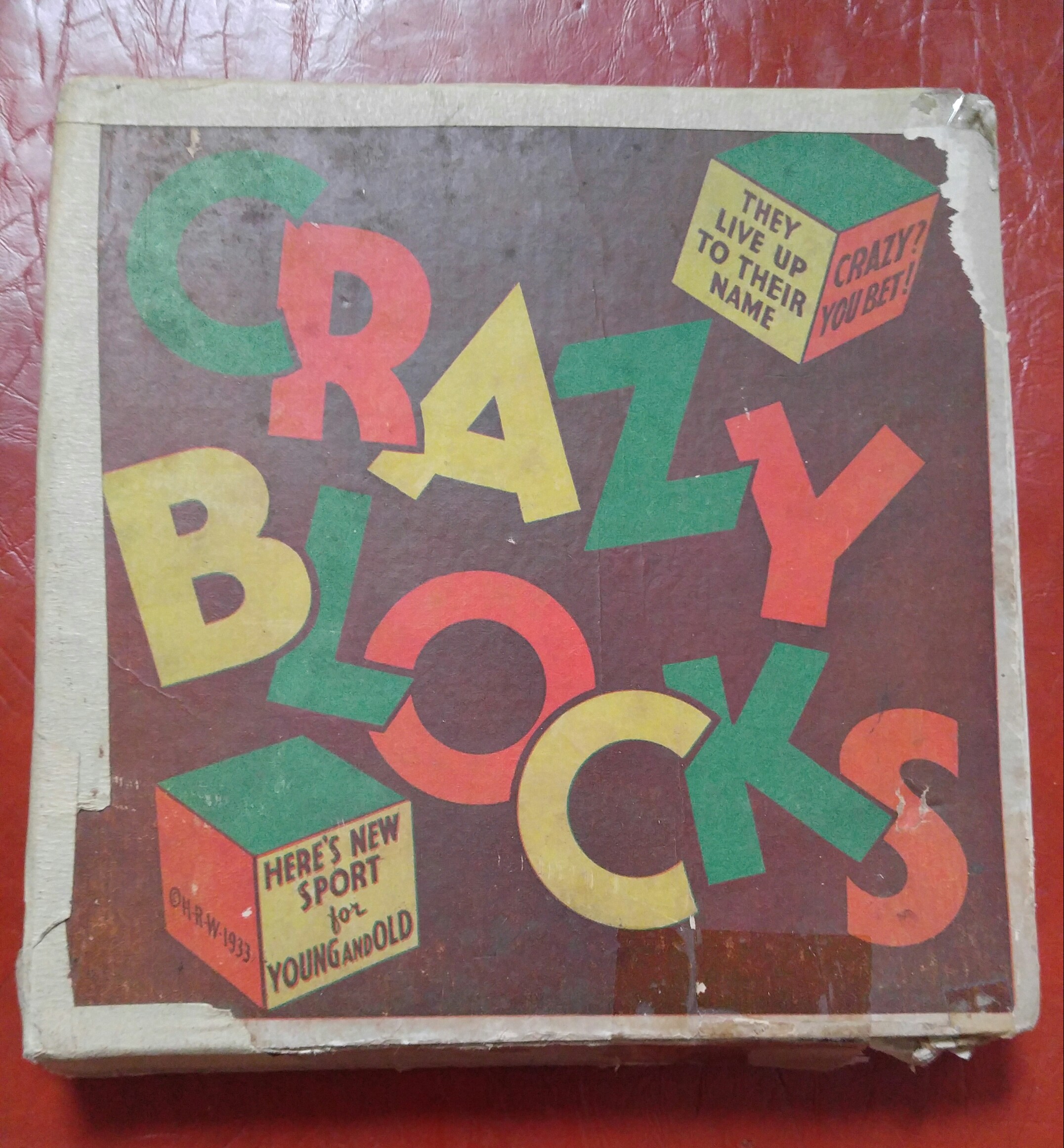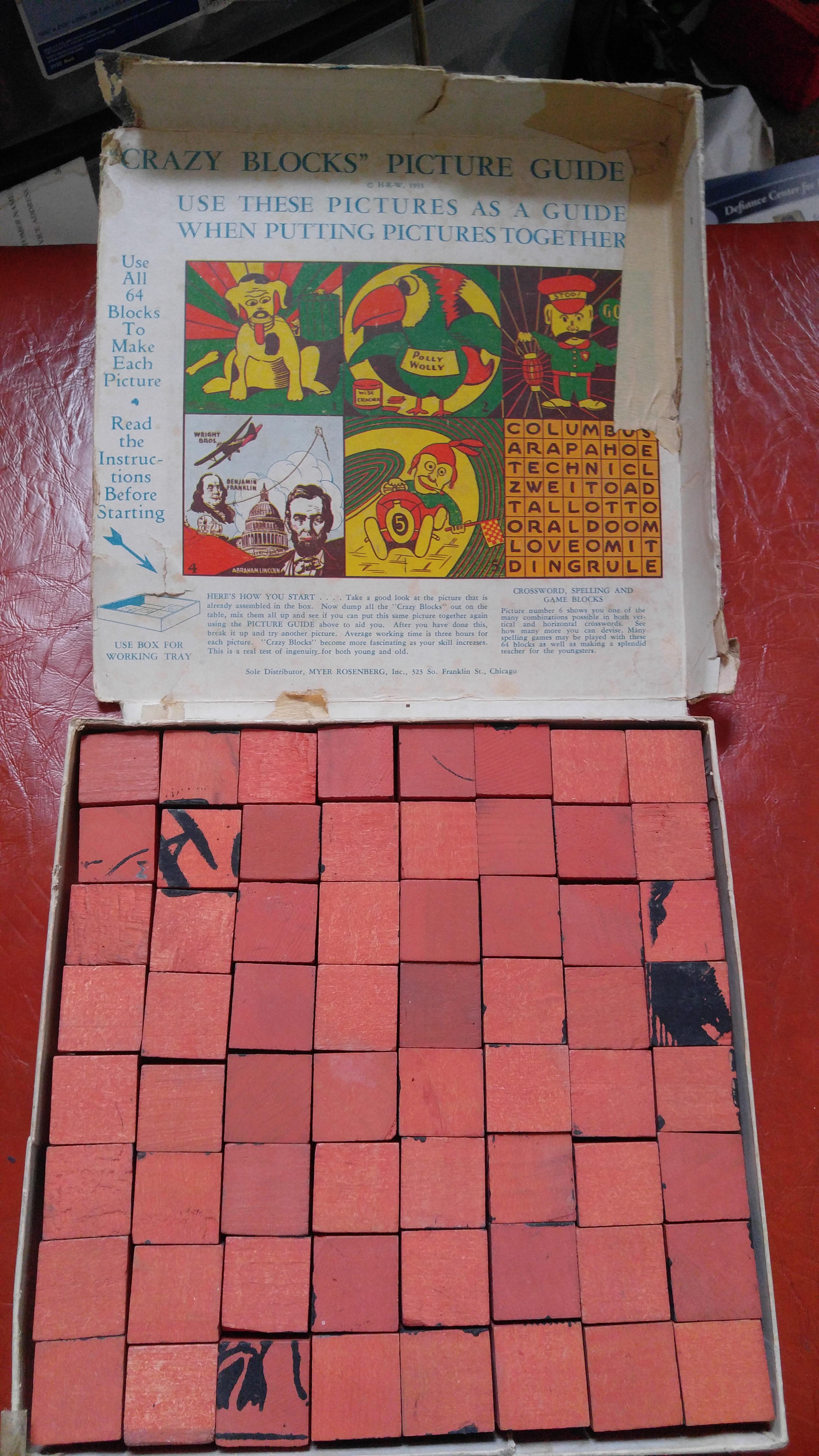 This is a 64 piece, colored, wooden cube, picture puzzle, named "CRAZY BLOCKS". Each block has six sides, and can create multiple different pictures, crosswords, etc. Sole Distributor: MYER ROSENBERG Inc. 323 So. Franklin St. Chicago, Illinois © H-R-W 1933