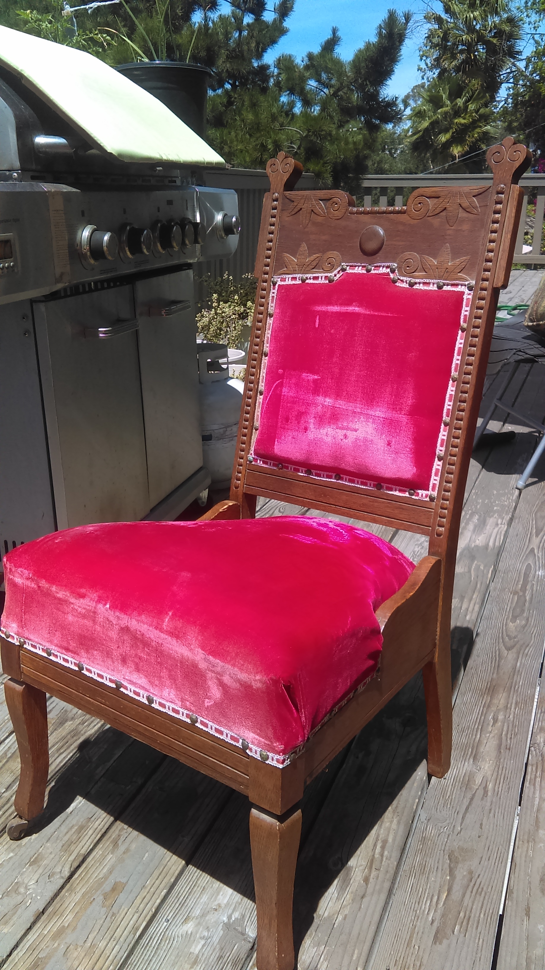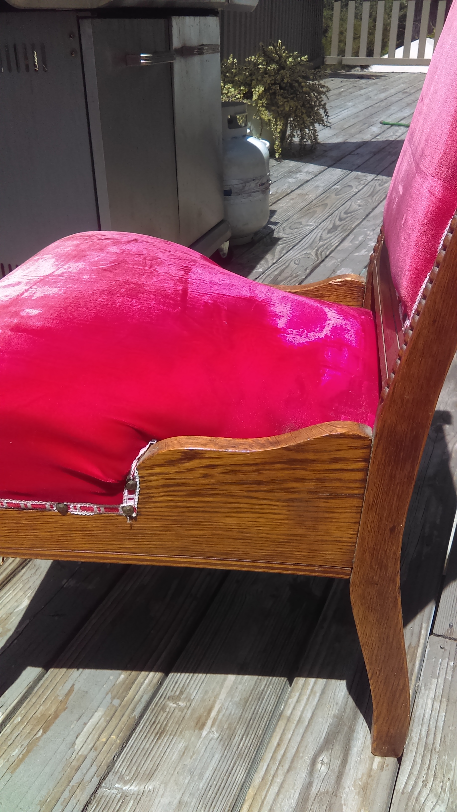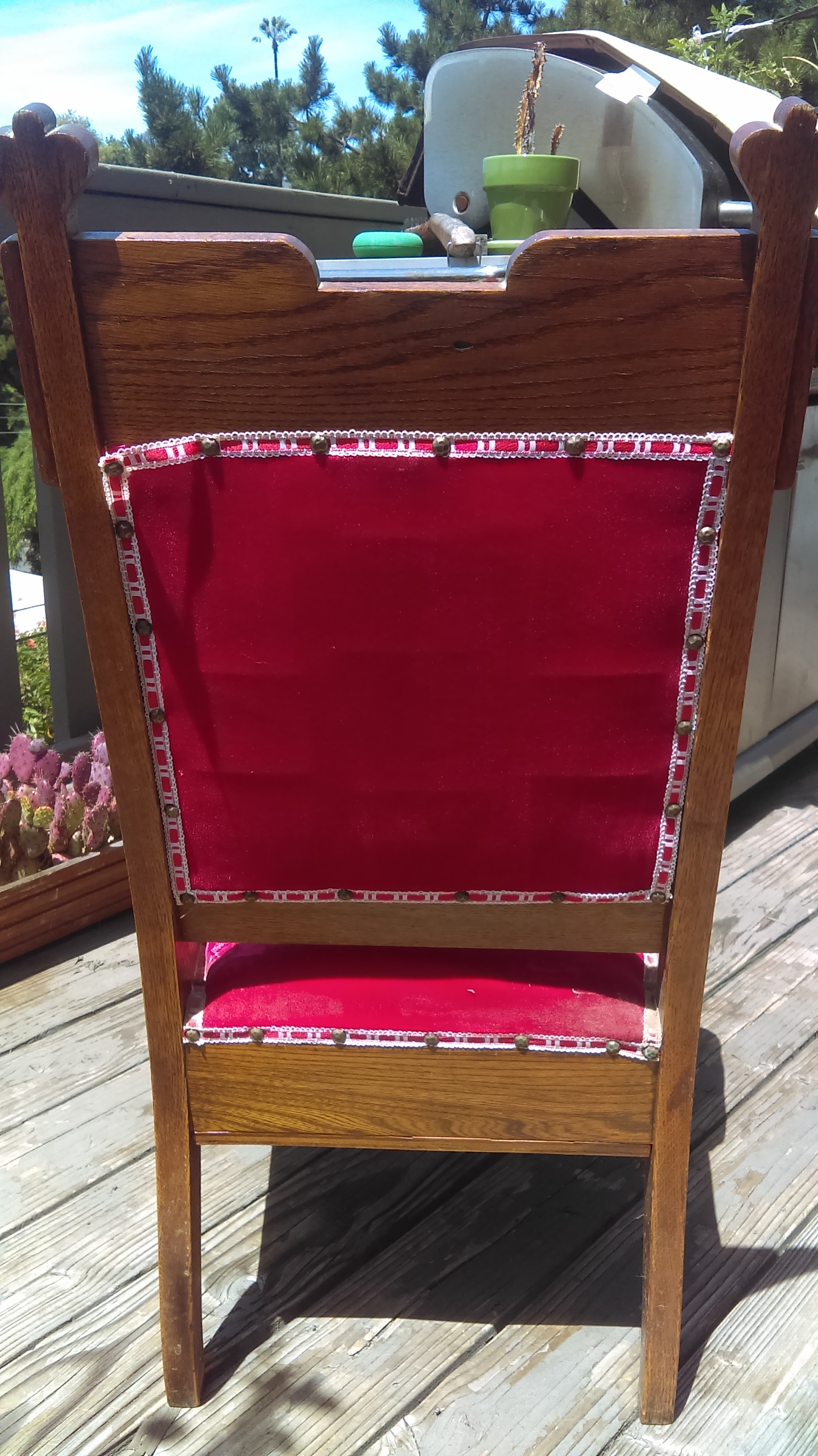 I inherited quite a few antique and vintage items from my grandfather and father. This chair had been in my family for at least the 40 years I've been on the planet. It has wooden wheels on the front legs. Appears to be nicely carved decor all over the seat back. It's a great looking piece I just have no idea where it is from.