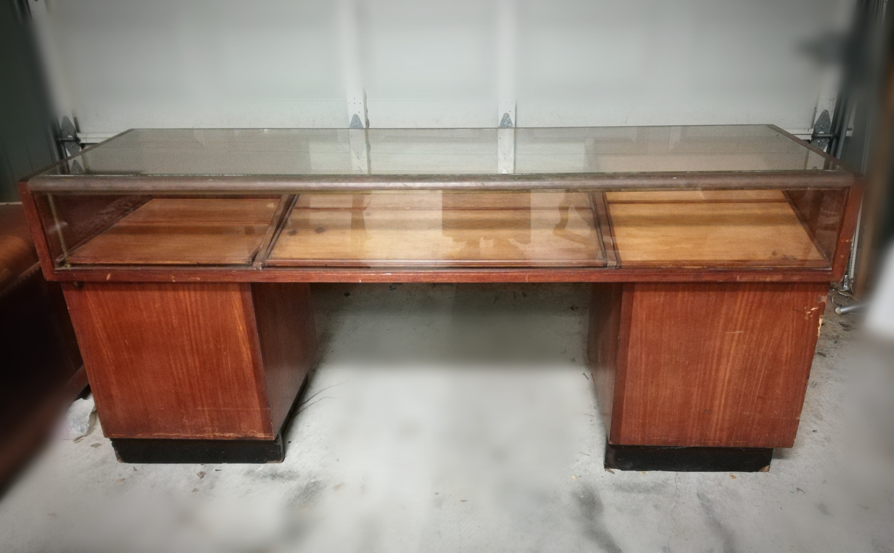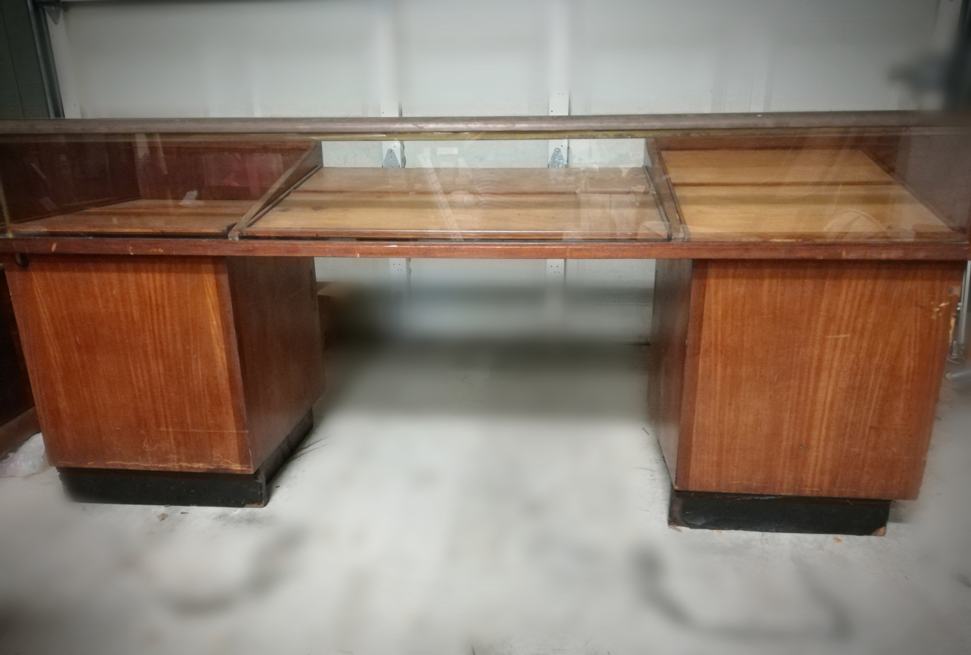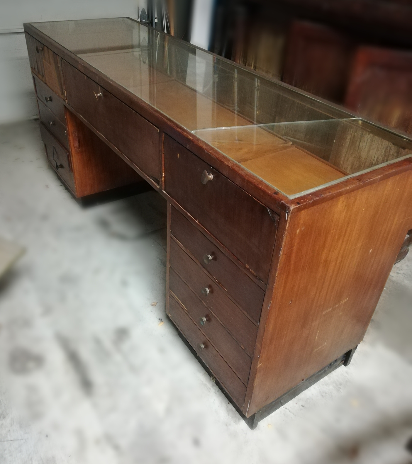 Antique Wooden and Glass Display Cabinet/Desk. The interior display area is equipped with a fluorescent light and the panels can be raised or lowered depending on the items on display or personal preference. There are 4 pull out drawers on each side making for a total of 8 drawers. A strip of copper accents the front of the desk where the two glass panels meet. There are no markings on the piece and thus the Maker is unknown to me.
