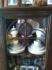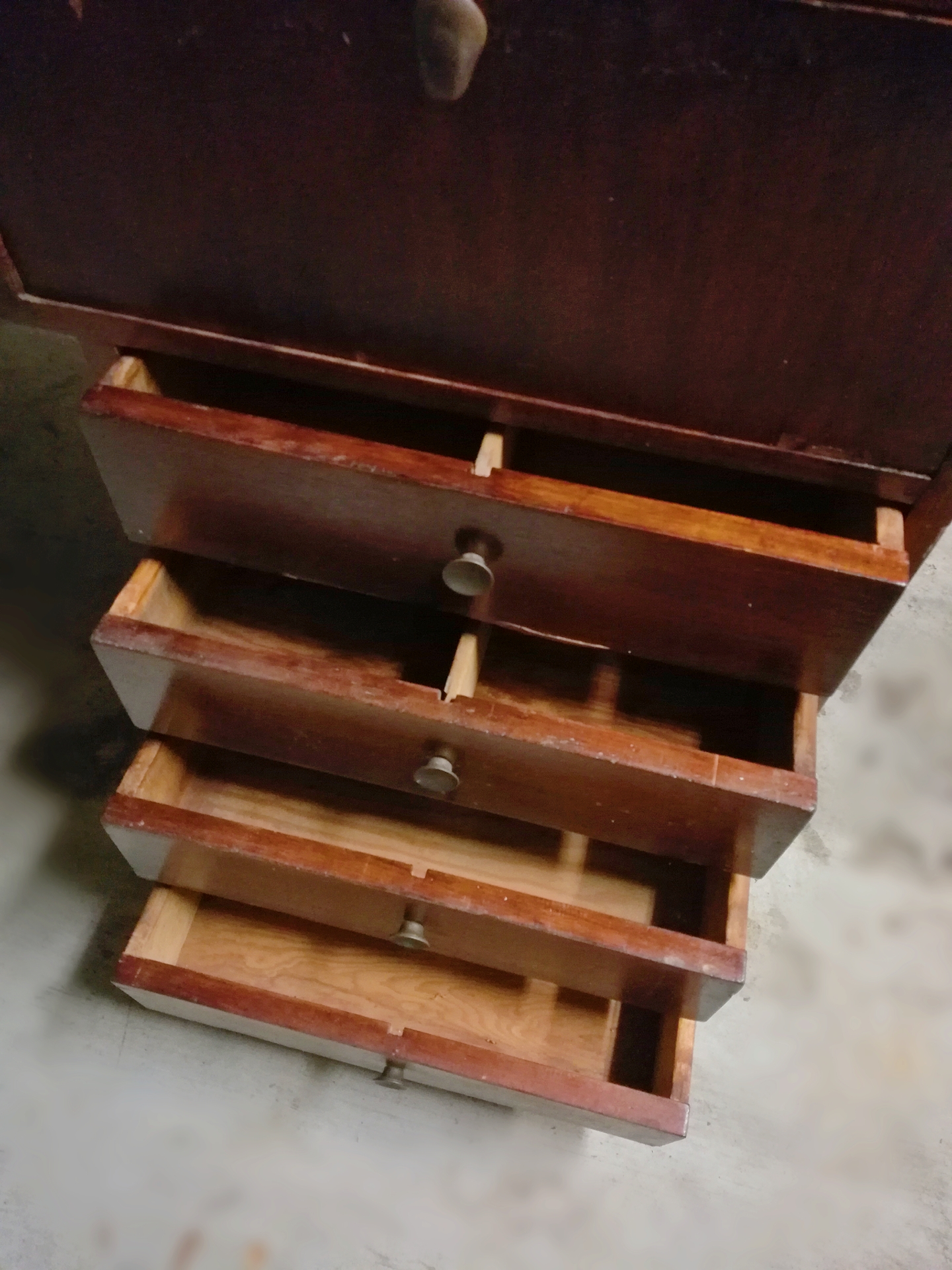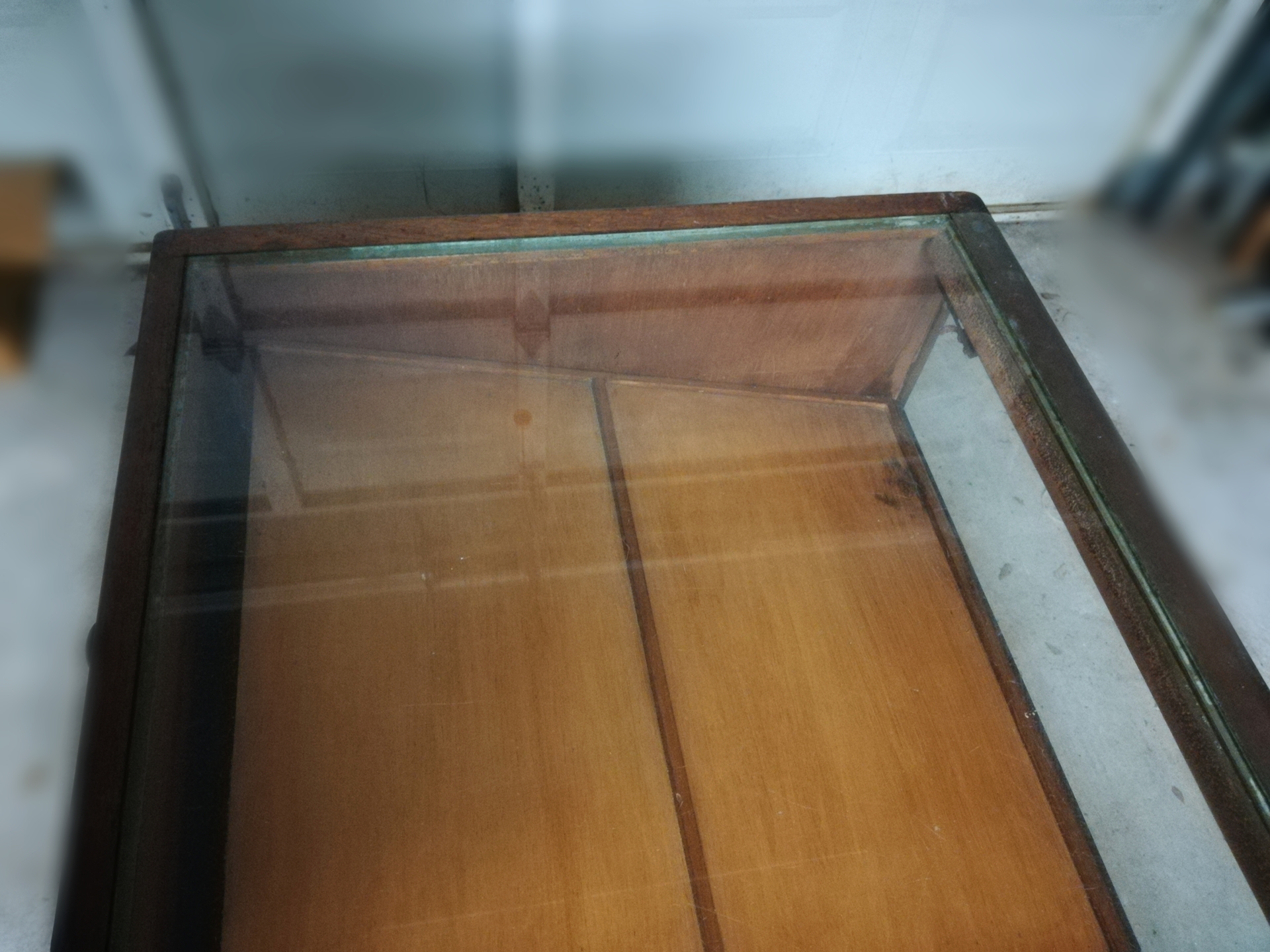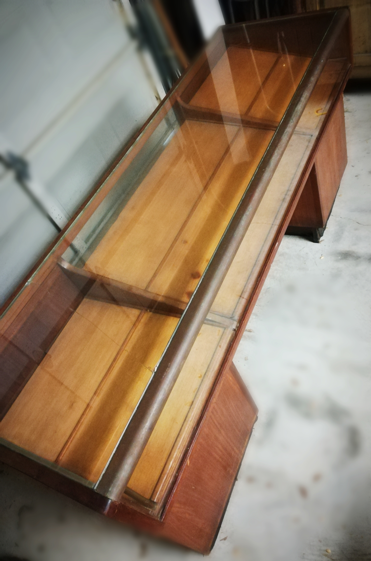 Antique Wooden and Glass Display Cabinet/Desk. The interior display area is equipped with a fluorescent light and the panels can be raised or lowered depending on the items on display or personal preference. There are 4 pull out drawers on each side making for a total of 8 drawers. A strip of copper accents the front of the desk where the two glass panels meet. There are no markings on the piece and thus the Maker is unknown to me.