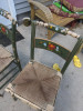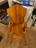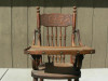 I purchased this high chair from an estate sale more than 25 years ago. It has the original finish. The seat and back have carved detail, and the seat has brass tacks around the detail carving. The tray latches in place with a metal latch.