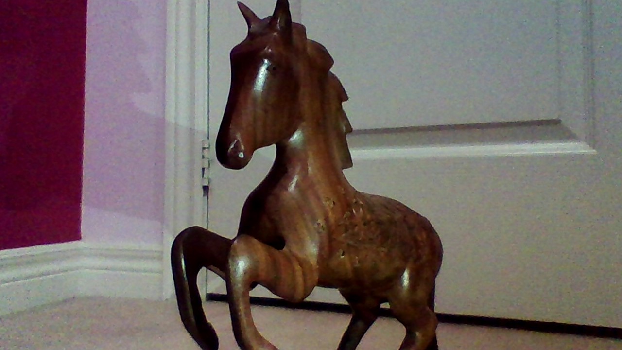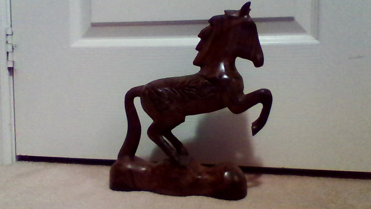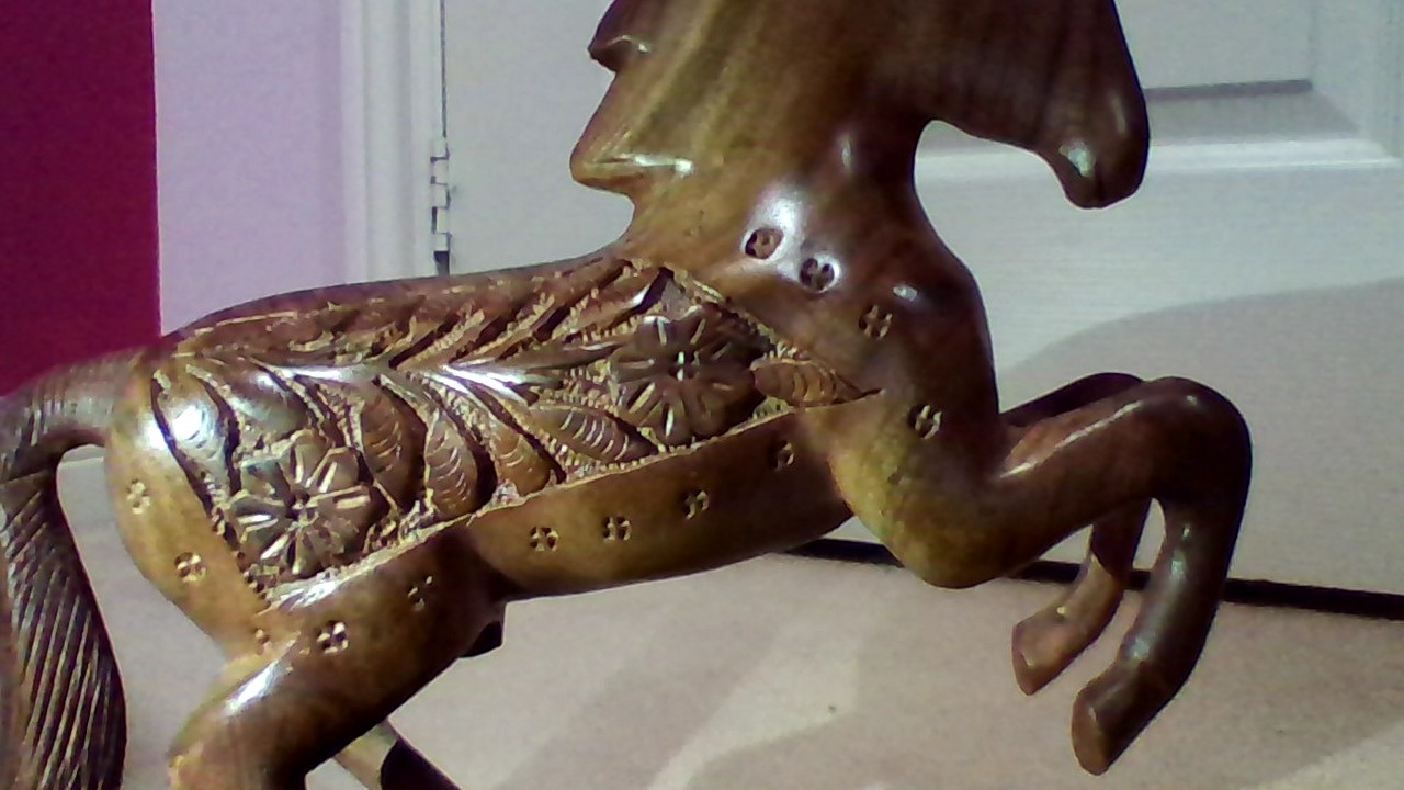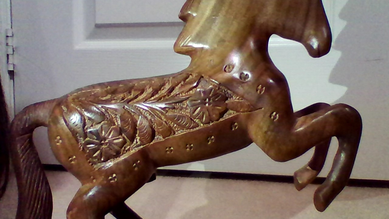 antique wooden horse. imported from india. dont know much else. has beautiful engraving