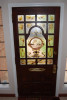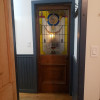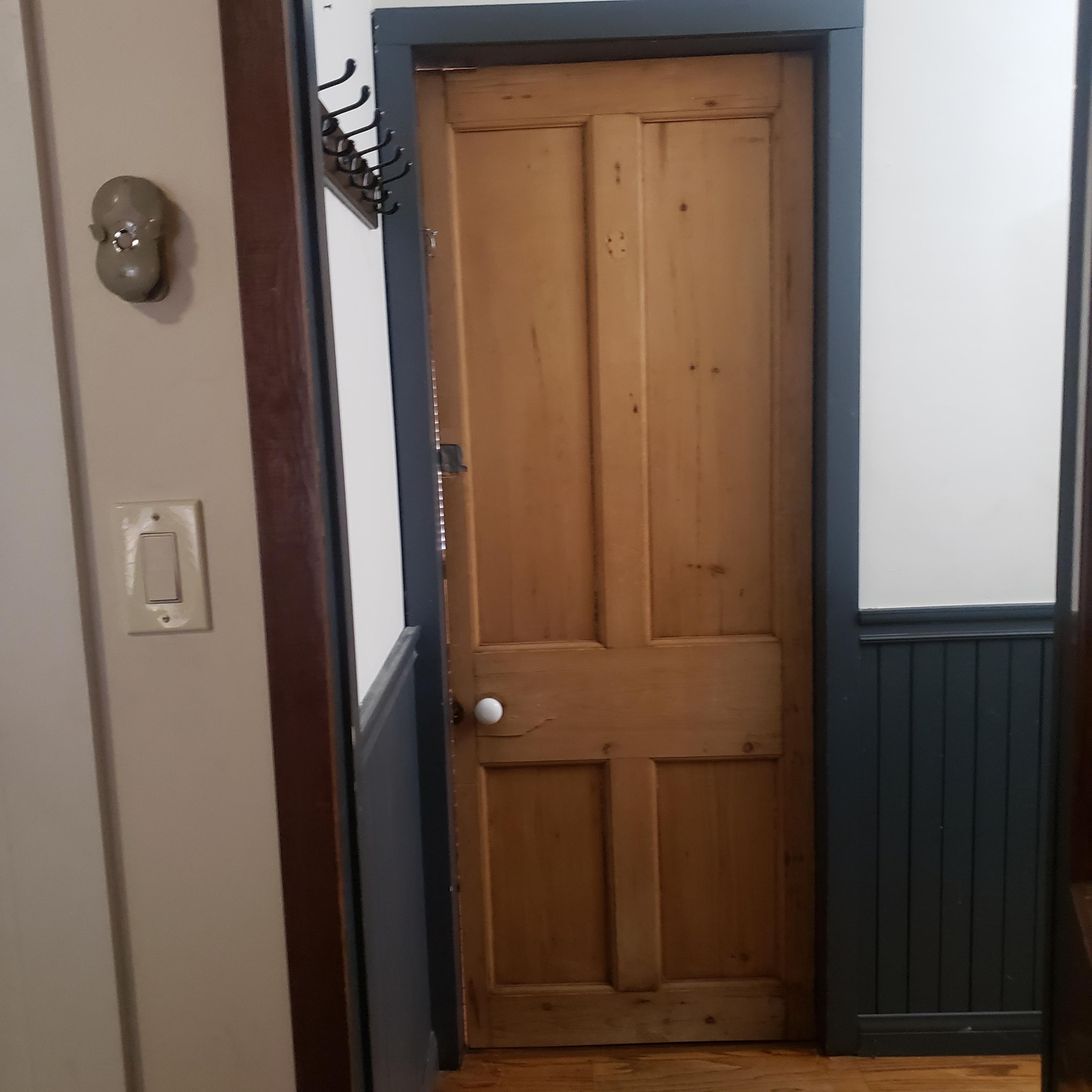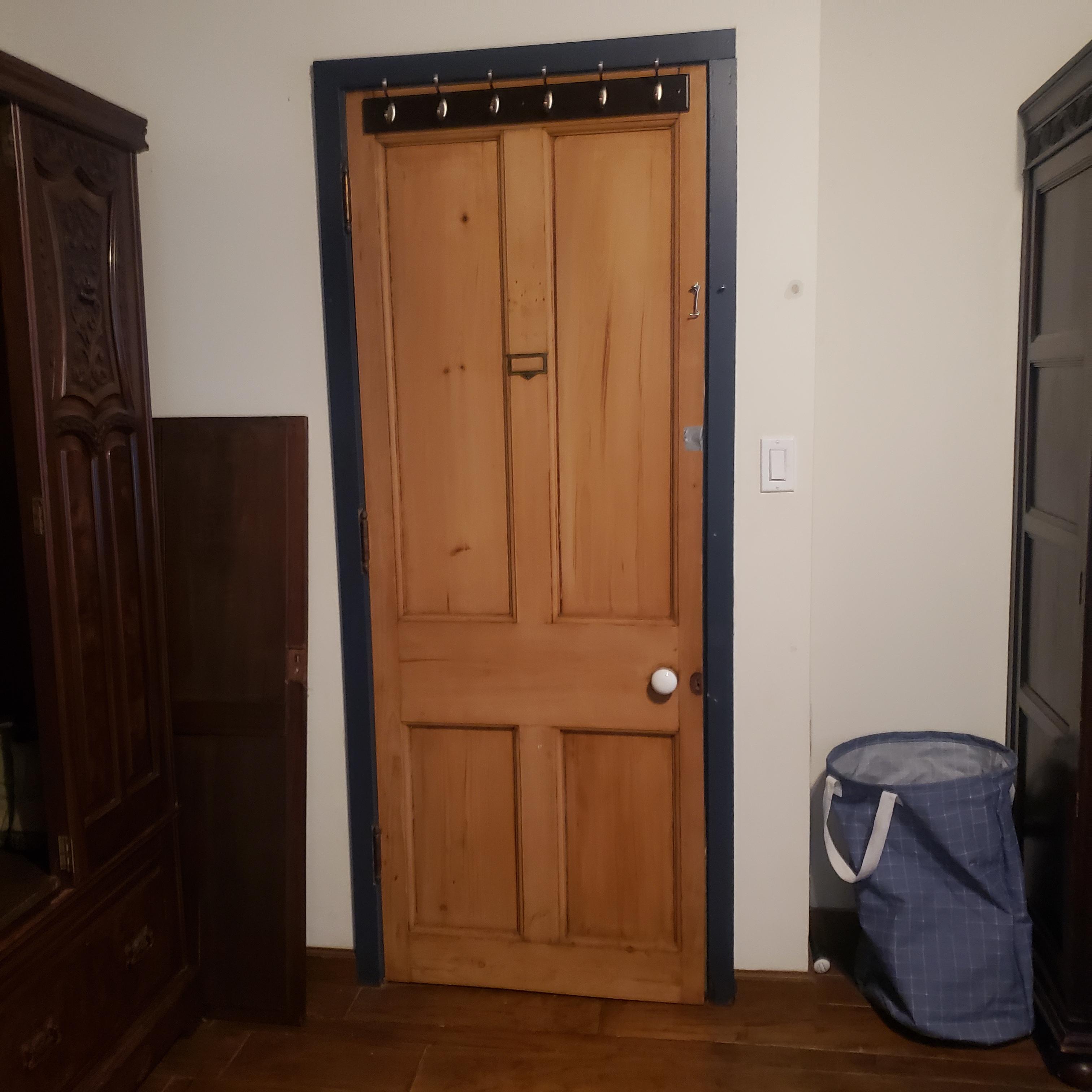 Antique four panel unstained and unvarnished interior door, old fashioned mortised door lock and dead bolt were removed and door was cut to fit 30" wide doorway. Door is approximately 29 3/4" wide by 79 3/4" tall. Looks that door was originally 32" wide and cut down to fit the smaller doorway as there is quite a bit of wood missing from the strike side. Thickness of door will be measured and posted shortly. There is some damage to area near knob. Door was just removed from doorway and photos will be updated. Coat hooks, business card holder, hinges and white porcelain knob were removed.