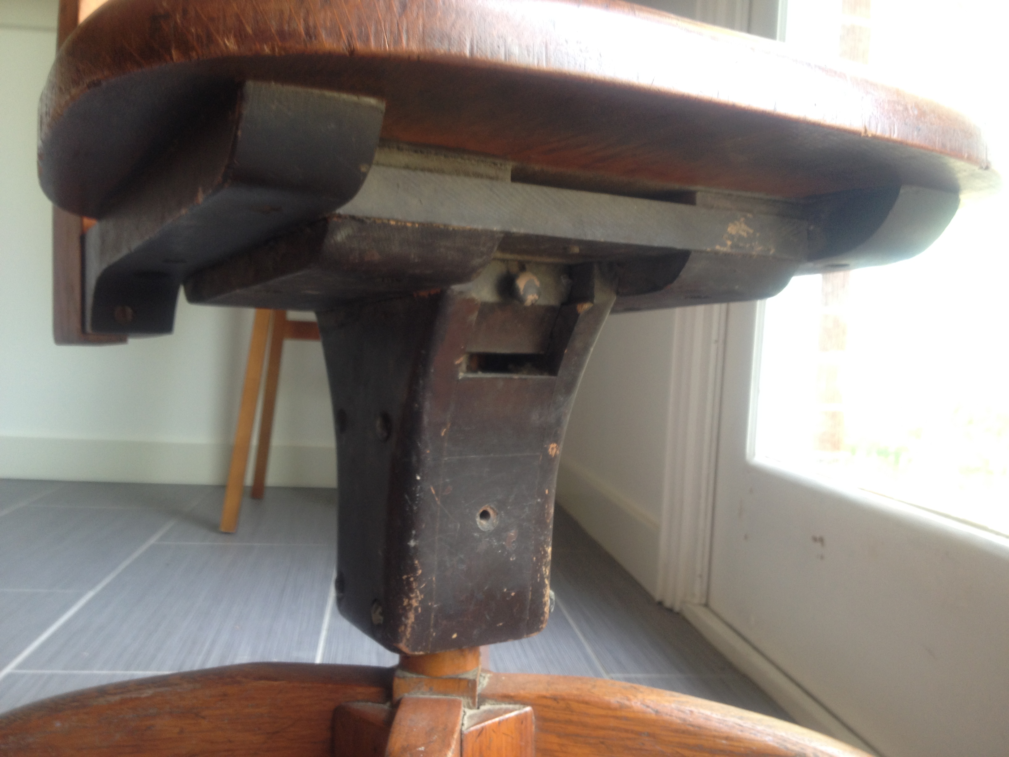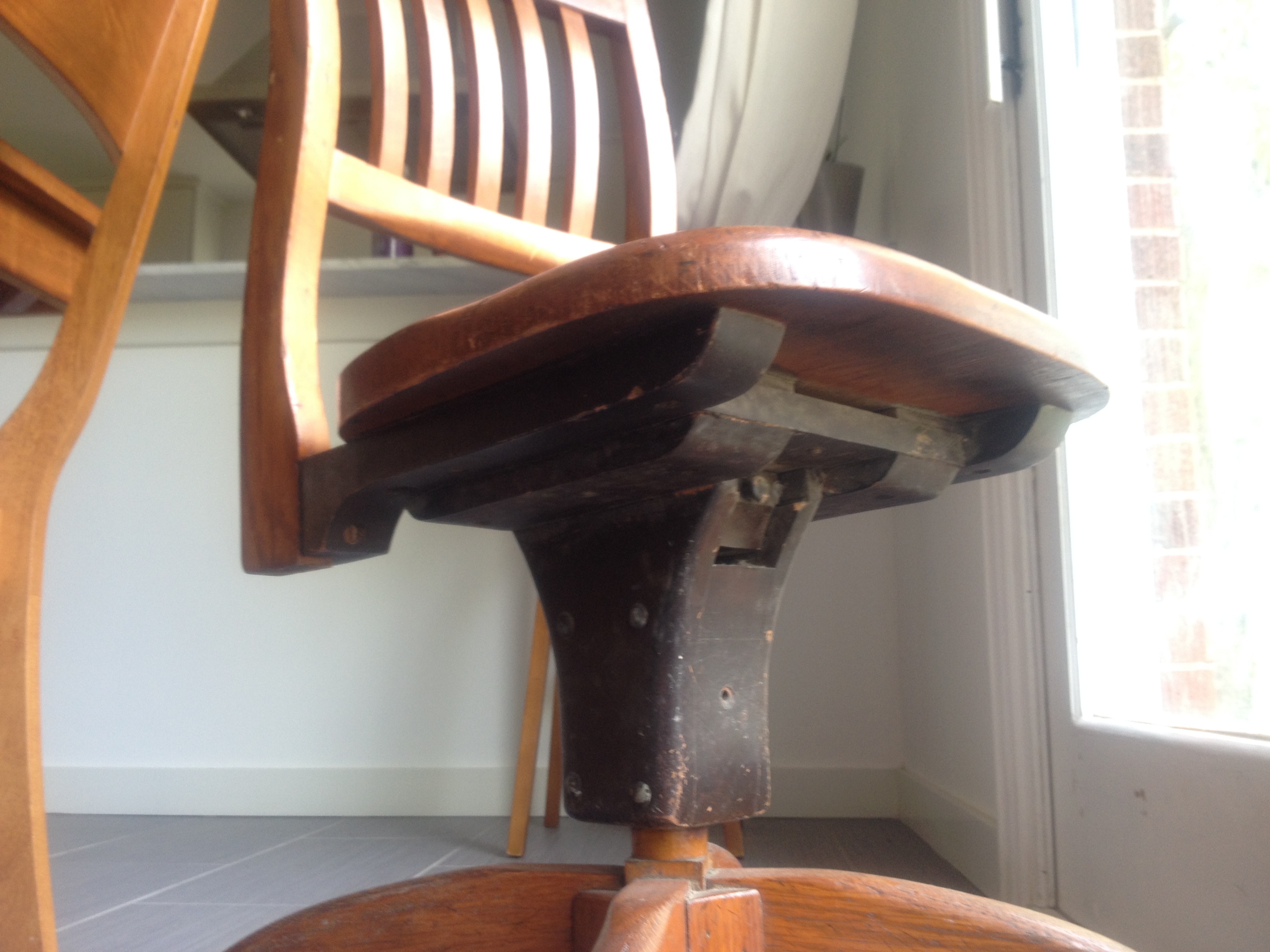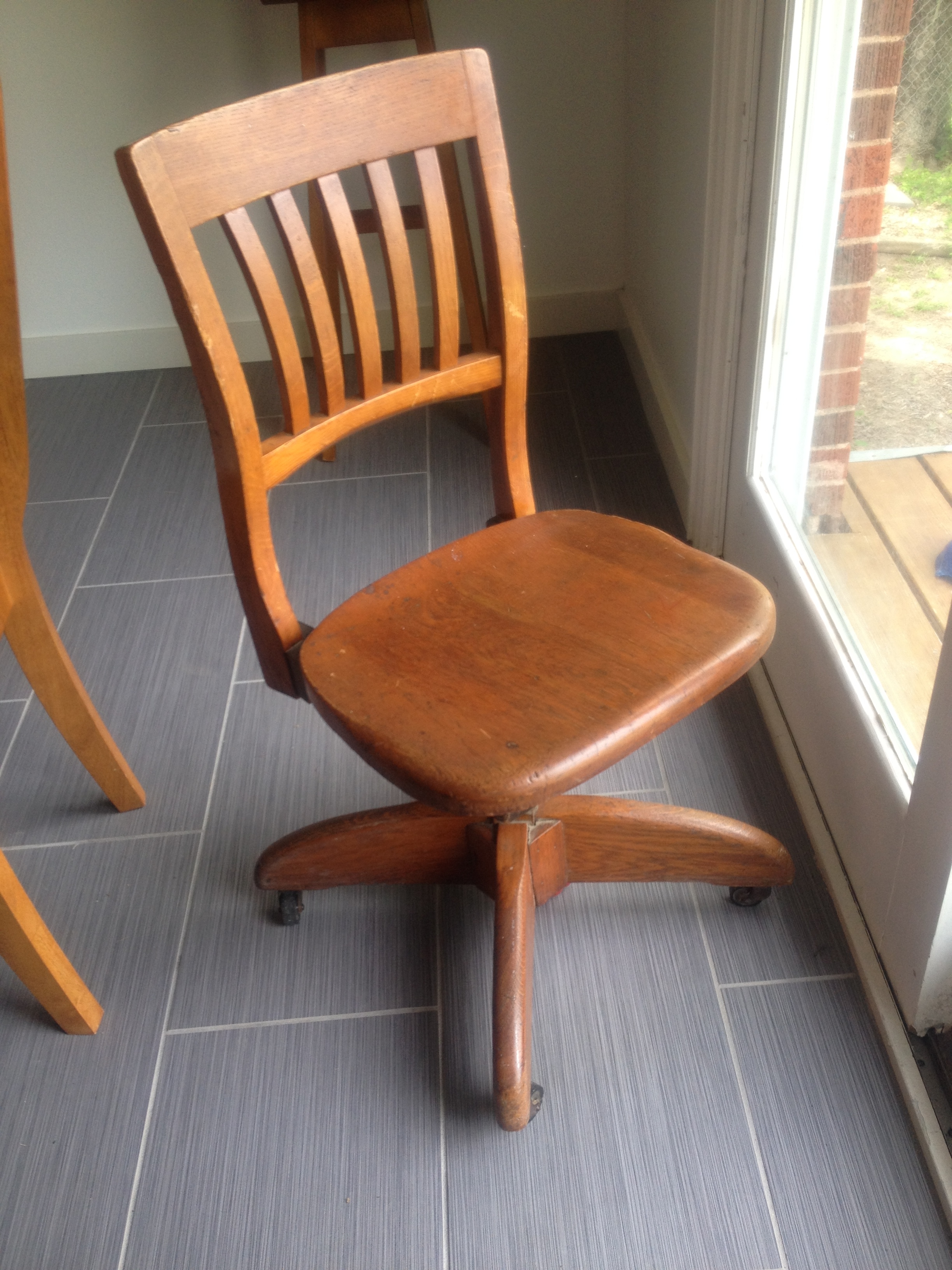 I found this chair that is solid wood (oak maybe).  It swivels and is on casters.  The base is entirely made of wood - only metal screws but all components are solid wood.  I would like to know any information on the age, manufacturer and possible value of this chair.  Thank you!