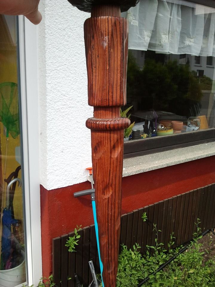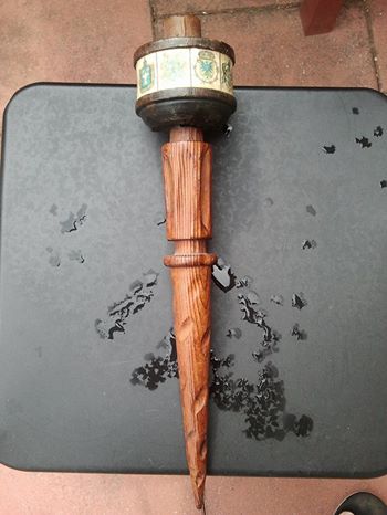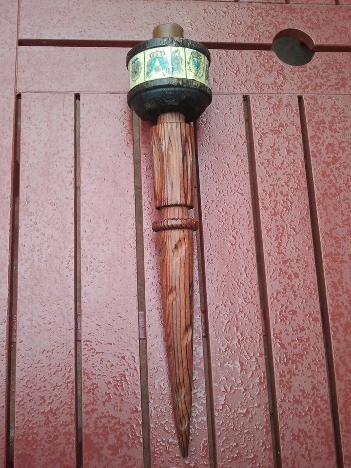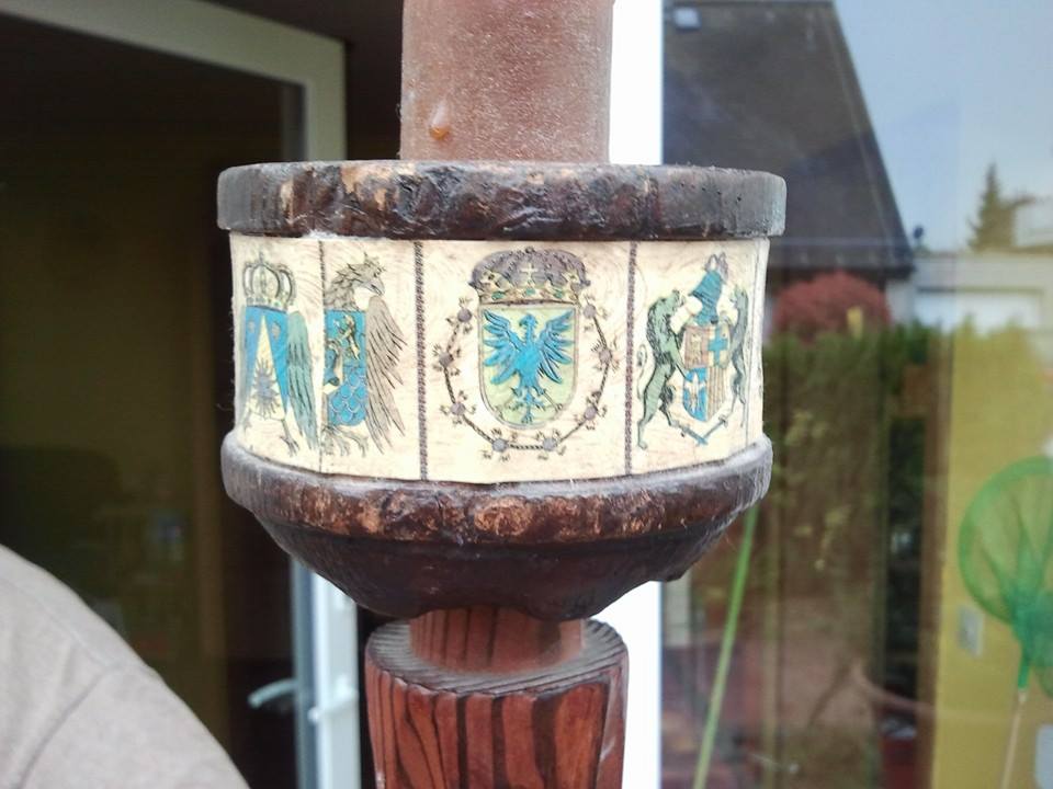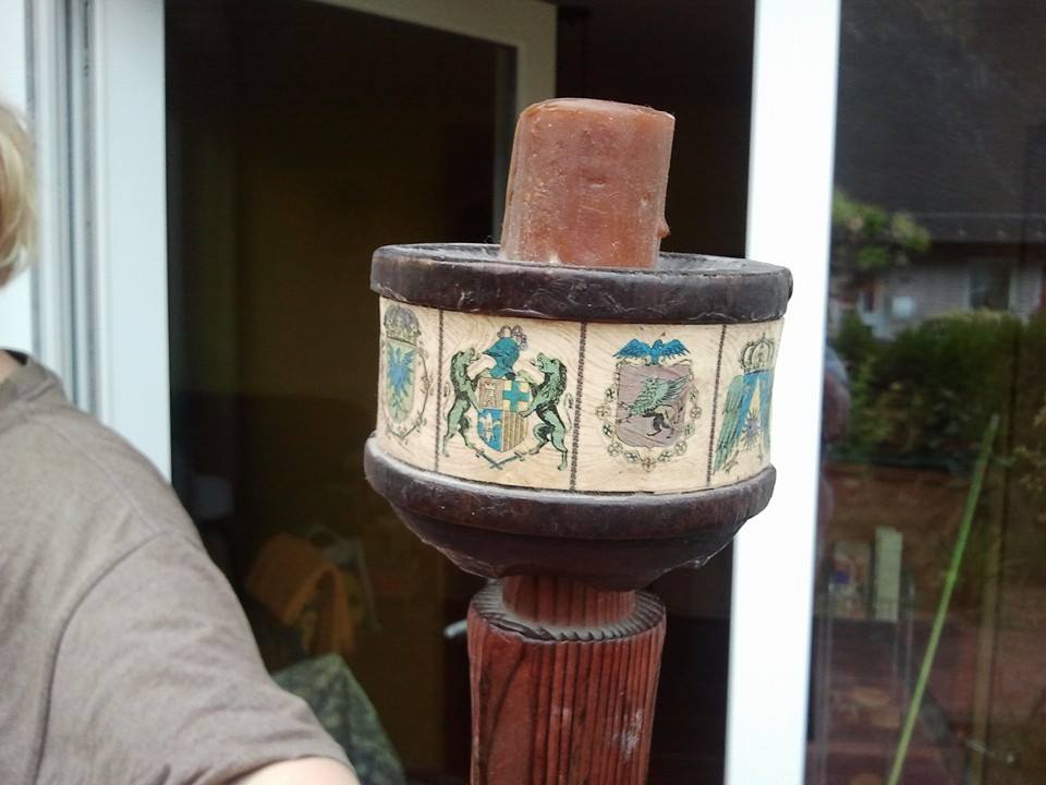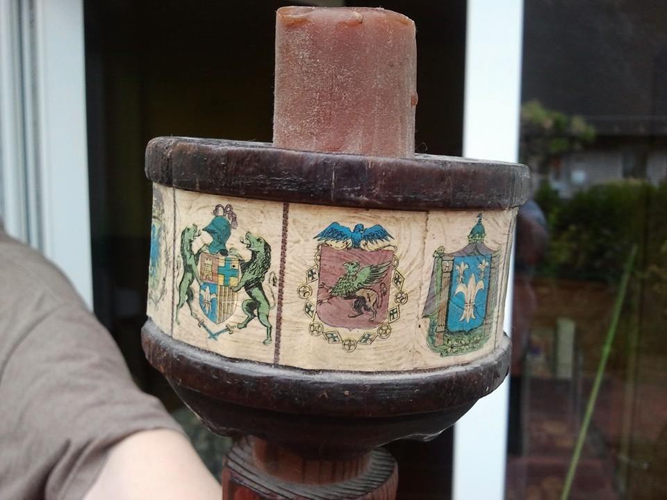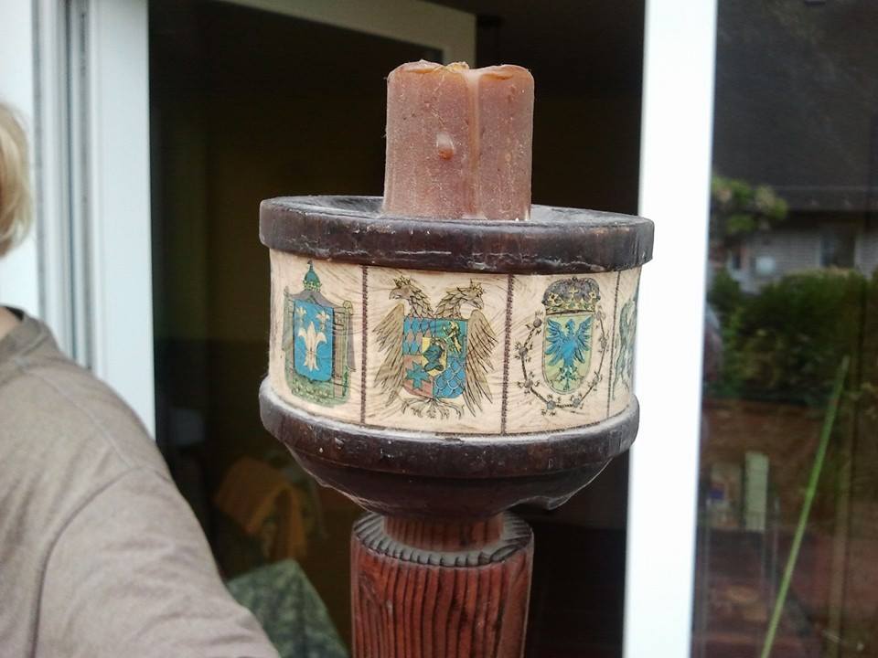 I found it here in Germany (I'm a medically retired US soldier). It is some kind of candle holder possibly once wall mounted. It's 2 pieces connected. The bottom is a striped kind of wood while the top piece that holds the candle is a rounded block of some kind of darker wood. Crests have been whatlooks like shalacked on around the outside of the top piece.