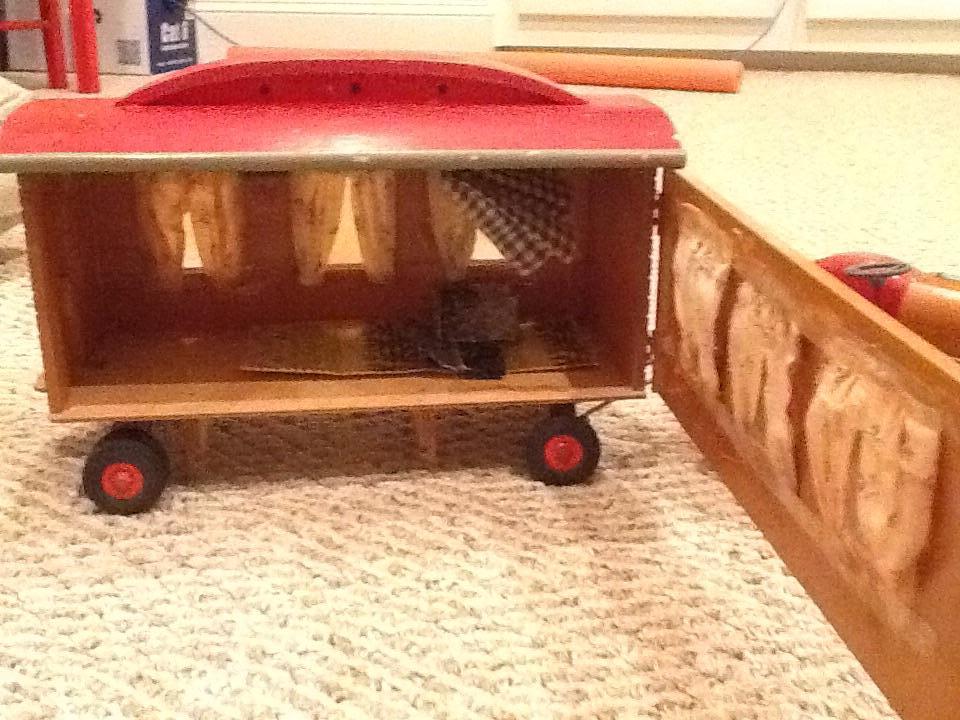 wooden mobile home that is pulled by tractor - no label or markings