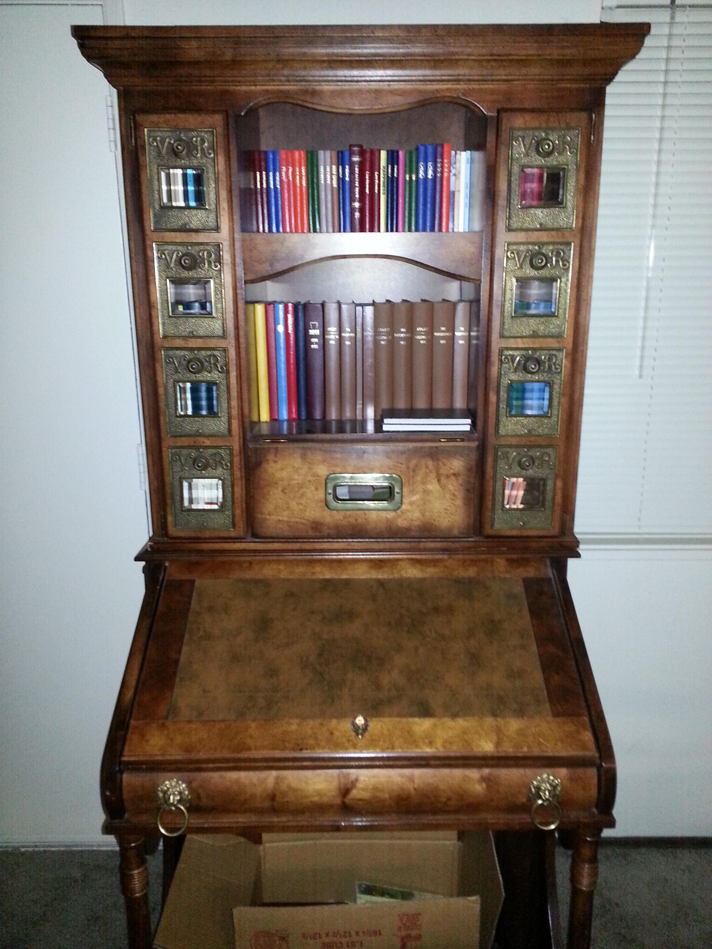 This solid wood desk features lion head pull rings and a crystal knob for the desk cover. The cabinet features a hanging panel with a mail slot in the middle. Both the desk and cabinet doors have metal plates with glass with the letters "VR" embossed on them. Not much else is known about the piece.