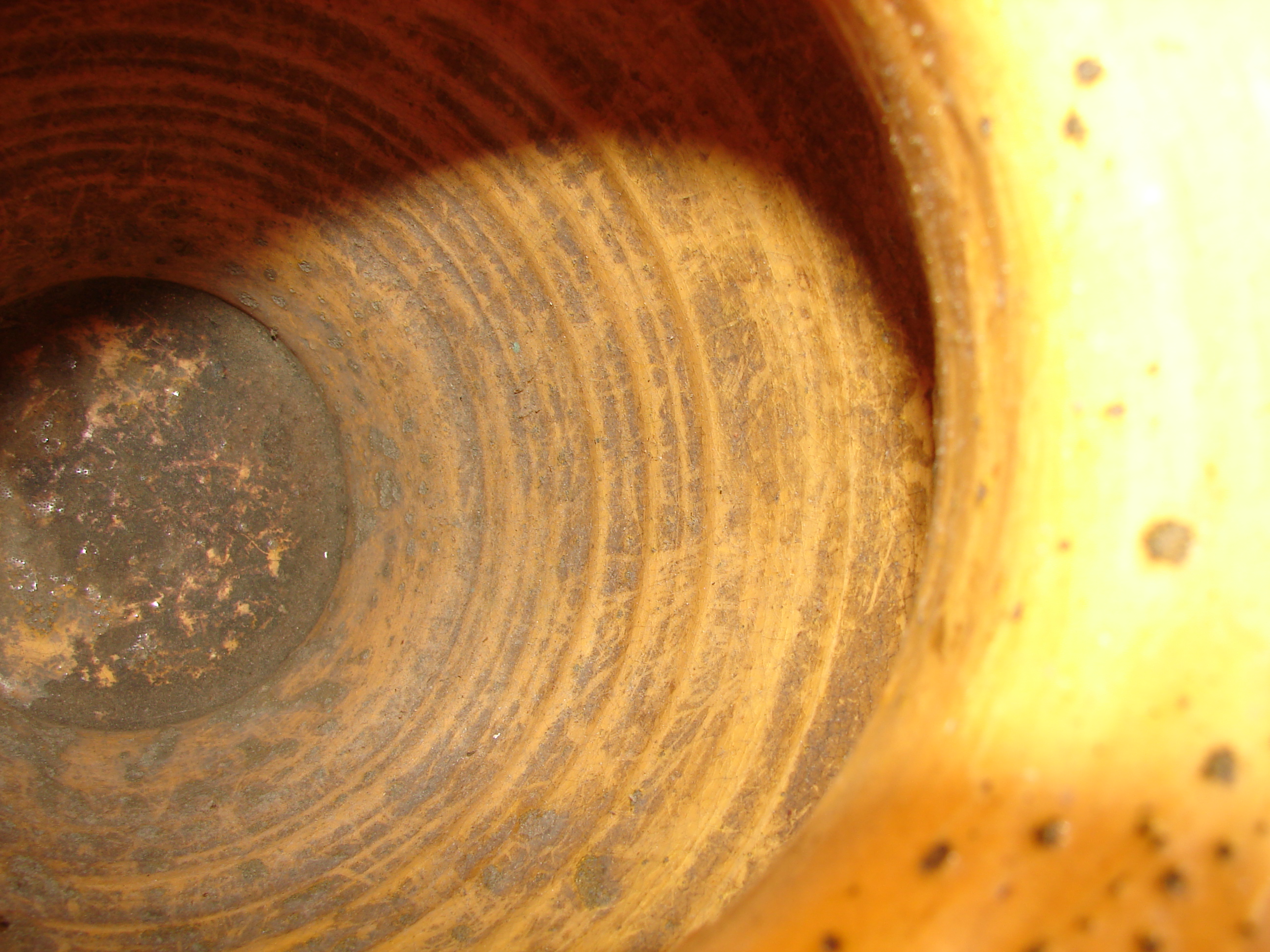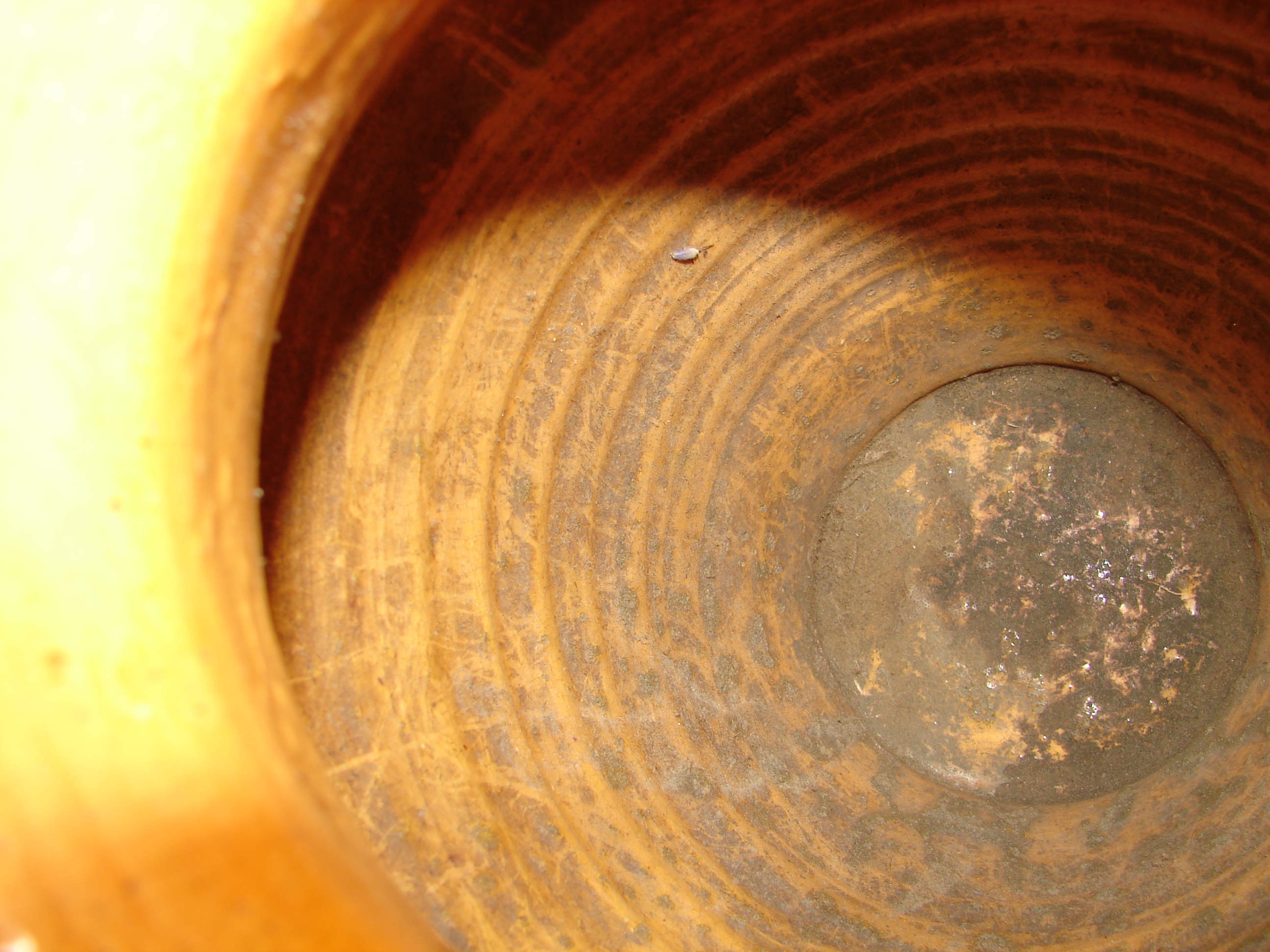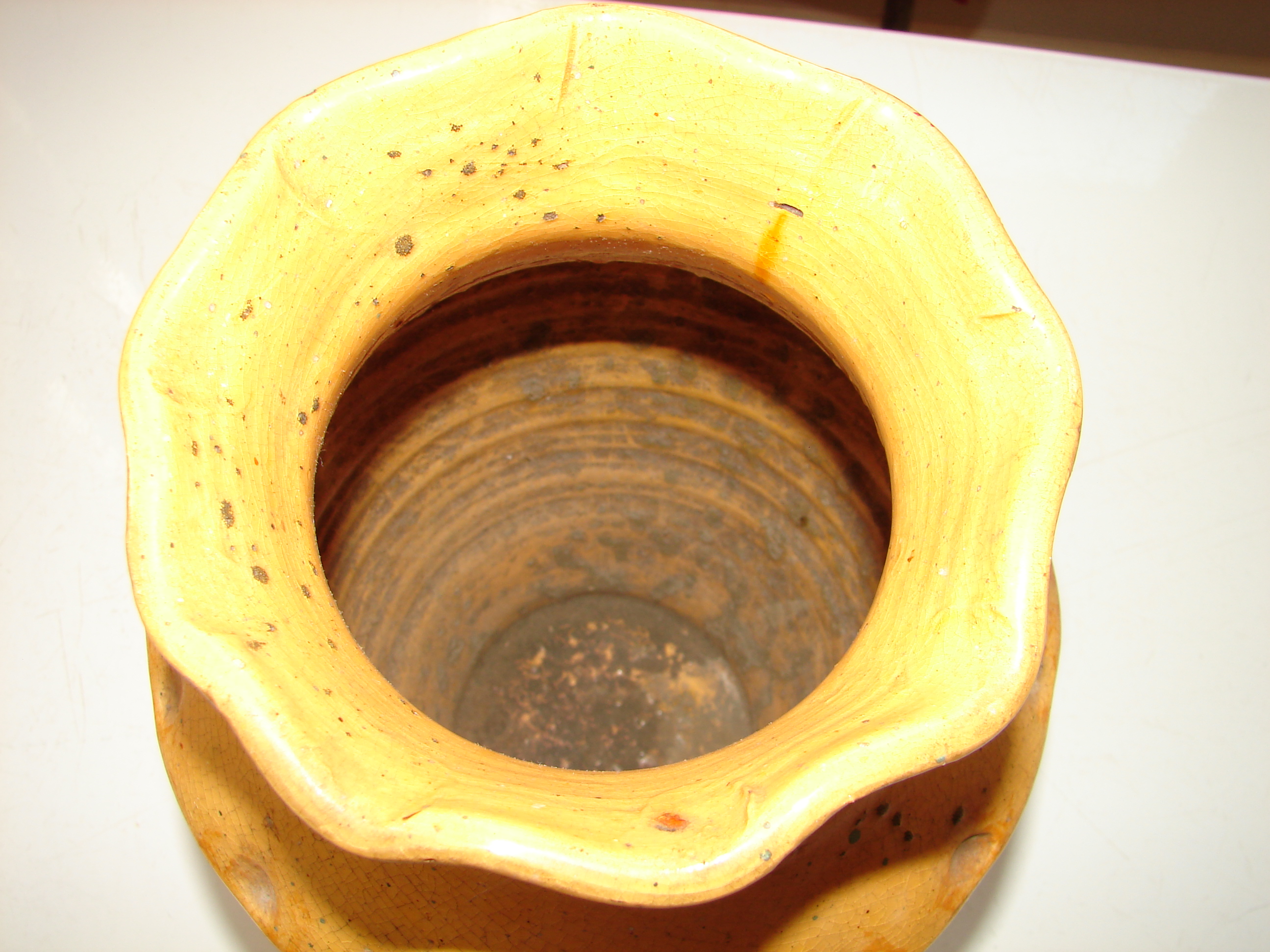 Vintage pottery fluted vase Unknown maker, it has some crazing and paint coming off. It is a very old vase I think it is cement or sandy substance. It is approximately 10" tall the widest part around the middle is 22". It has no markings, please review all photo's. It does need cleaning but will leave that to you.