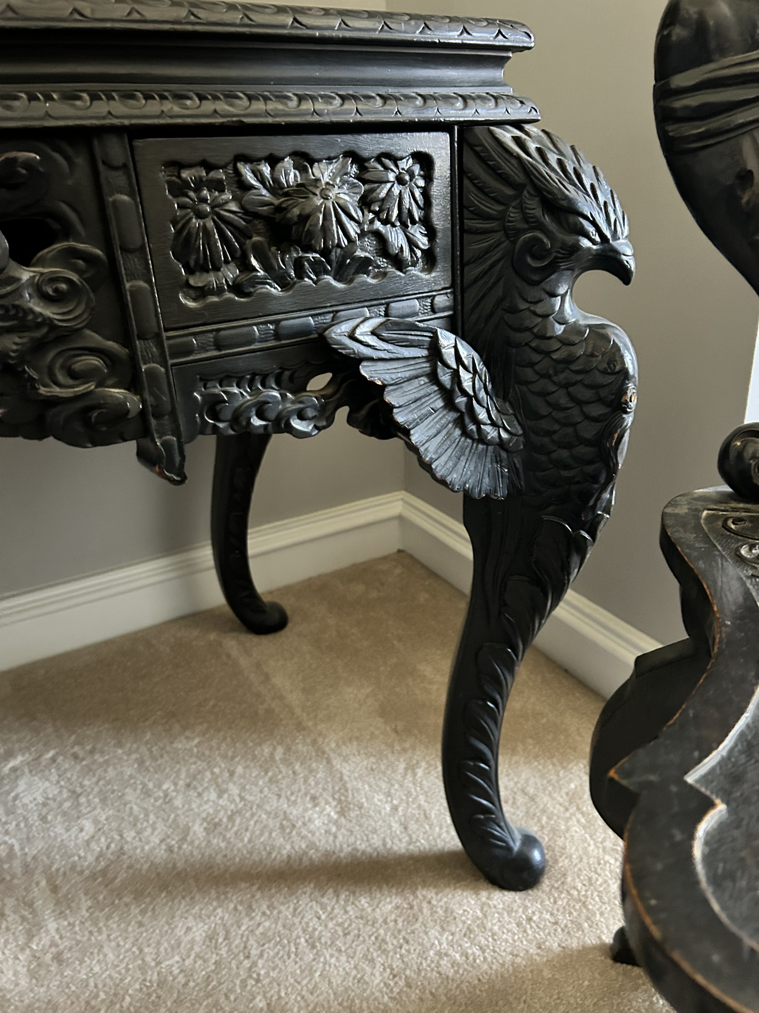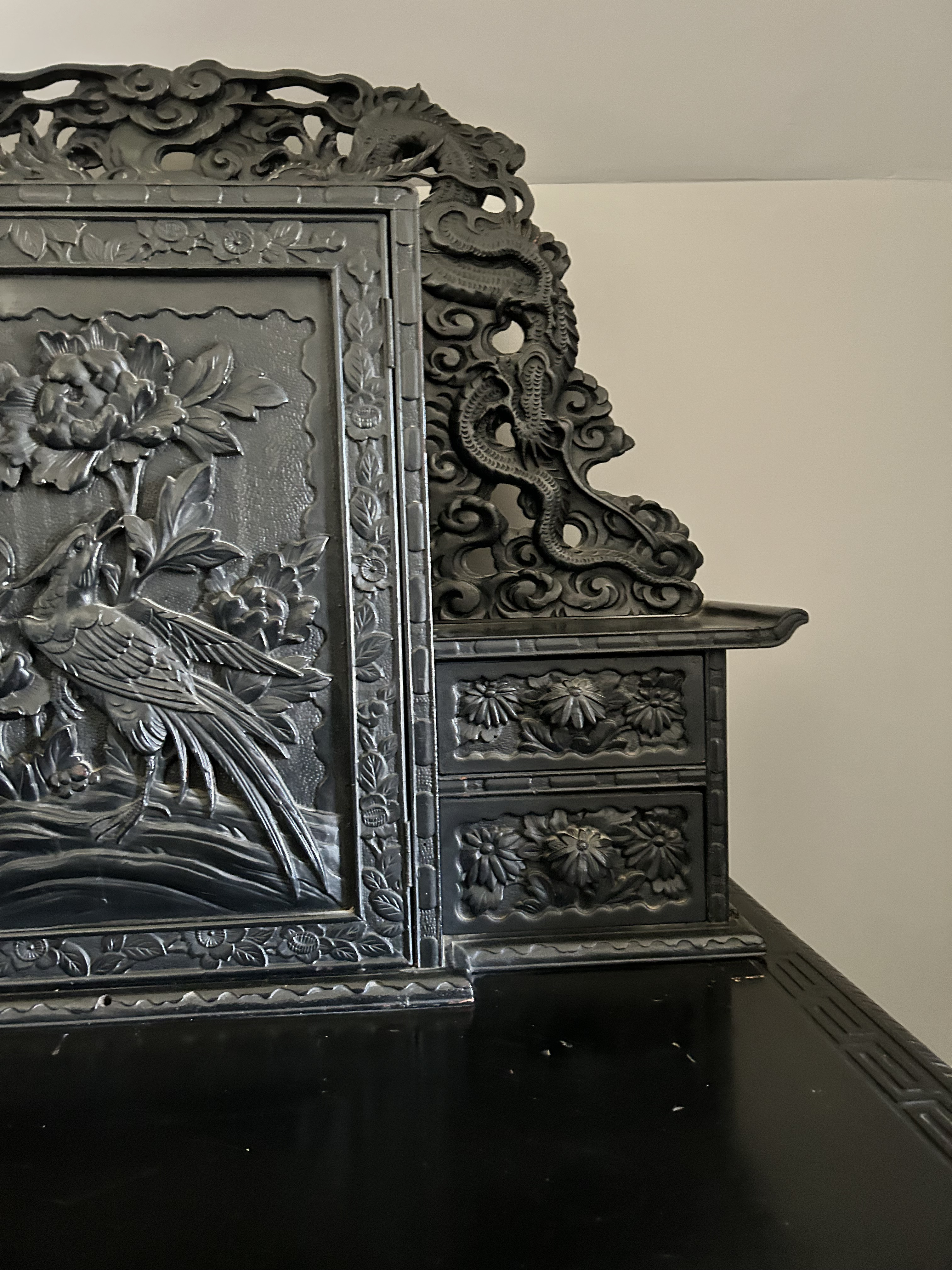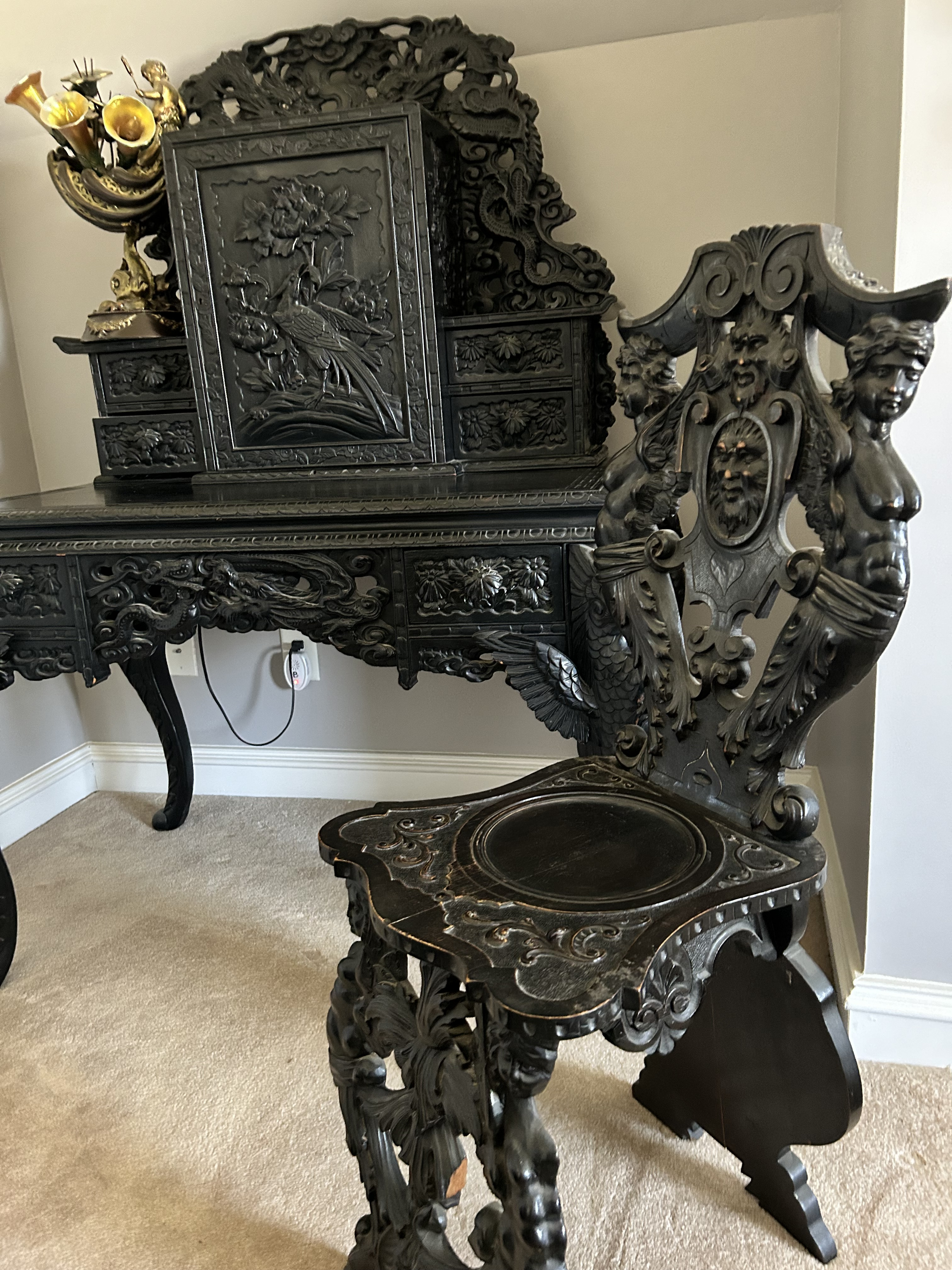 Antique (864y/o) Ebony wood, hand carved Japanese writing desk with matching chair. The drawers and center cabinet are in perfect working order.