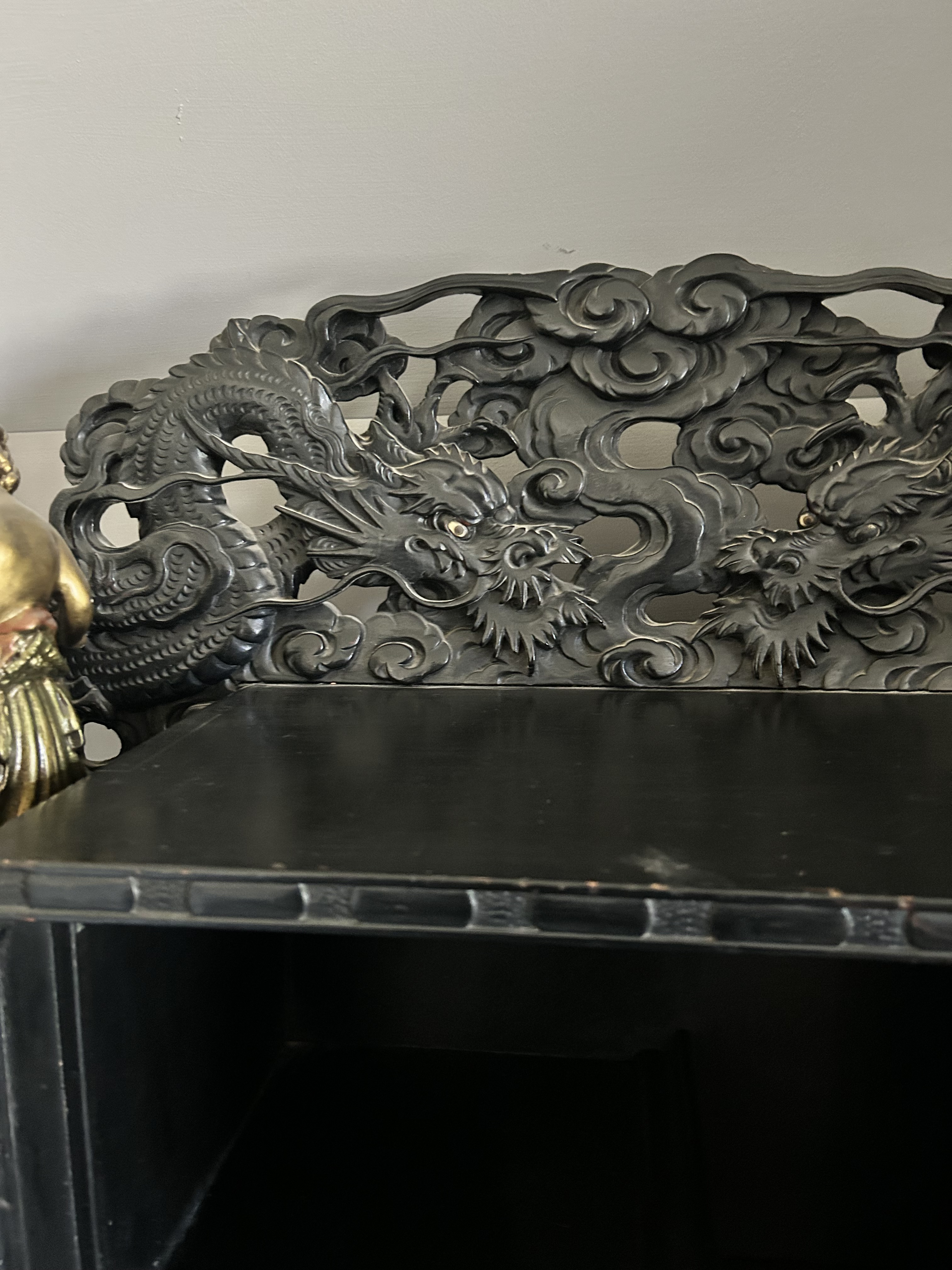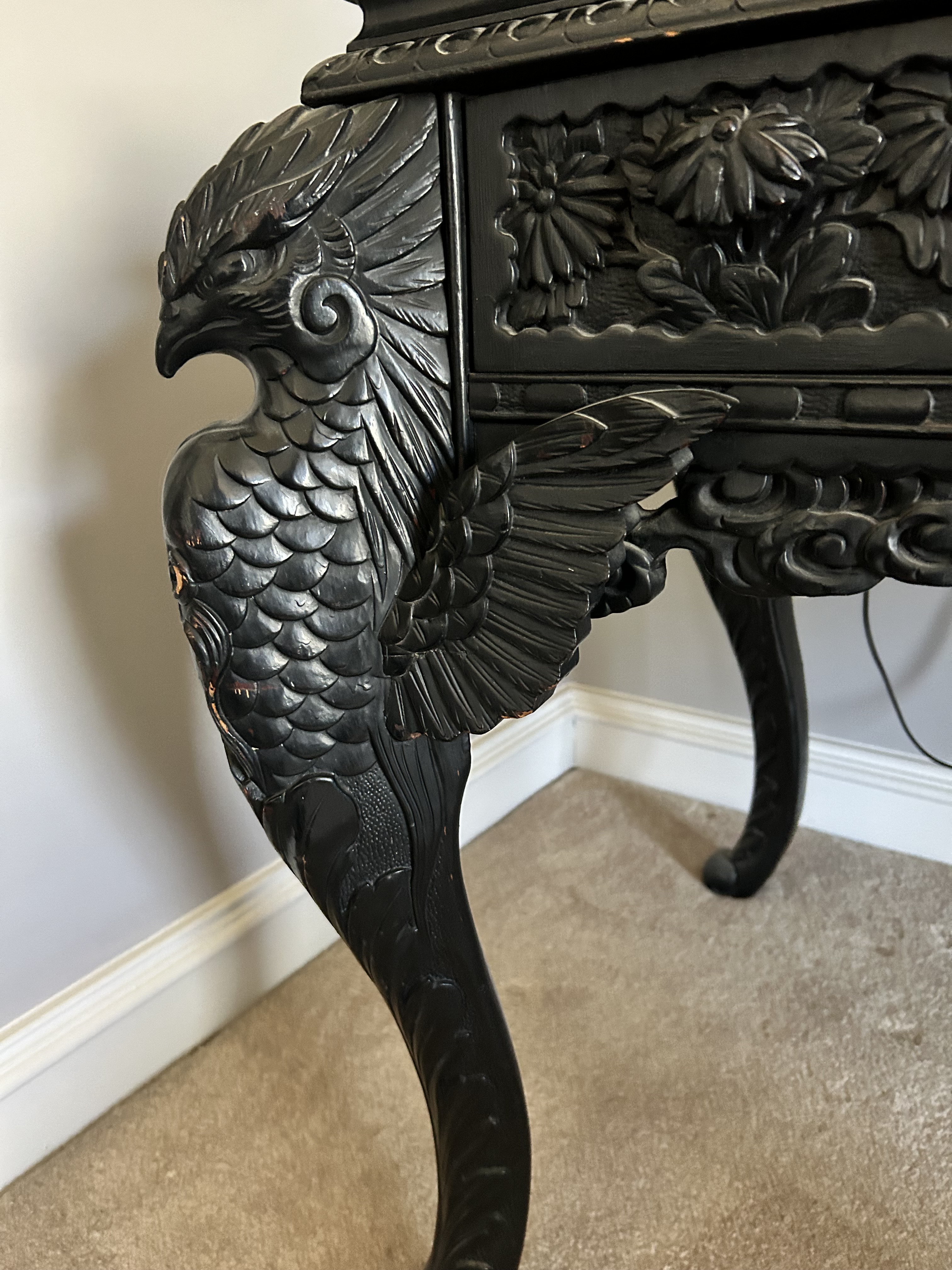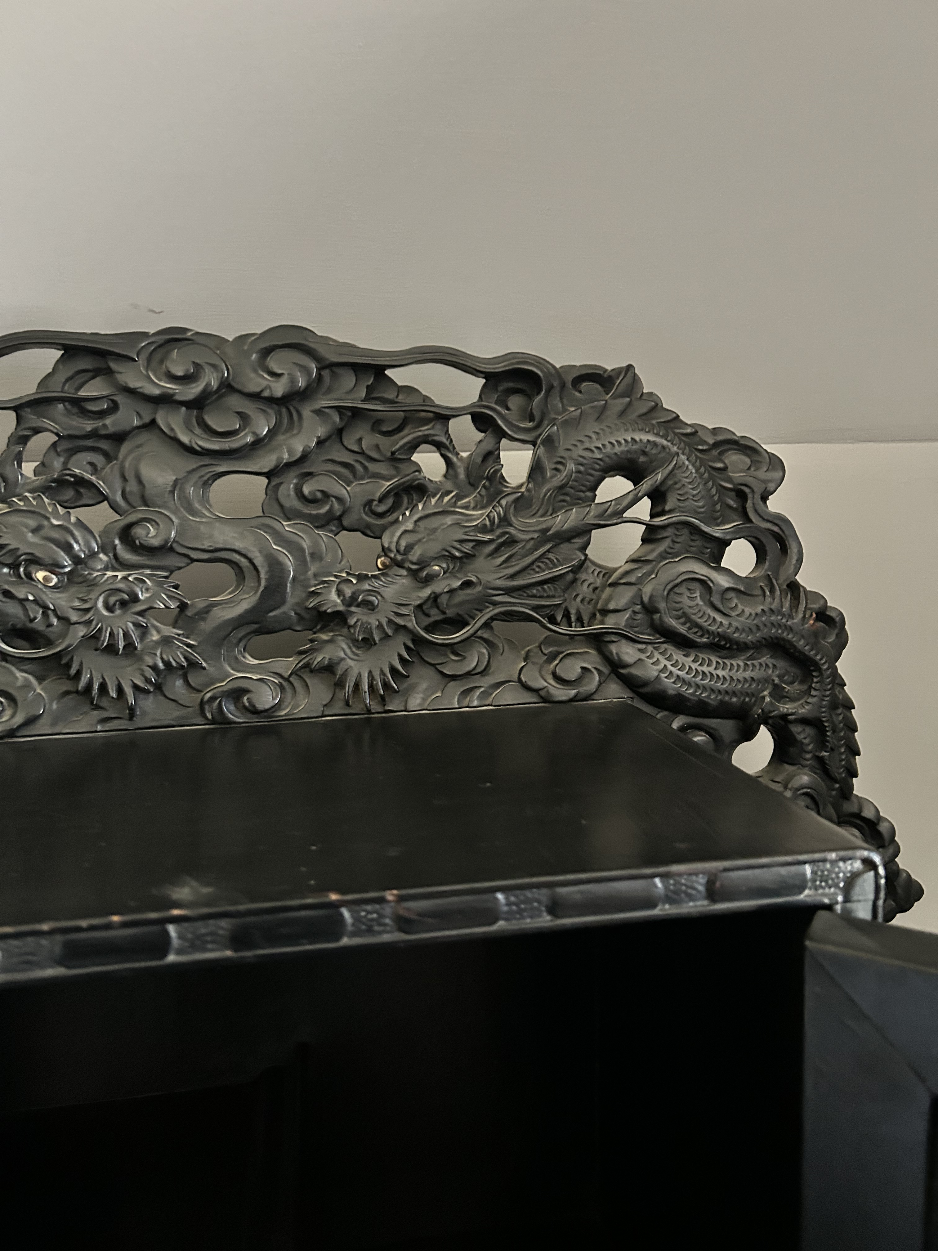 Antique (864y/o) Ebony wood, hand carved Japanese writing desk with matching chair. The drawers and center cabinet are in perfect working order.