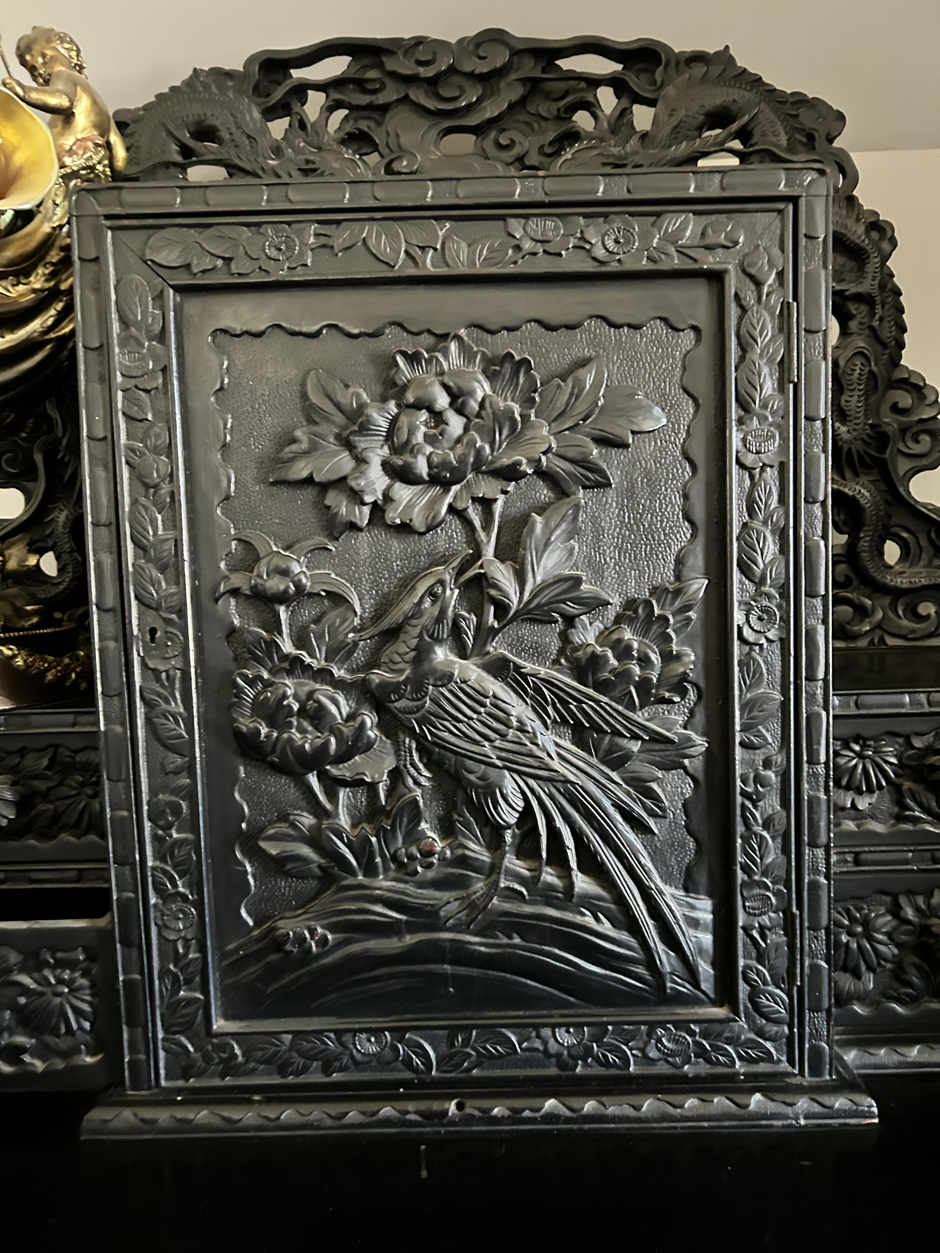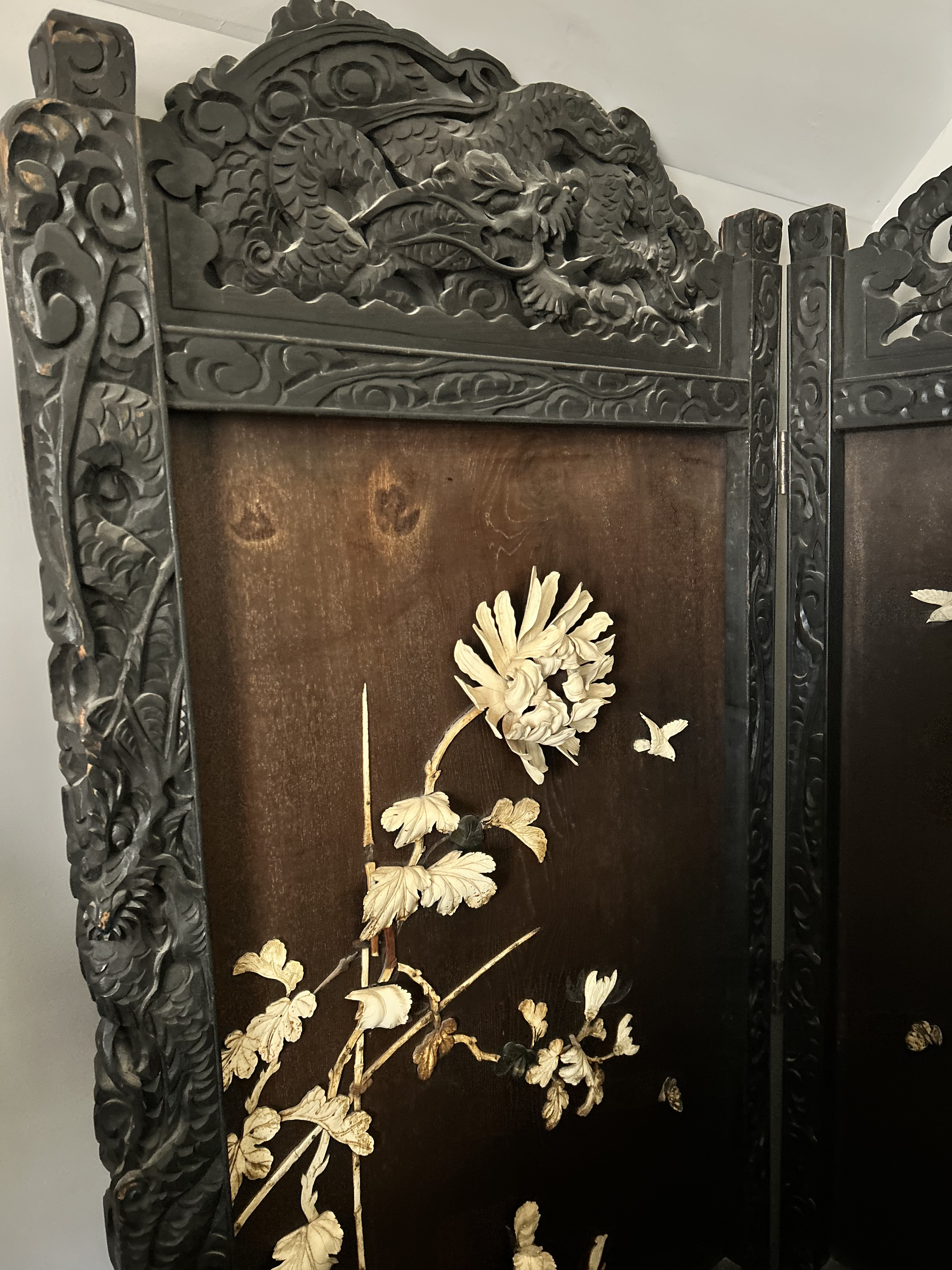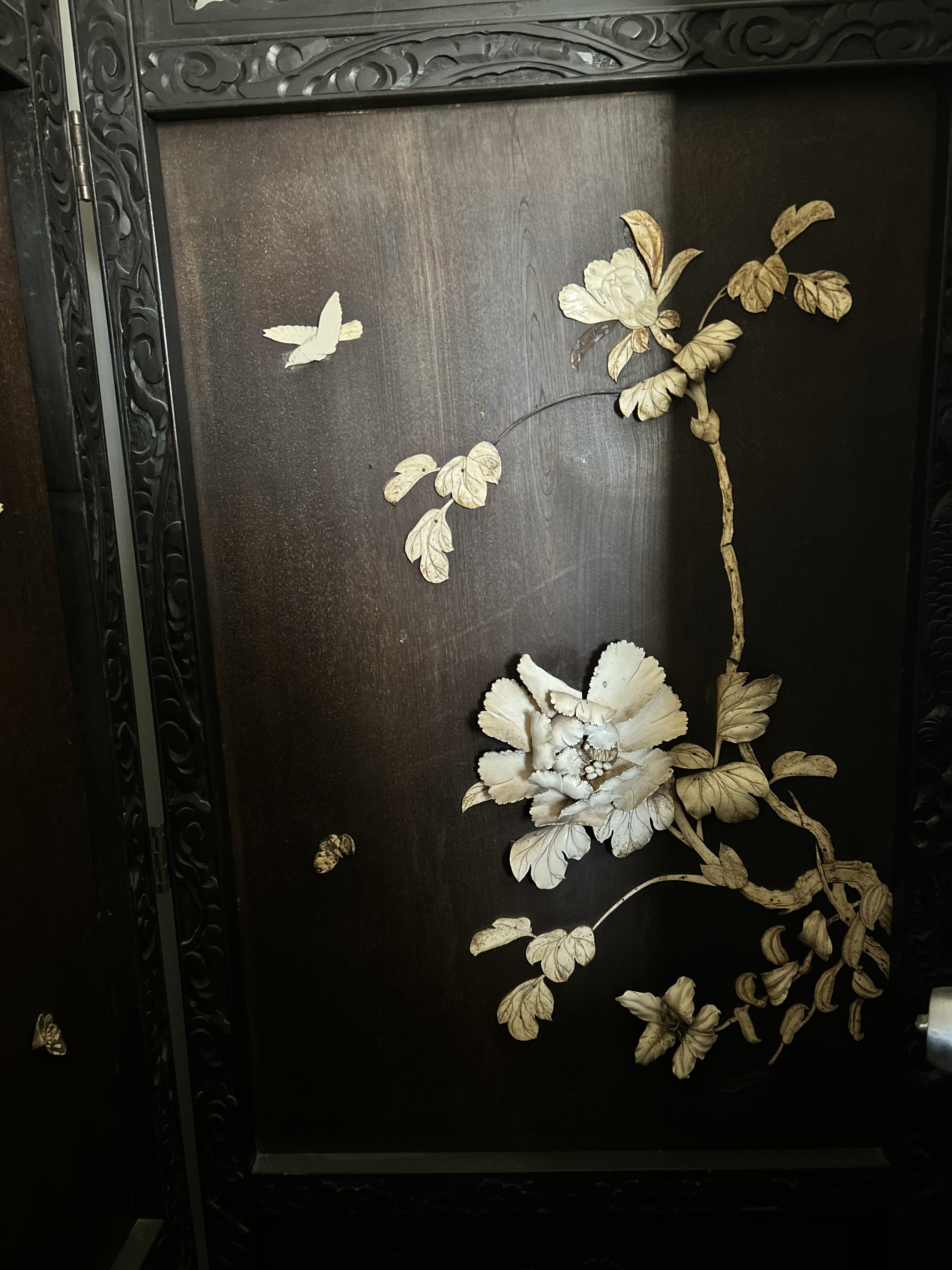 Matching the desk is an ebony wood, hand carved antique bi/fold panels with carved ivory floral, bird and leaf design. The bifold panels are hinged and on wheels.