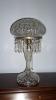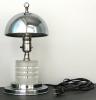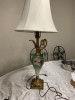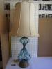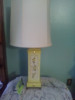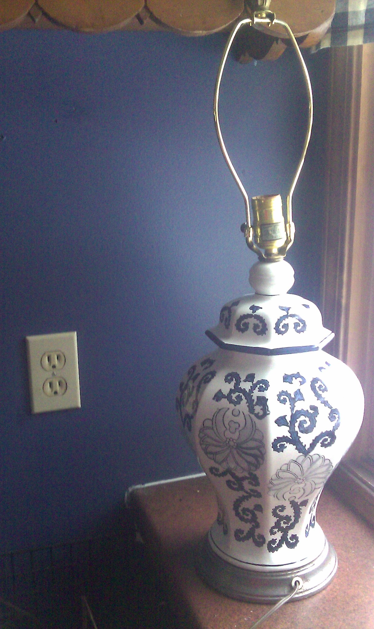 This is a working glass table lamp. It is white with a beautiful blue floral pattern on the octagonally divided glass stand. It has a metal base. There is a label on the bulb socket stating "underwriters laboratories, Inc, UL listed, portable table lap; issue no. D-6709; and under that E-24158. It has an older looking electric cord and plug. Although it does not have a shade, it has the shade wiring and screw atop.