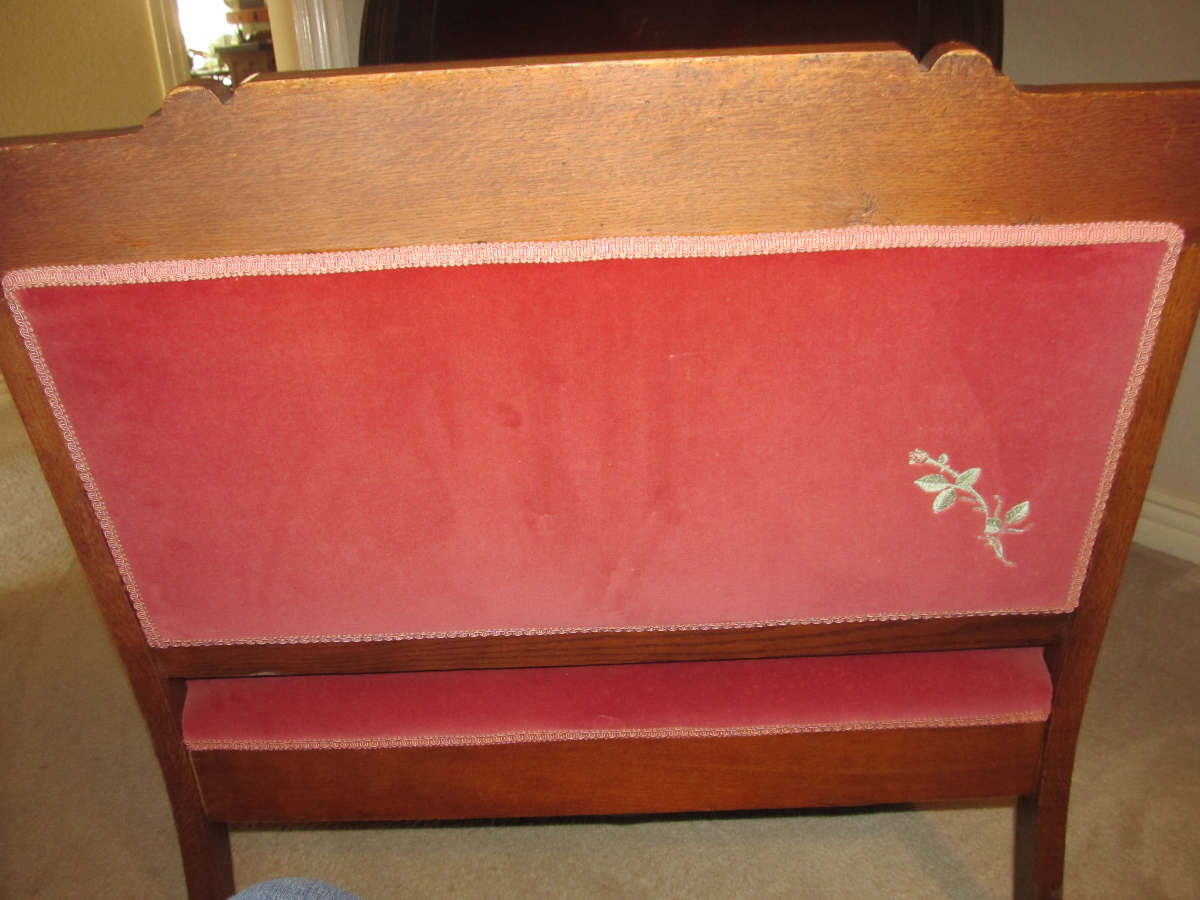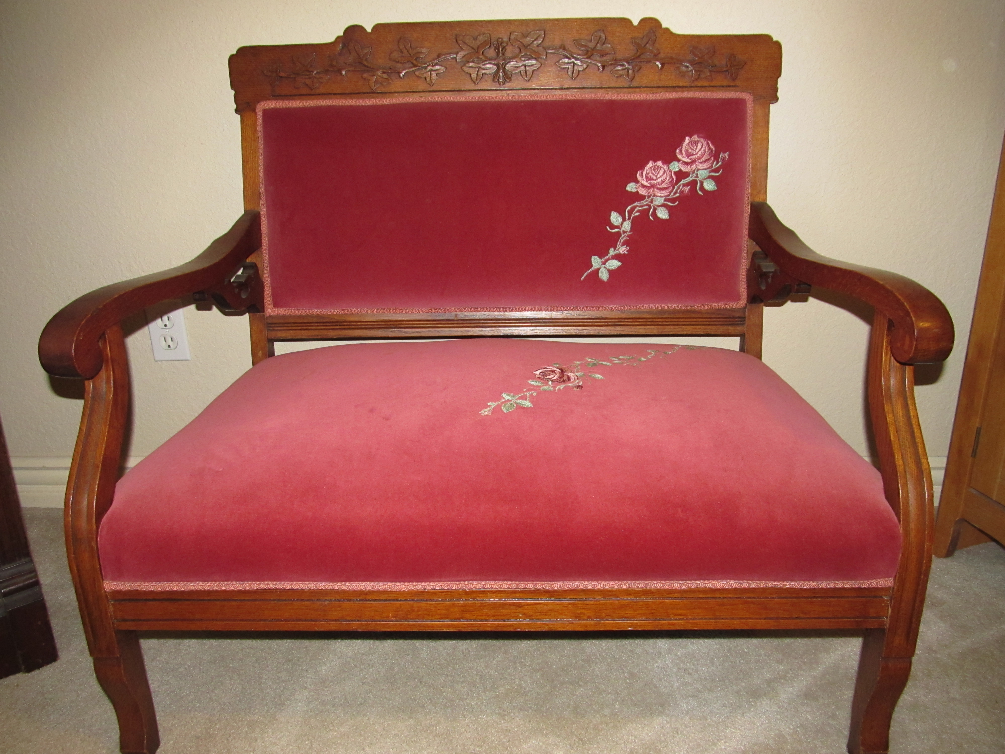 Nice little settee.  Is it Eastlake?  I have looked at tons of settee pics online and couldn't find exact "woodwork"  that is on this one.  I am thinking the fabric is original.  No tears, still in great shape.