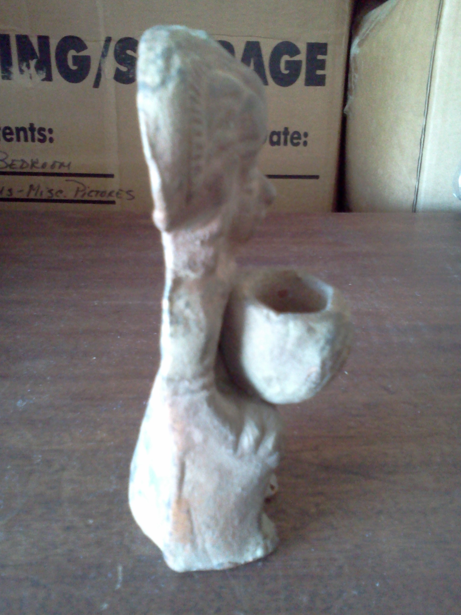 I'm not sure what these two items represent. Long ago (30 years) a friend borrowed money (haven't seen him since so I consider these "mine") and left me his box of "valuables." He claimed that he dug these up during an archeological dig in Northern San Diego County...I think Palomar Mountain or Borrego areas. The "Indian" doesn't really look Indian, but I don't know what else it could be. It is made of some type of metal,,,yet has a dark brick red color (it isn't brick material) sprinkled with darker colorations, No distinguishing marks or "seams" apparant. It is just under 5" in height and weighs less than a pound. Looks very old...not sure if it is anything of value or just a piece of old junk.