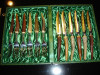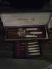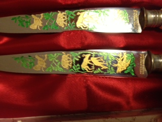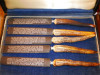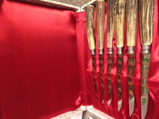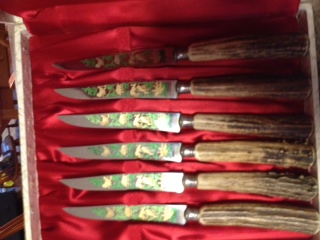 Vintage 6 pc German staghorn etched steak knife set by Anton Wingen Jr. in original red satin lined box. Brought from Germany by my Aunt & Uncle ~1965. Knives are in excellent condition. Used once or twice.