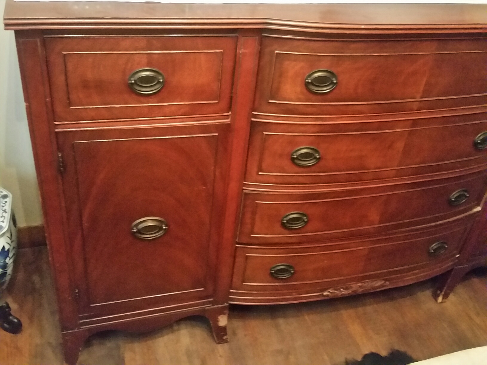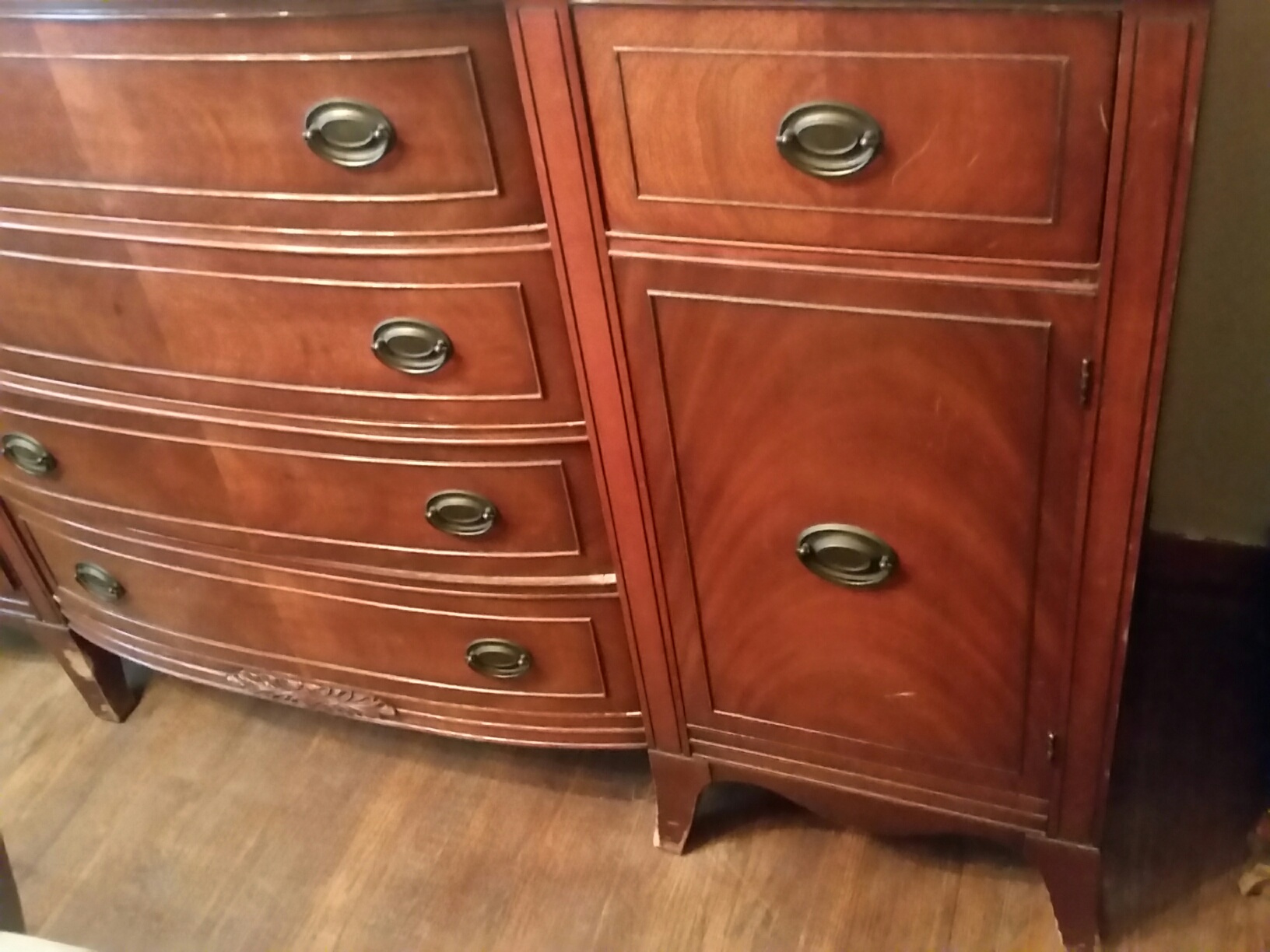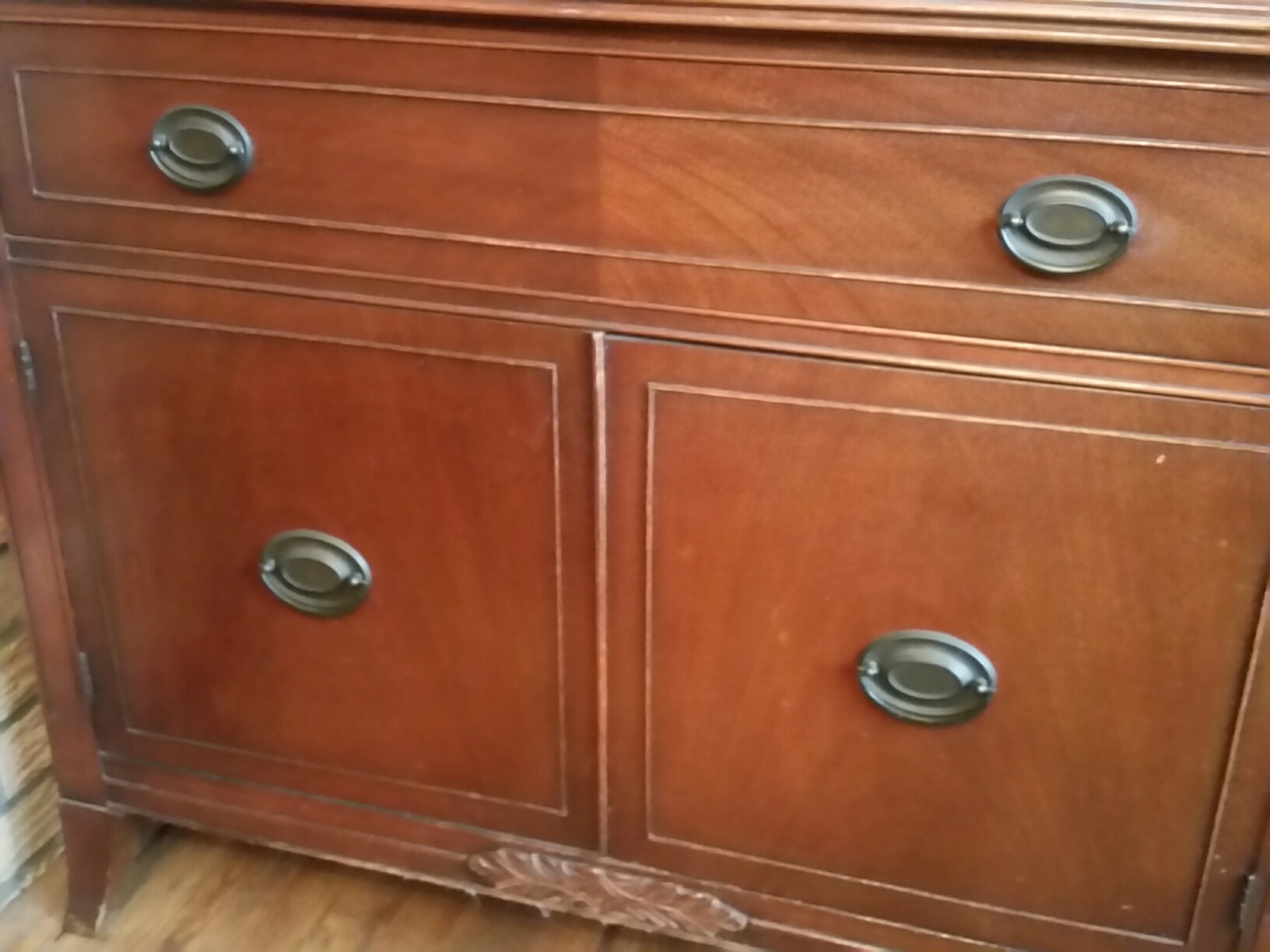 The 2 top drawers of the buffet are felt lined. The pieces are in good condition with some wear on the legs.