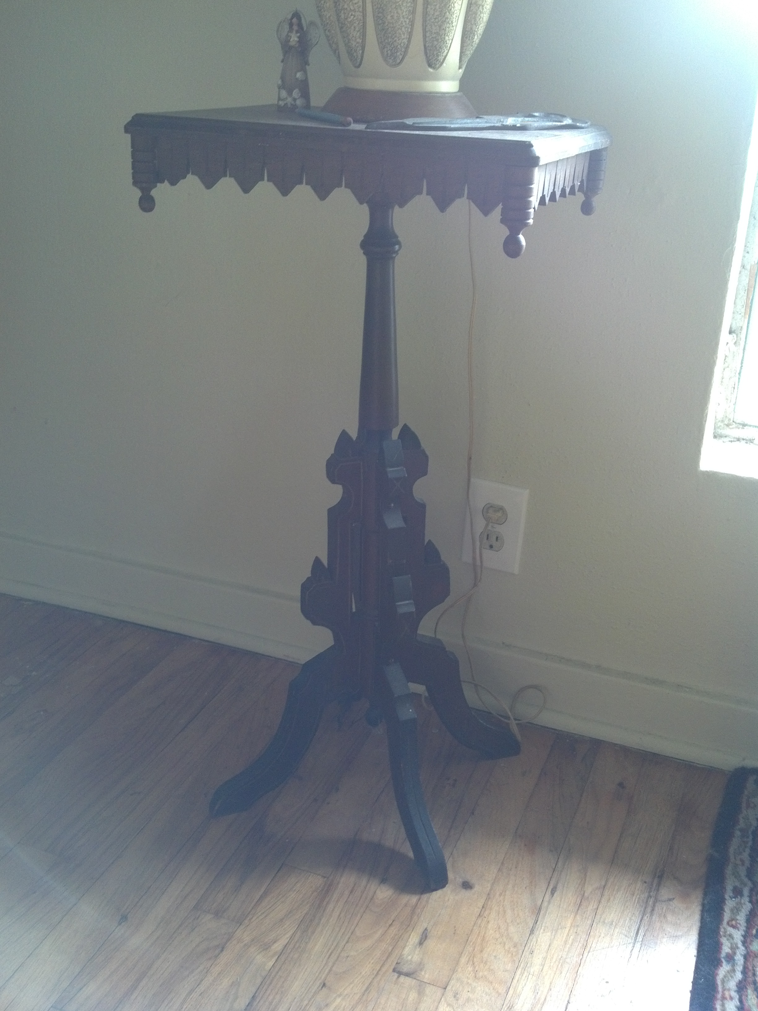 I found this table at a home sale located at a circa 1835 house in the Corn Hill neighborhood of Rochester, NY. The home was being sold, and the owners were also looking to sell some of their many furniture pieces and other antiques. The home was and still is furnished with period pieces, but it's hard to say how many of these are intrinsic to the house an whether or not this table had belonged to an original owner (the home was built by a successful French fur trapper as a gift for his parents).