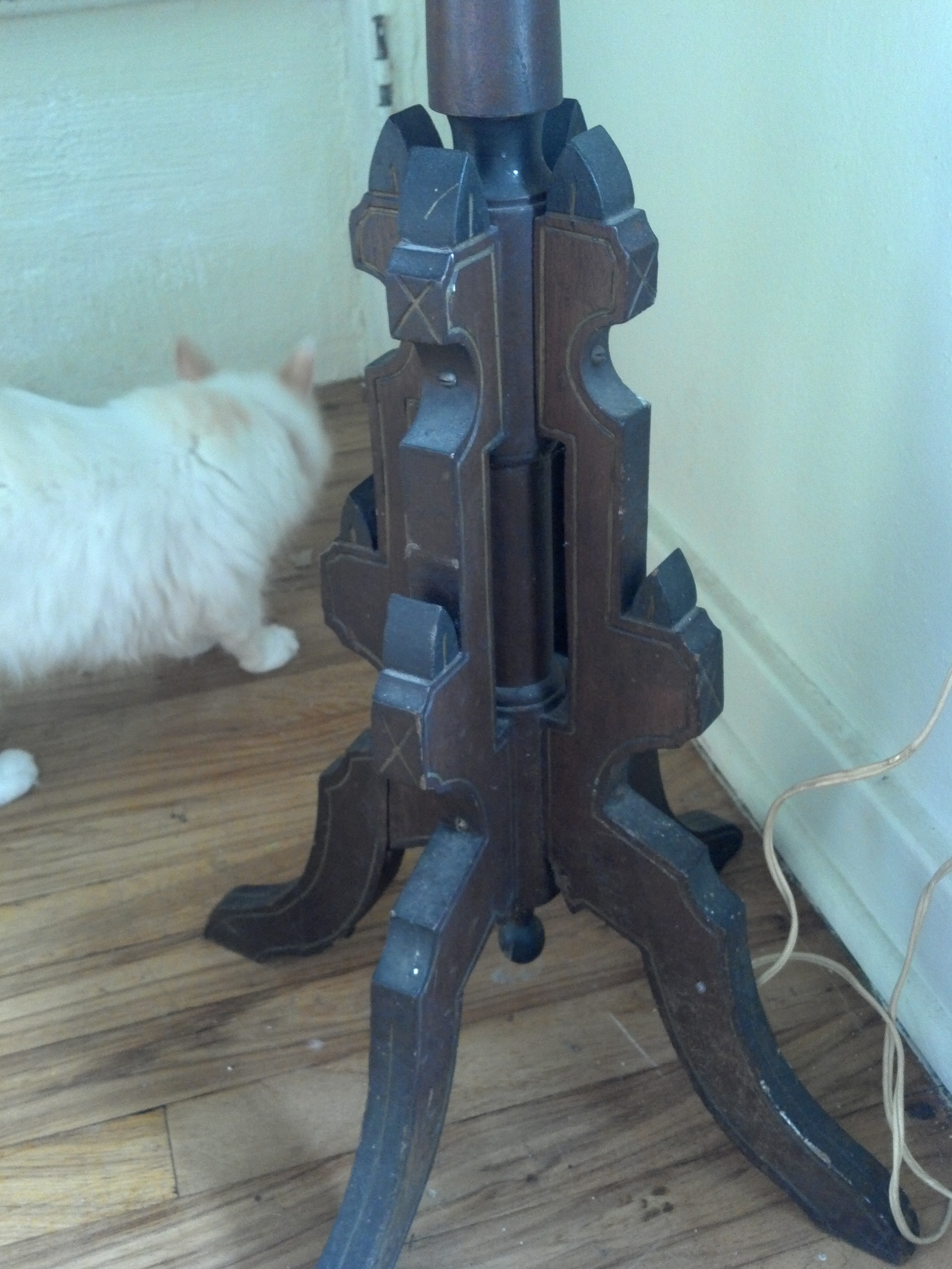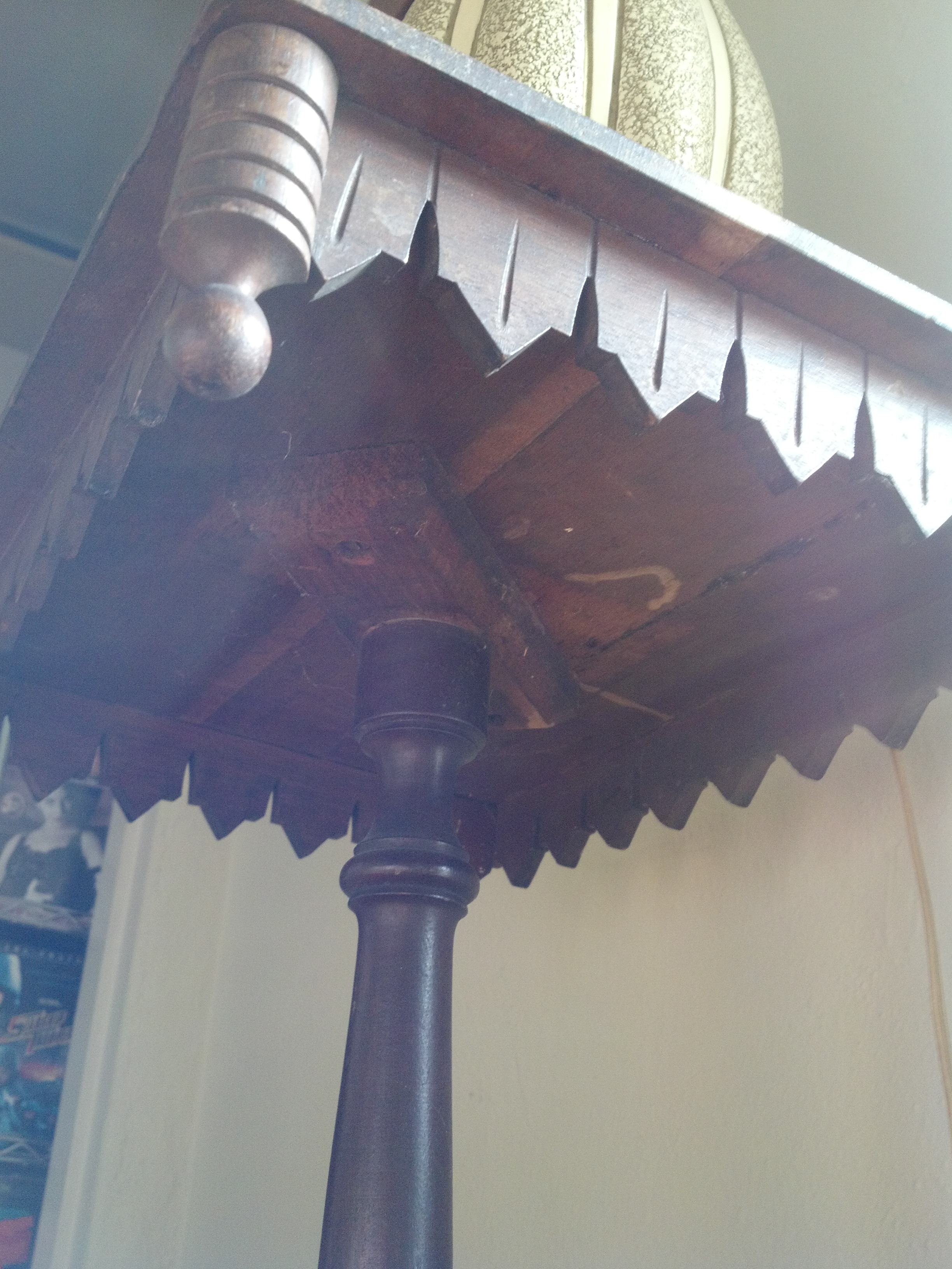 The condition is not good; one of the cylindrical pieces hanging from the corners of the table top is broken off, the table top itself is not very securely connected to the base, and it looks like at some point quite a long time ago one of the base's feet had been broken off and repaired, using the original foot (not a replacement piece).