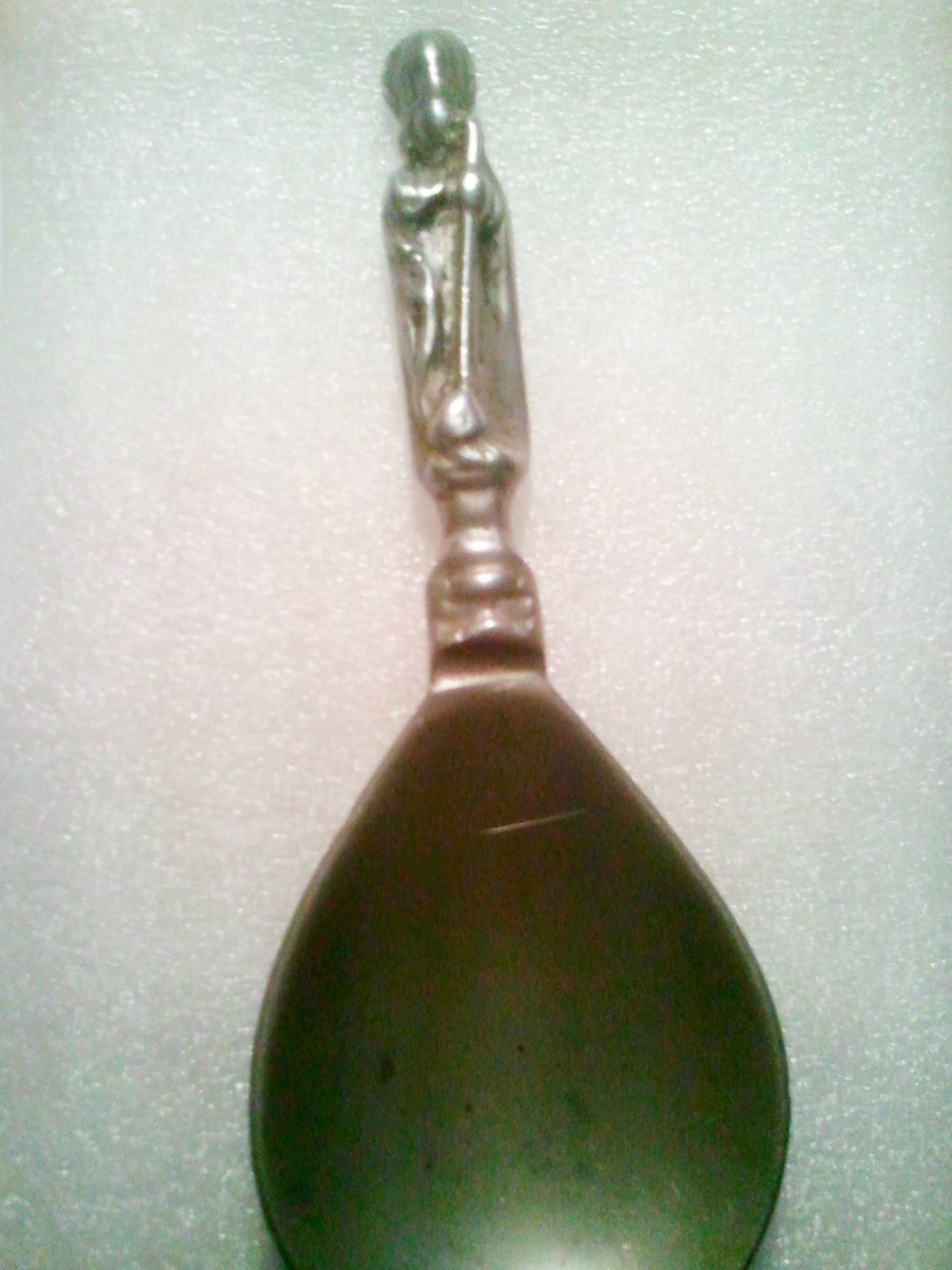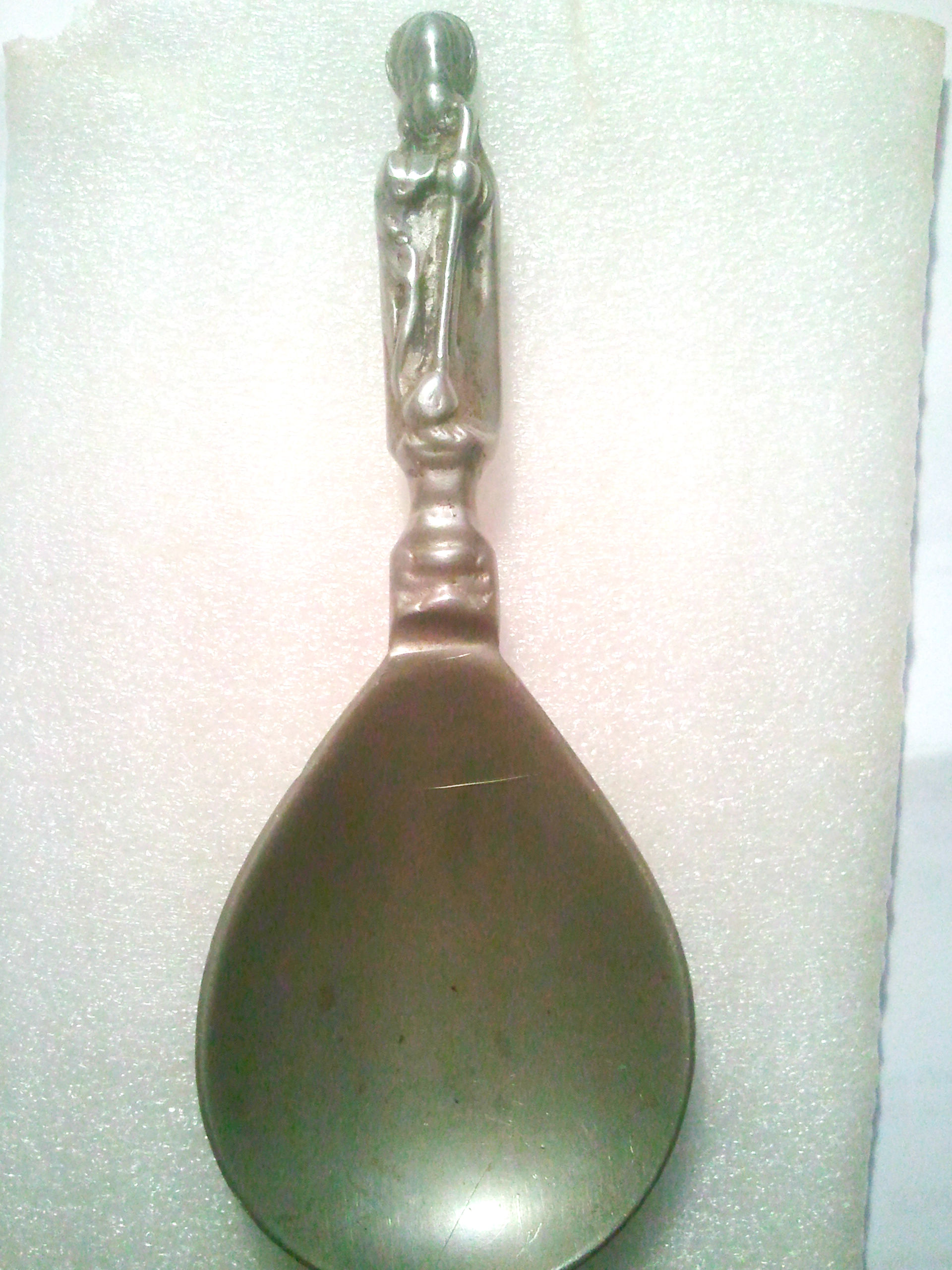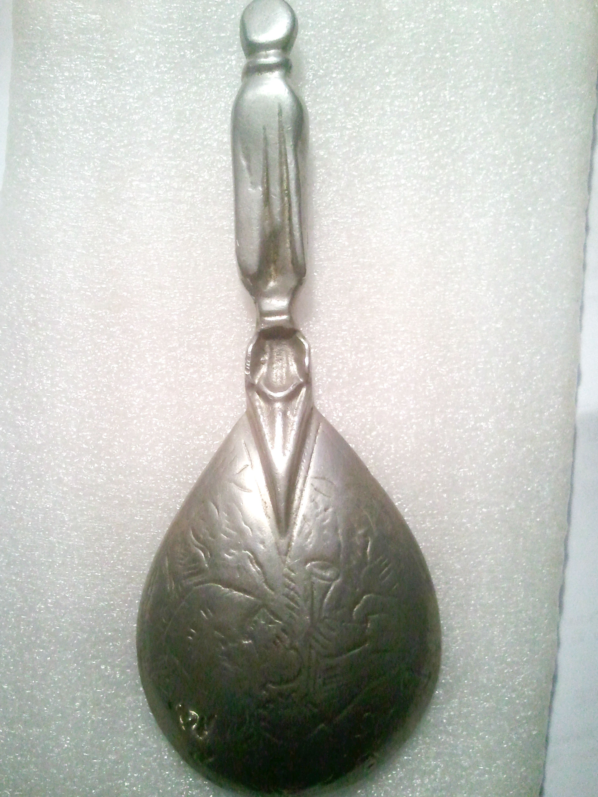From what I can gather, the item appears to be an apostle's spoon, which were given as baptismal gifts to the children of aristocrats from the late 1400s until the practice went out of style in the mid nineteenth century. Given the shepard's staff that the figure on the handle is holding, this particular spoon appears to be in honor of Saint James the Greater. The back of the bowl has several markings. I'm not sure if you can see this in the images, but one the markings is the number 15, and directly opposite is the number 14. My hypothesis is that this represents the year 1514. There are some other markings as well, but they are hard to make out, however they are listed in the distinguishing marks section. One appears to be a cross hatched W. From what I can gather this means it was made in an English foundry.