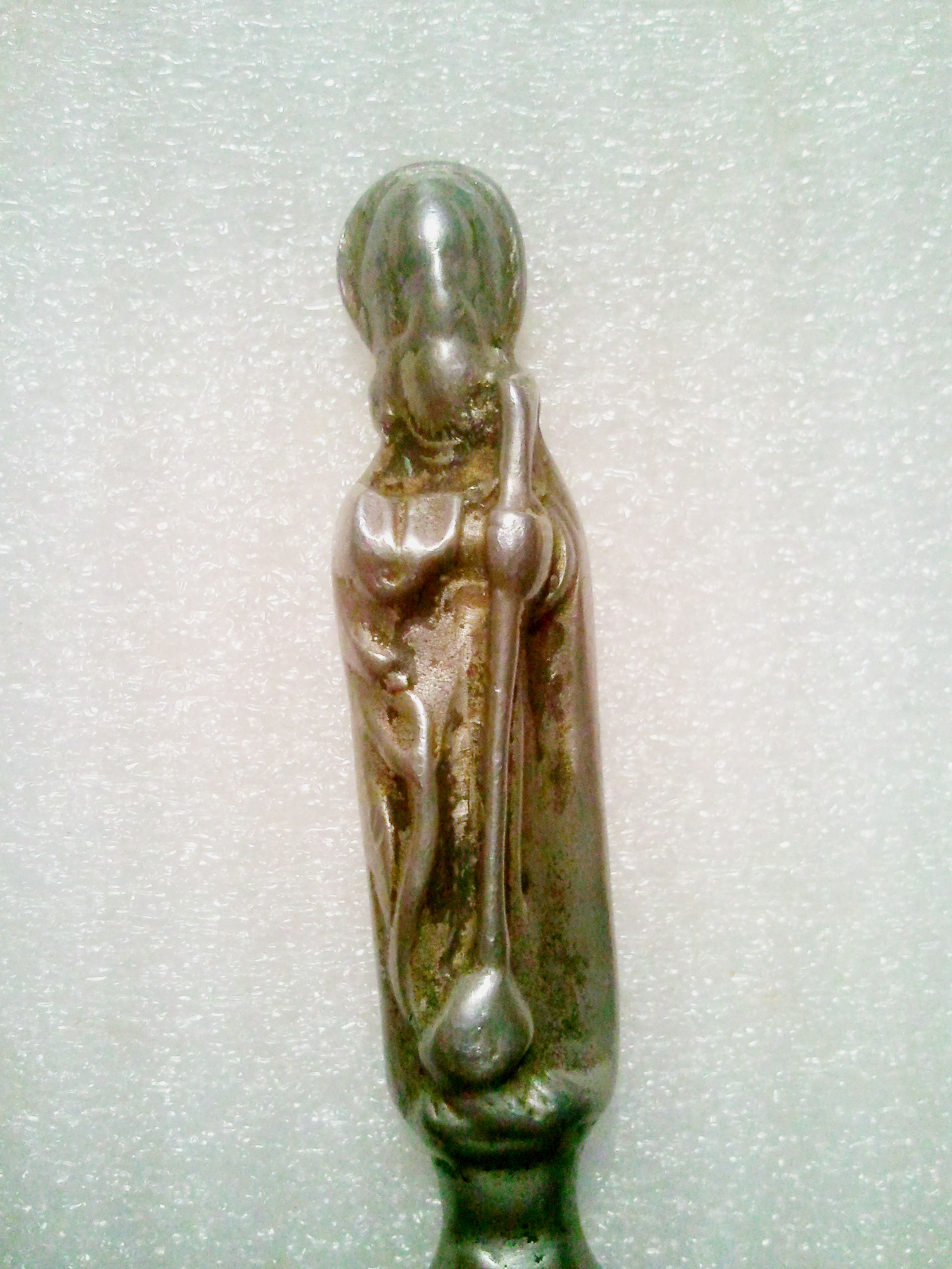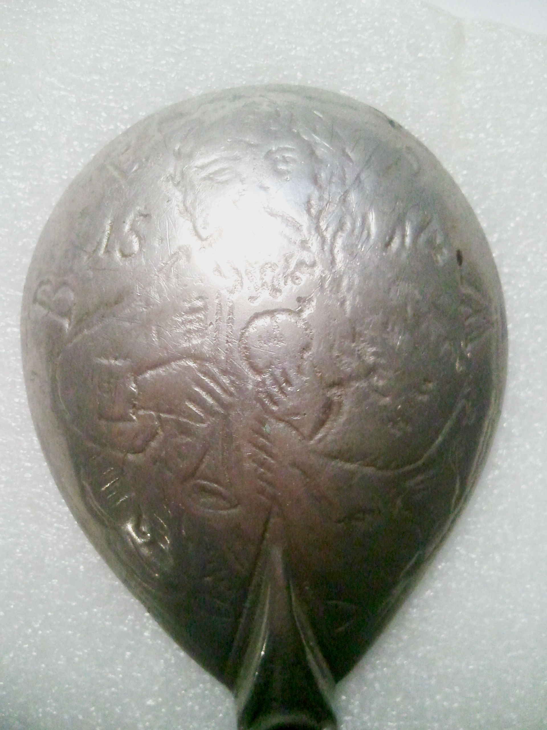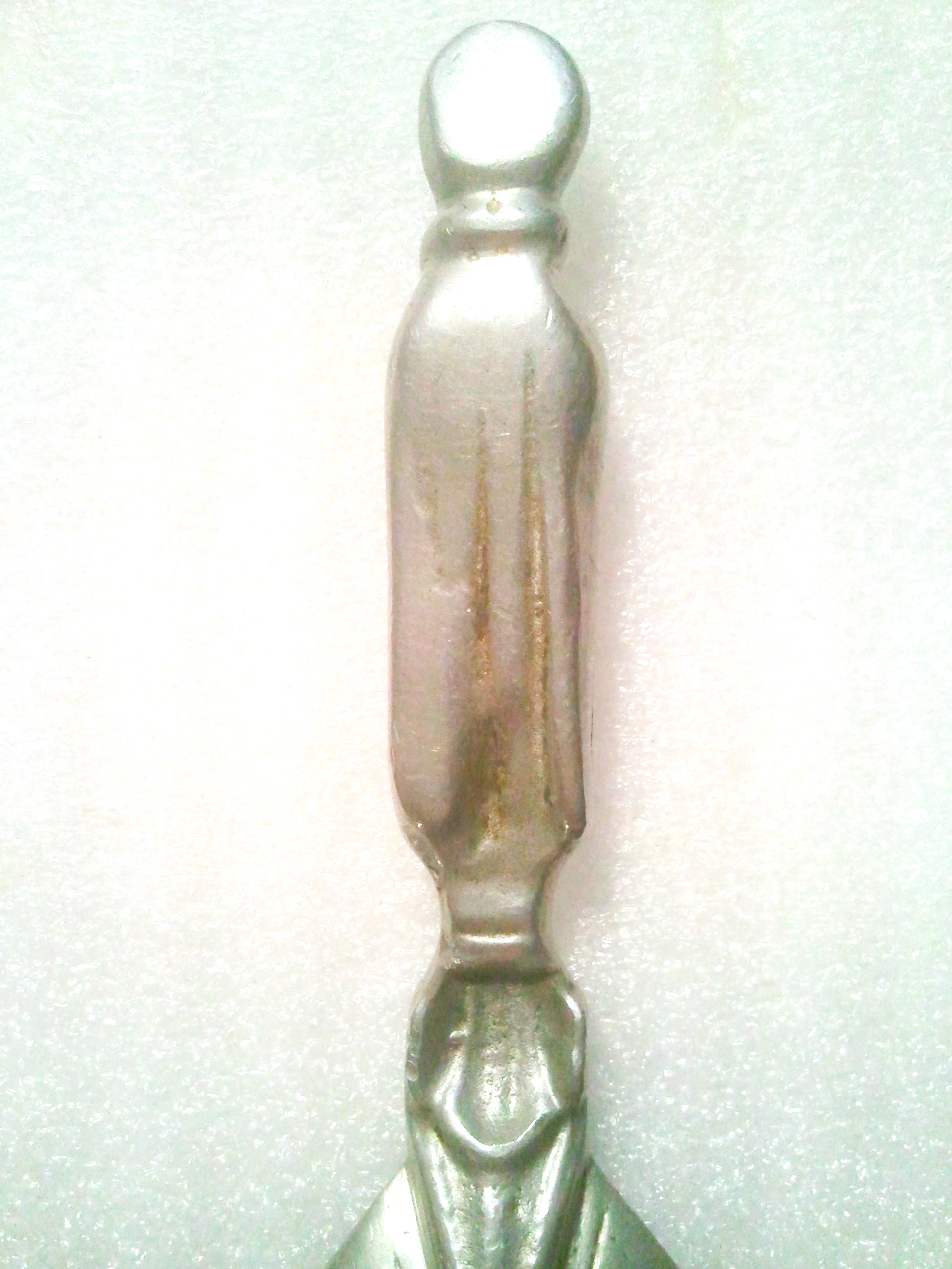 From what I can gather, the item appears to be an apostle's spoon, which were given as baptismal gifts to the children of aristocrats from the late 1400s until the practice went out of style in the mid nineteenth century. Given the shepard's staff that the figure on the handle is holding, this particular spoon appears to be in honor of Saint James the Greater. The back of the bowl has several markings. I'm not sure if you can see this in the images, but one the markings is the number 15, and directly opposite is the number 14. My hypothesis is that this represents the year 1514. There are some other markings as well, but they are hard to make out, however they are listed in the distinguishing marks section. One appears to be a cross hatched W. From what I can gather this means it was made in an English foundry.