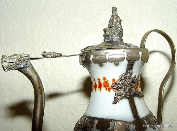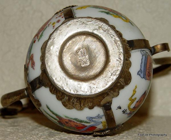 The item appears to be a White Miniature Teapot with Metal Holding/Handle: