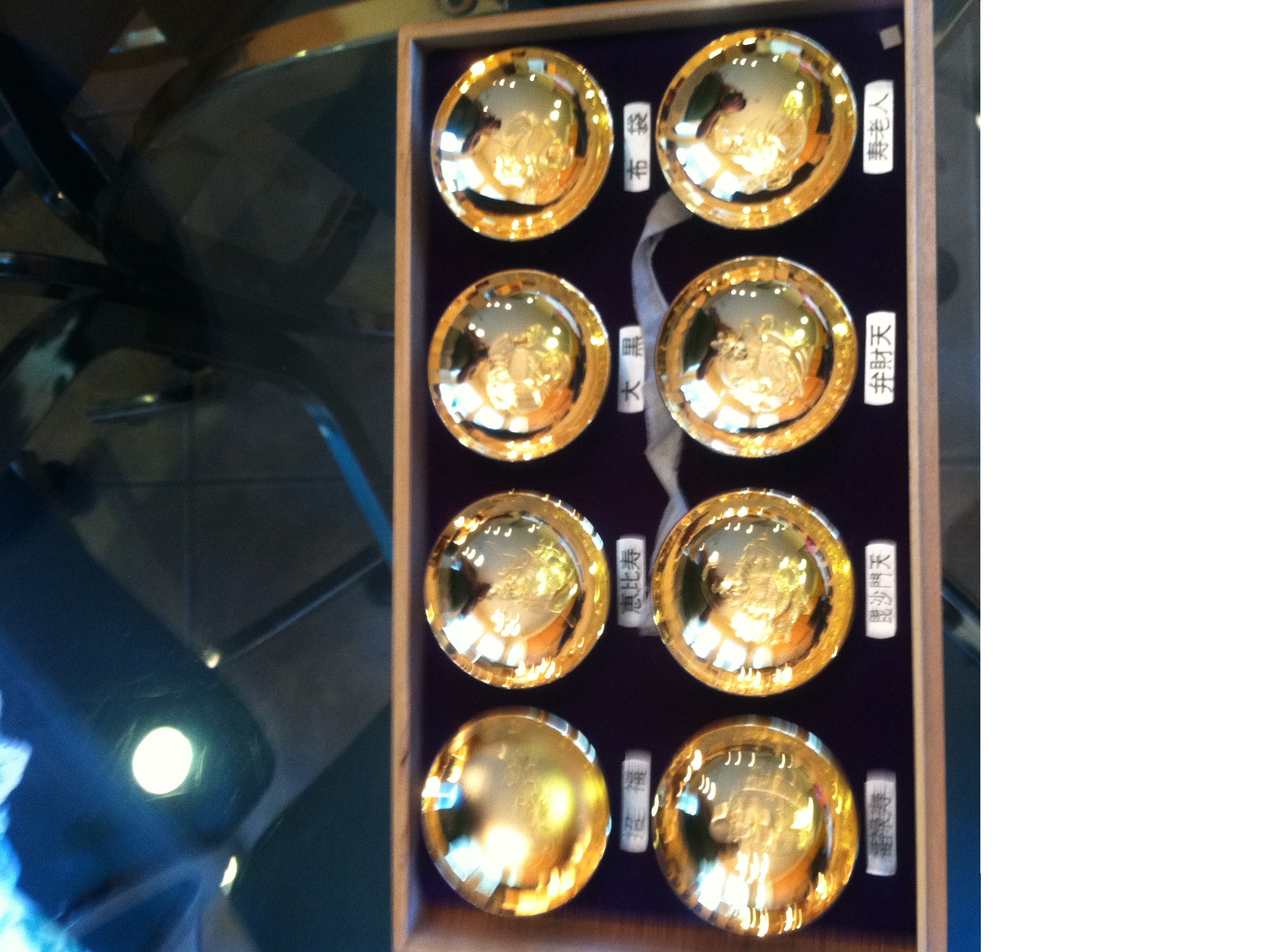 We have a japanese set from our grandmother and would like it appraised. Believe its a tea set, with 8 cups each with a carved image of a buddhist monk (each one is different). On the bottom of the cups it says "24k." I believe only the outside of each cup is gold but I'm not certain. I believe each cup weighs .8 ounces or so. I'm having trouble uploading photos so I apologize for not being able to post them. Anyway if anyone has an idea of what these are and what the appraisal value is I appreciate it.