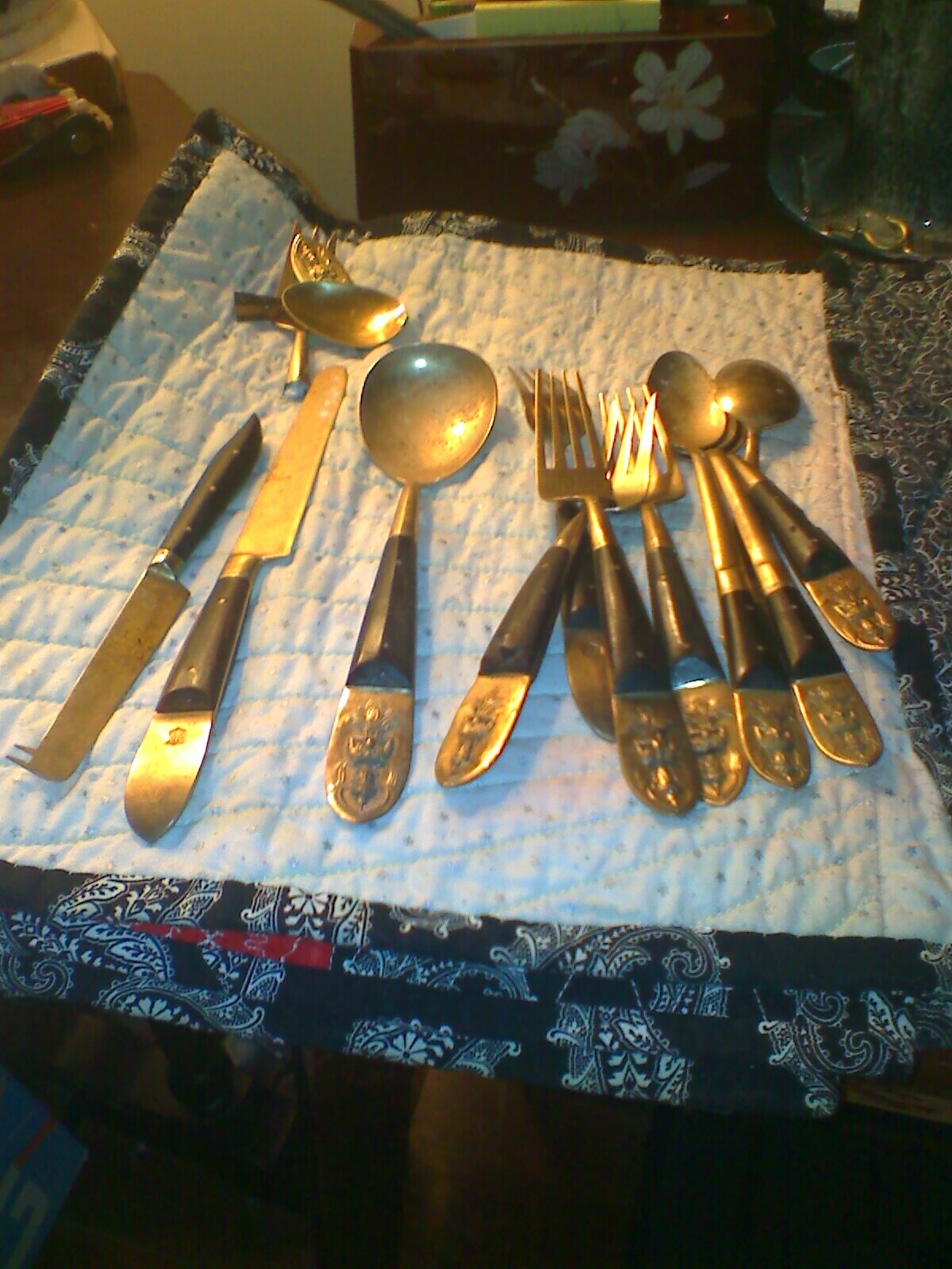 silverware from the 50's made of brass and bone. Not a full set only have 2 small spoons, 2 long spoons, 4 forks, 1 knife, one serving spoon, and one small serving knife.