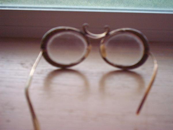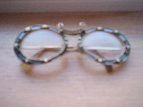 Its a pair of Christian Doir spectacles, or reading glasses, there is no karat mark that i can find, but i think it is made of gold and silver and has diamonds or other stones around rims. My guess is that they date back to the 20's or earlier because of the ecentric look about them.