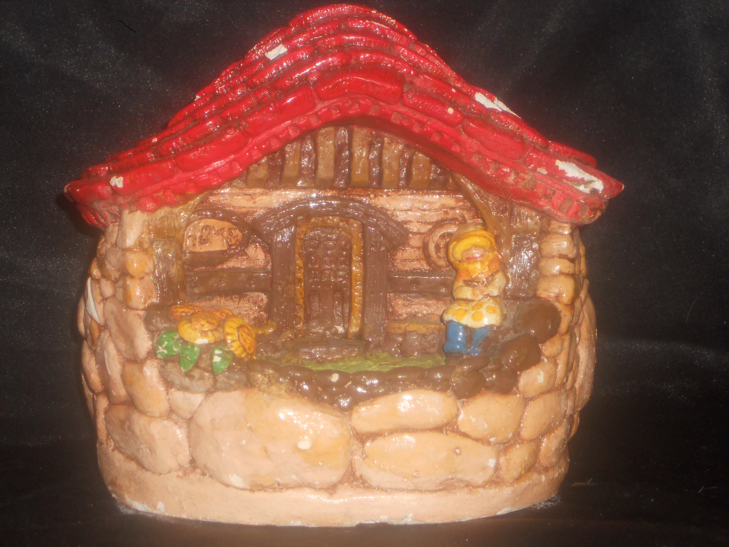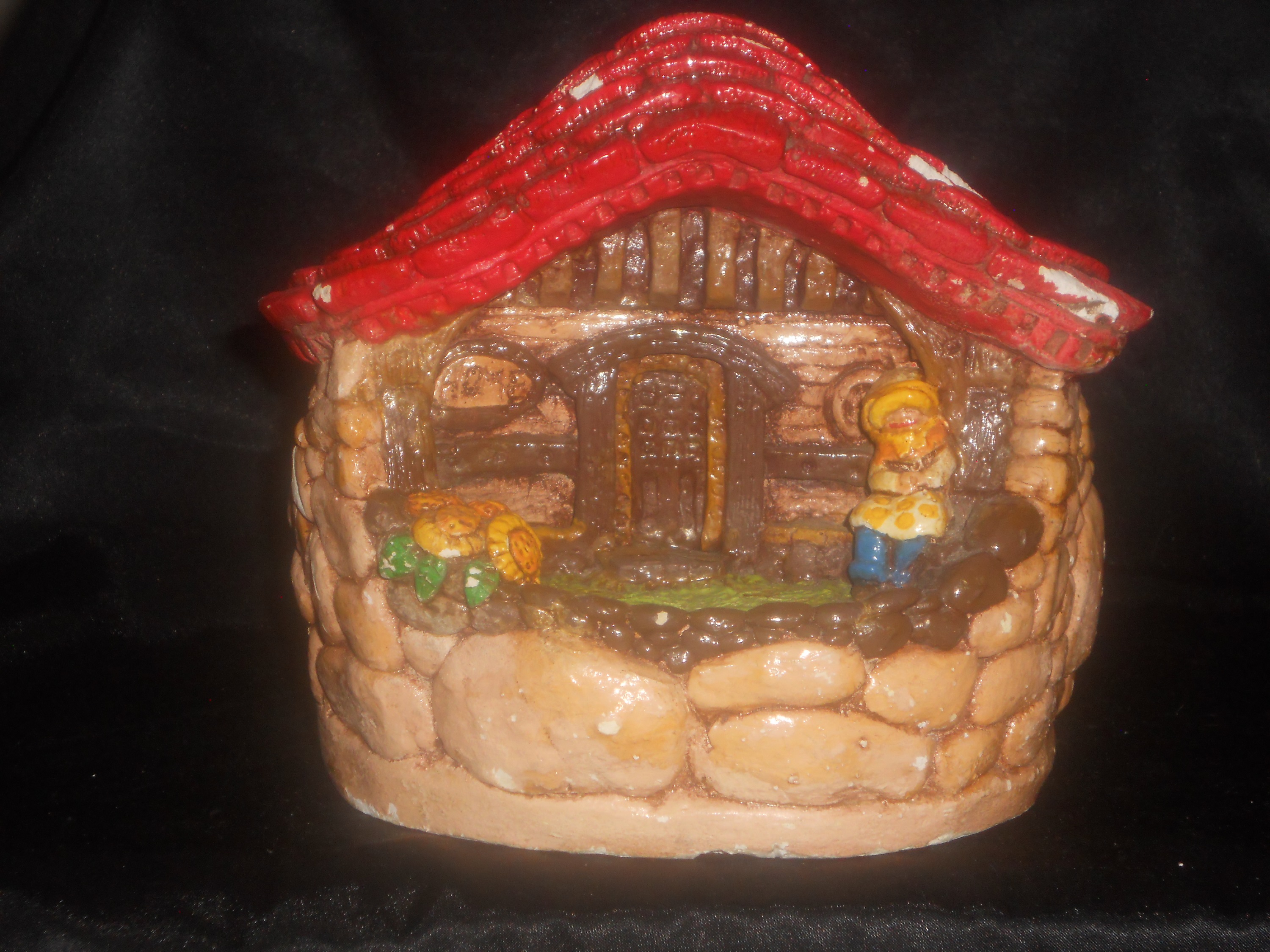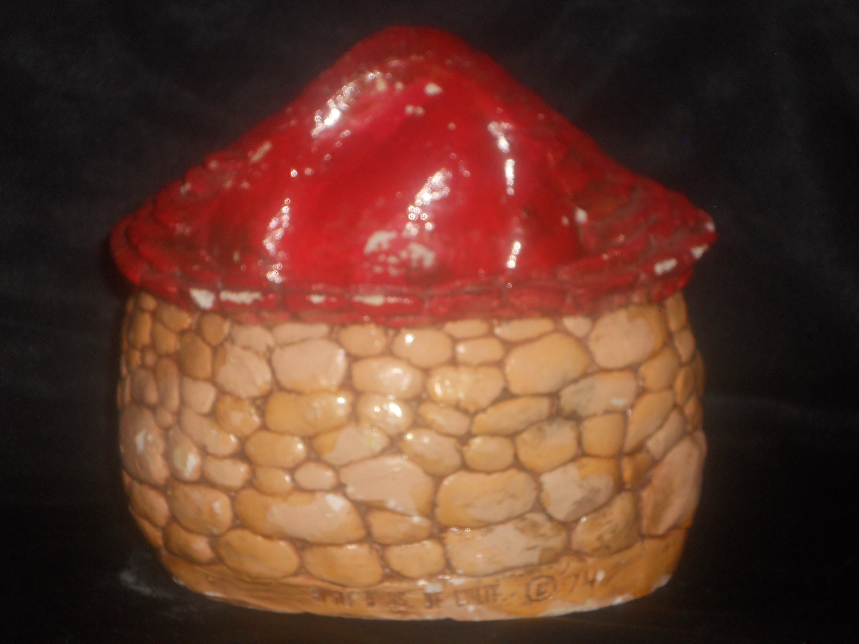 Appears to be a round cottage with a mushroom shape to it. There is a person on the porch that appears to be a female (looks like it has lipstick and a dress on). In the roof is a large indentation leading me to believe the function of this piece is as a planter of some sort. The photographs show more details than I could write. The hallmark/maker's mark is on the bottom rim on the back of the piece and is "APSIT BROS. OF CALF. (C) '74". I believe this piece is made of ceramic, but it could be plaster (I can scrape the bottom with my fingernail and get powder on my finger, but the painted parts are smooth and hard)