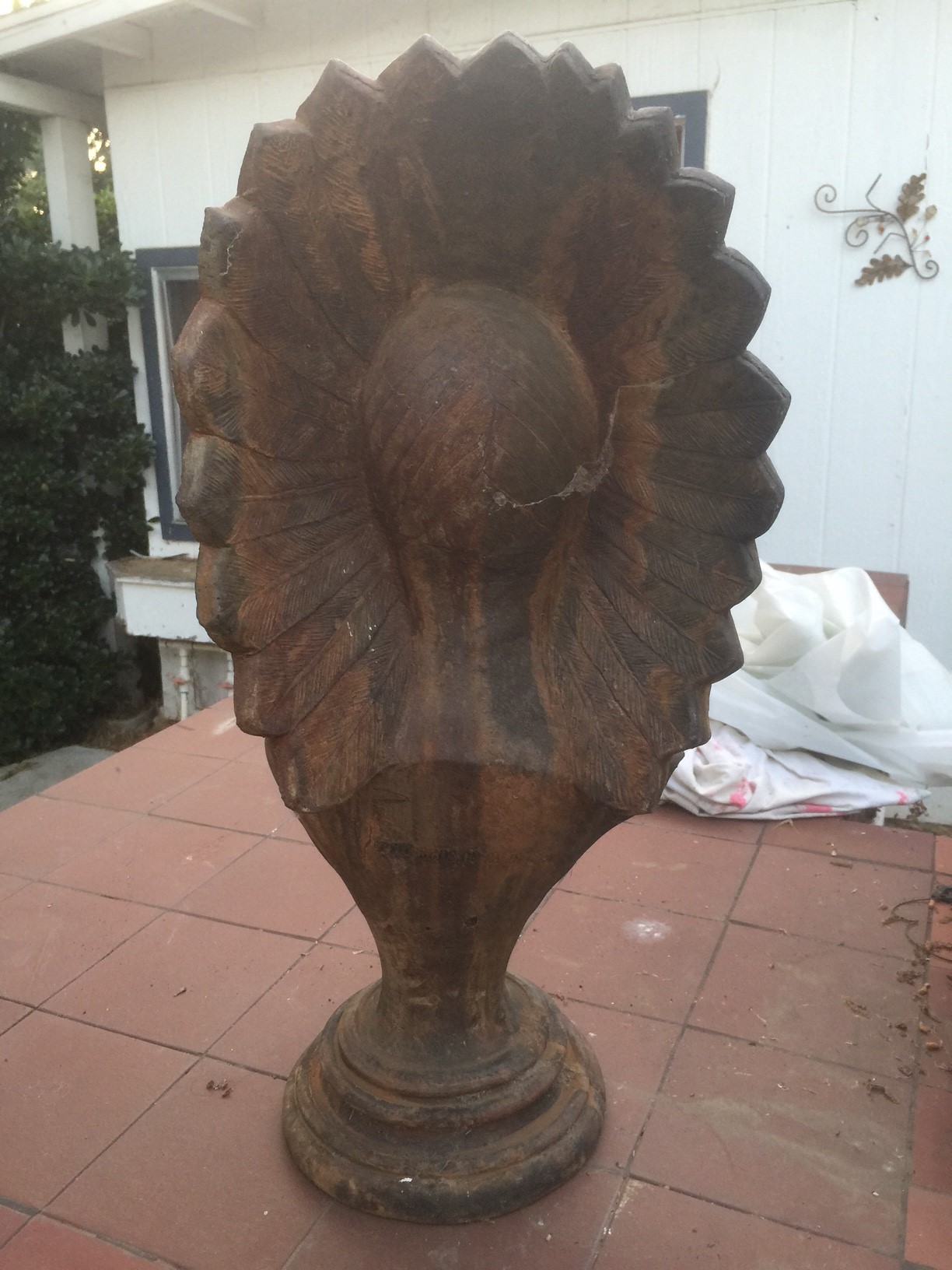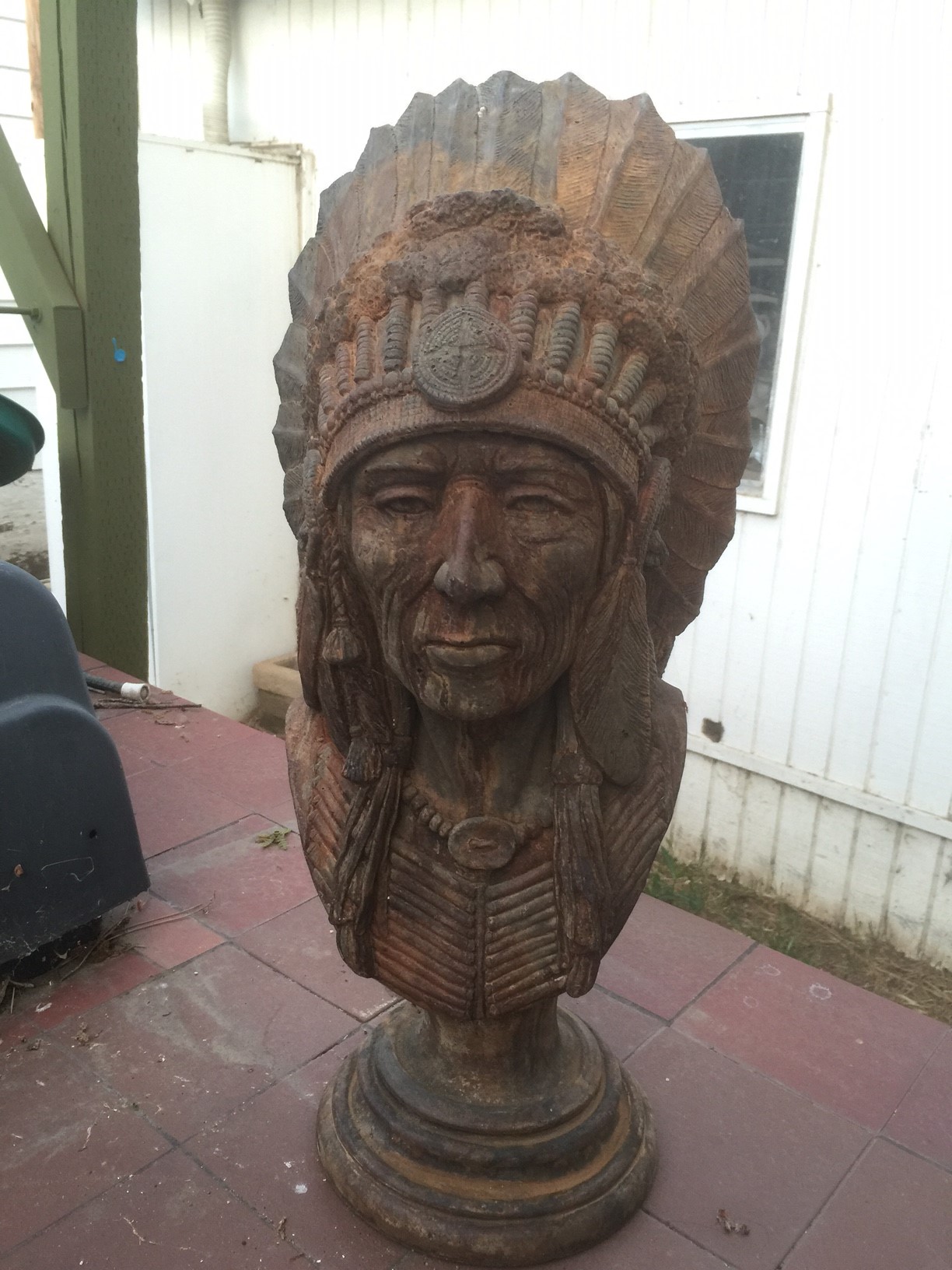 The piece is made of plaster, there are several other examples on the Internet of these Indian busts. All the ones readily findable have been painted, I suspect this one was either never painted or left outside for some time. I did not find any record of actual sales but other people generally were asking $150-$200 with no takers.