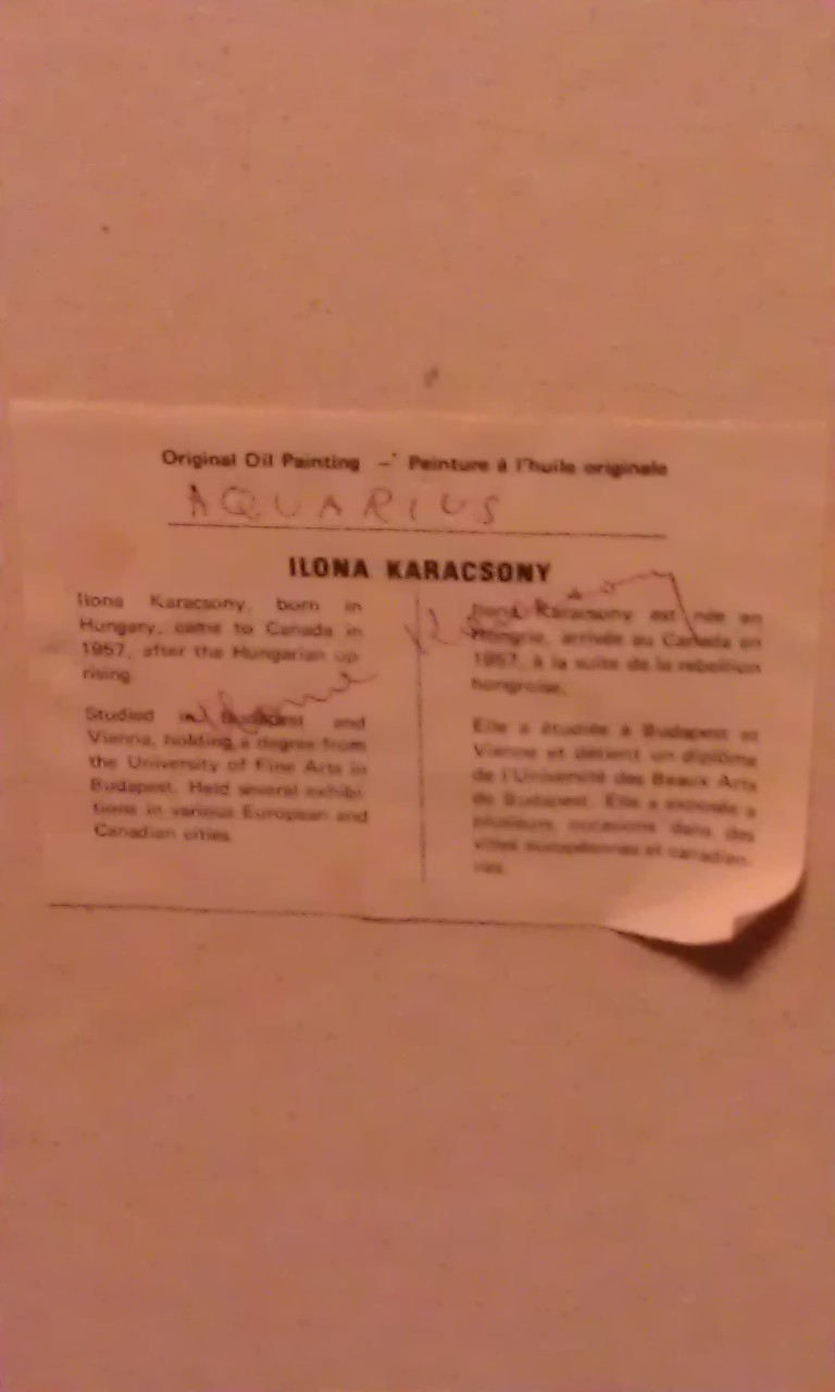 An old oil painting made by Ilona Karacsony, we do know her story, but we would like to know if it's worth anything, it's in mint condition. There is an original seal at the back of the painting. The name of the painting is aquarius !