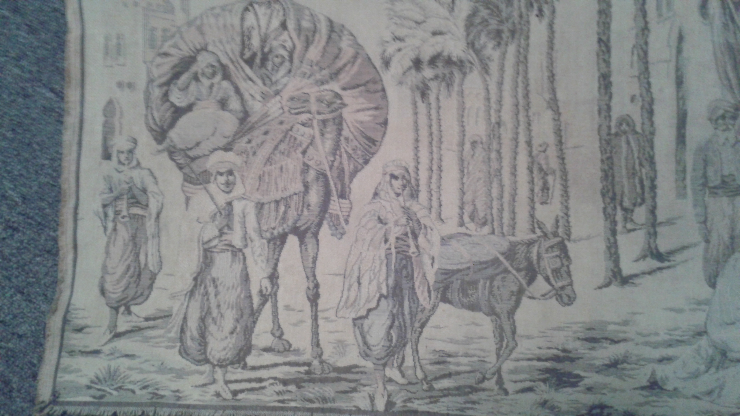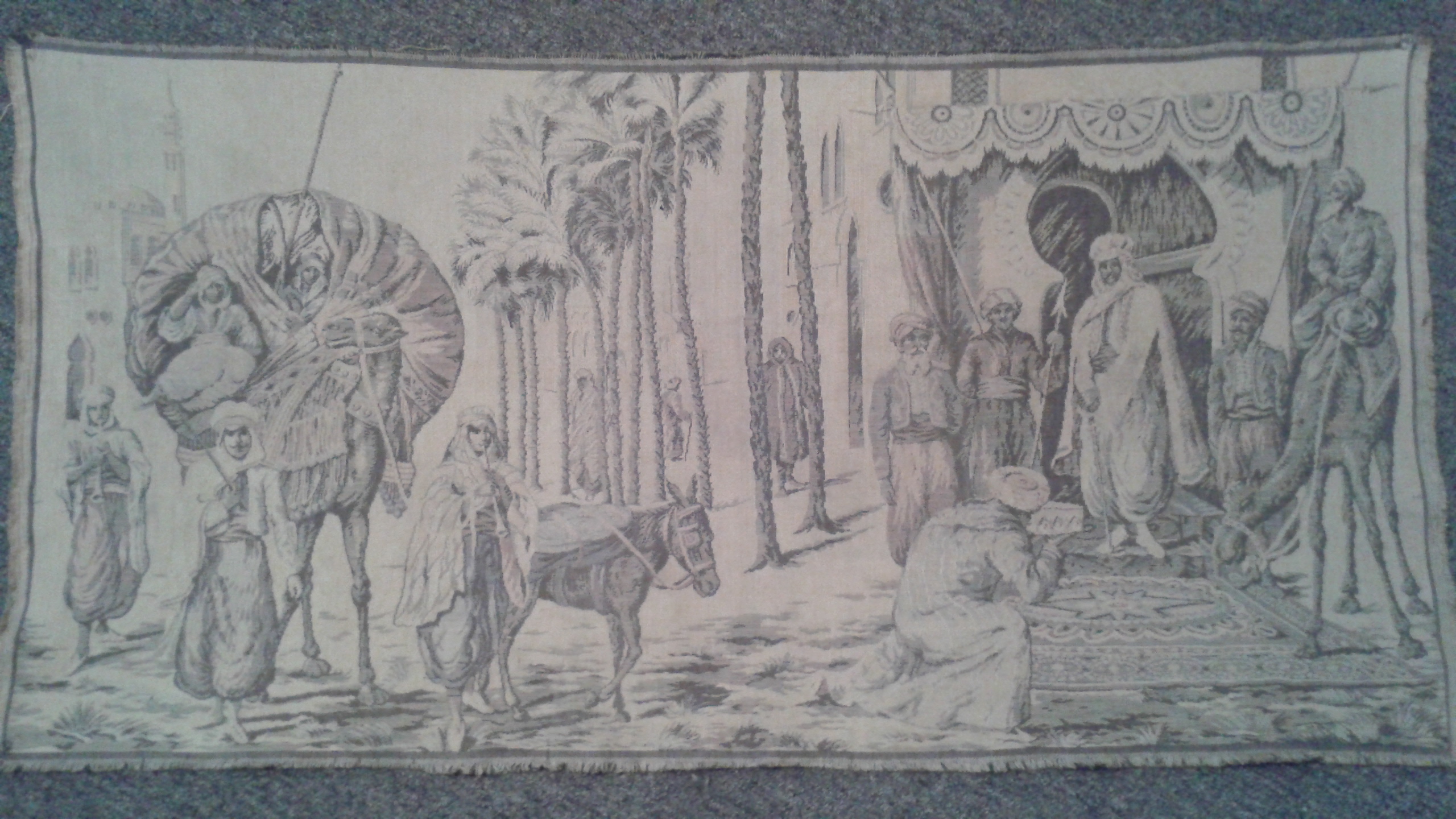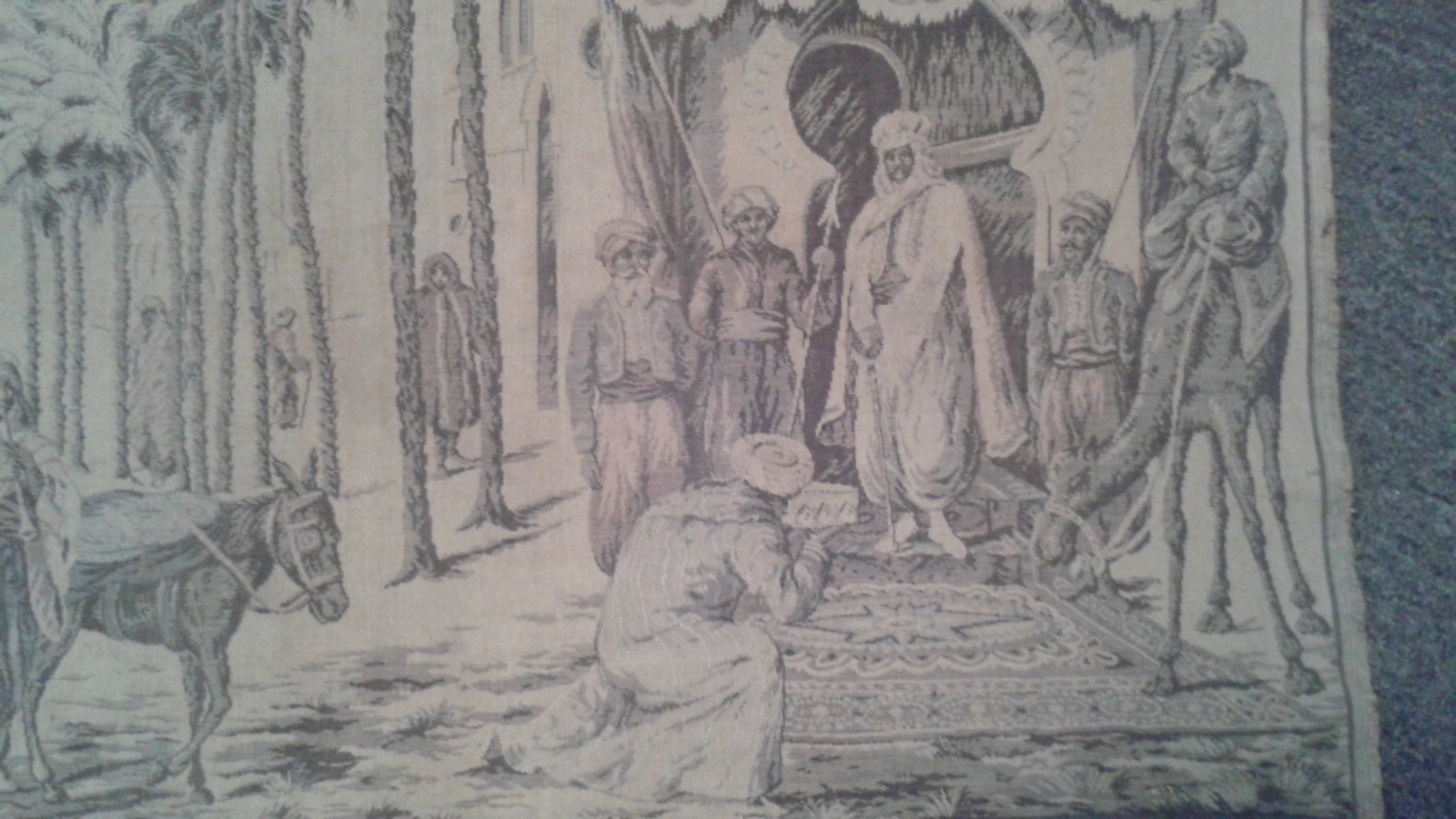 Arabian tapestry scene with a man paying homage to another with guards. Camels, including one with a large bundle and man riding on it. The two men walking beside the camel are playing musical instruments (flute?) A man leading a donkey, miscellaneous men in background and palm trees.