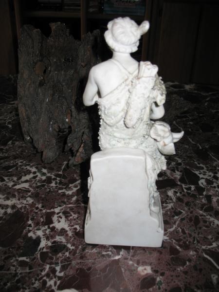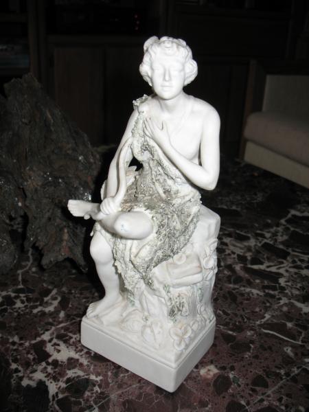 A young archer resting on a stone, with his kill a large bird on his left hip. Left hand to the right upper side of his chest. In his right hand is a bow resting on his lap, his quiver on the right side of his back a feather in his hair and a ban around his head.