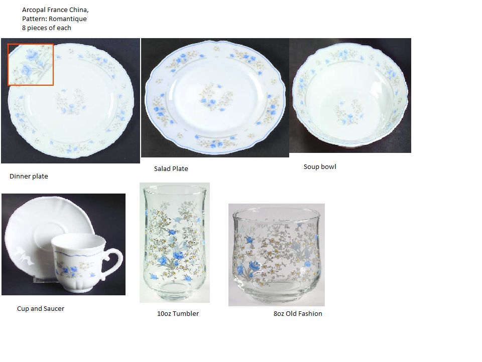 Arcopal France China, Pattern: Romantique. 5pc dinner service for eight along with (8) 8oz old fashion glasses and (8) 10oz tumblers.